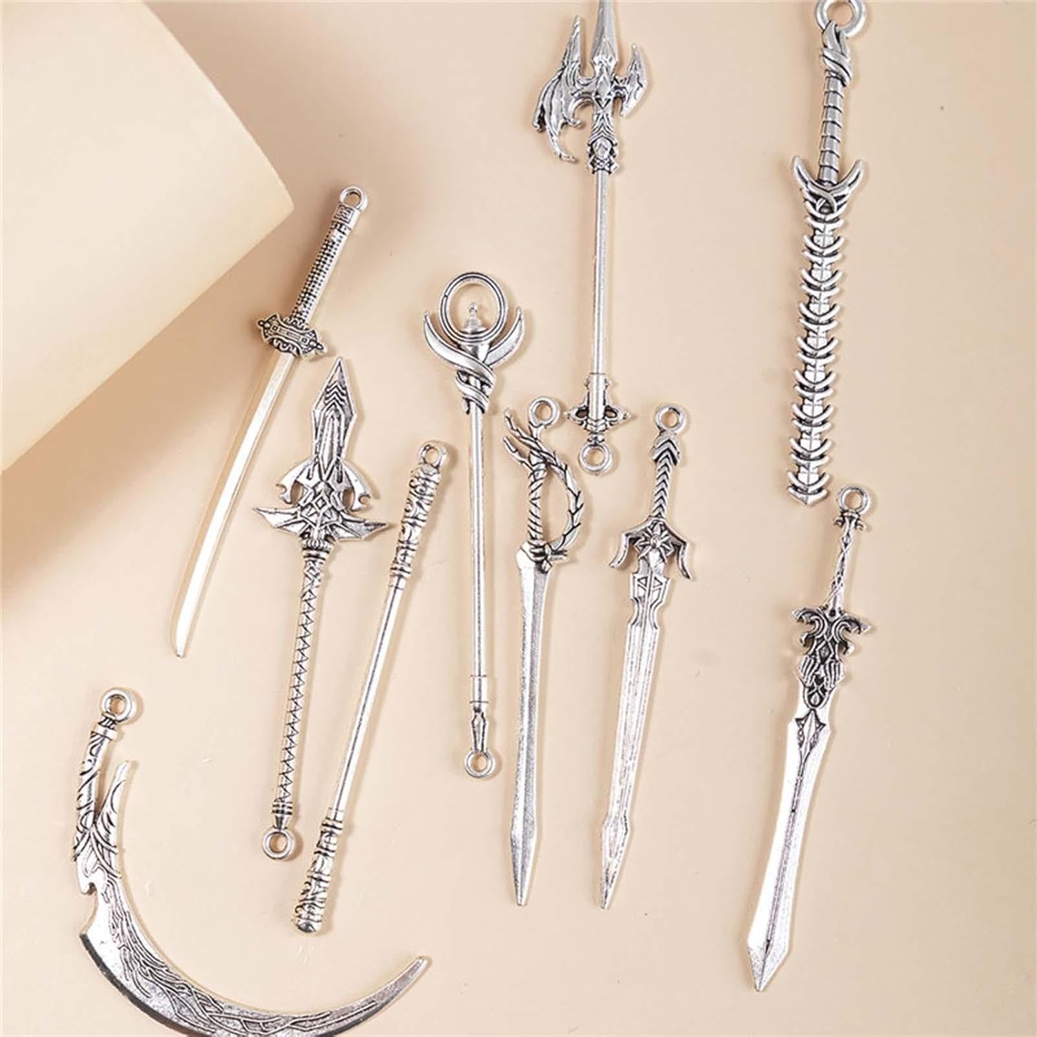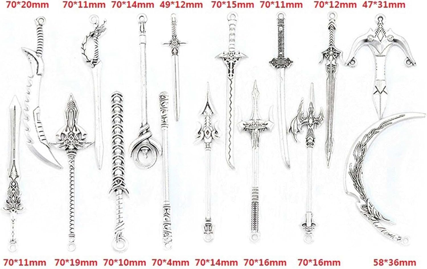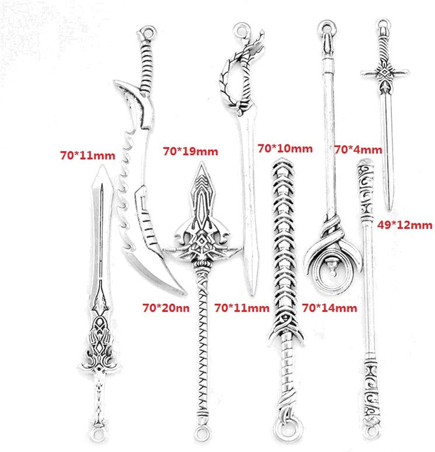 【Confezione】10 pezzi di splendidi pendenti con spada. 【Design】 Di piccole dimensioni e leggero, può essere utilizzato anche come portachiavi, retrò e classico. 【Materiale】 Il giocattolo decorativo con spada è realizzato in materiale in lega ed è durevole. 【Regalo】 Questo giocattolo con spada retrò è regalo per ne ha bisogno. 【Uso】 Gli ornamenti antichi per spade possono essere utilizzati per decorare oggetti di scena per foto di case delle bambole, collane di gioielli fai-da-te e braccialetti per realizzare ornamenti per spade e materiali artigianali.