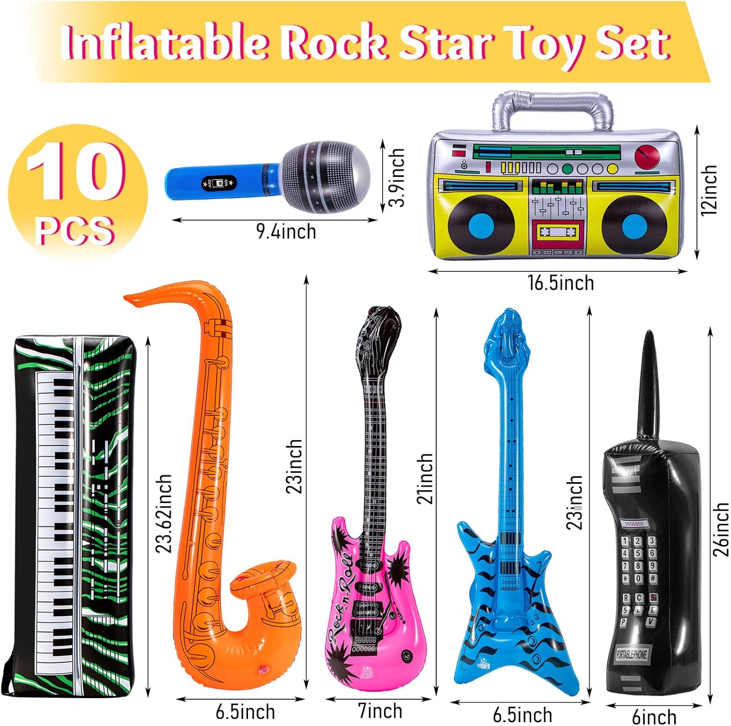 Contenuto della confezione: I nostri strumenti gonfiabili da rock star includono 1 sassofono gonfiabile, 1 pianoforte gonfiabile, 1 cellulare gonfiabile, 1 chitarra gonfiabile, 1 basso gonfiabile, 2 microfoni gonfiabili, 3 paia di occhiali da sole (colori casuali) e 1 boombox gonfiabile. Sono un'aggiunta fantastica a qualsiasi evento a tema artistico e sono ideali per decorare feste in stile anni '80 o '90. Materiale di alta qualità: gli strumenti gonfiabili Rockstar sono realizzati in resistente materiale PVC e presentano una stampa vivace che è impermeabile, leggera e robusta. Sono riutilizzabili e facili da svuotare per riporli comodamente, garantendo una lunga durata. Facile da usare: questi strumenti gonfiabili Rockstar sono dotati di una valvola rapida che ti consente di configurarli in pochi minuti. Sono facili da gonfiare e sgonfiare e possono essere ripiegati nella borsa quando non vengono utilizzati. Accattivante: i nostri strumenti gonfiabili presentano un design classico di strumenti musicali con motivi e colori accattivanti che ne esaltano il fascino vintage. Questo oggetto cosplay imita veri strumenti a corda e aggiunge ulteriore autenticità agli eventi karaoke. Ideale per ogni occasione: i nostri strumenti gonfiabili creano un'atmosfera festosa alla tua festa. Sono adatti per vari eventi tra cui Ringraziamento, Halloween, Natale, feste di compleanno, festival musicali, eventi musicali, serate karaoke e molto altro.