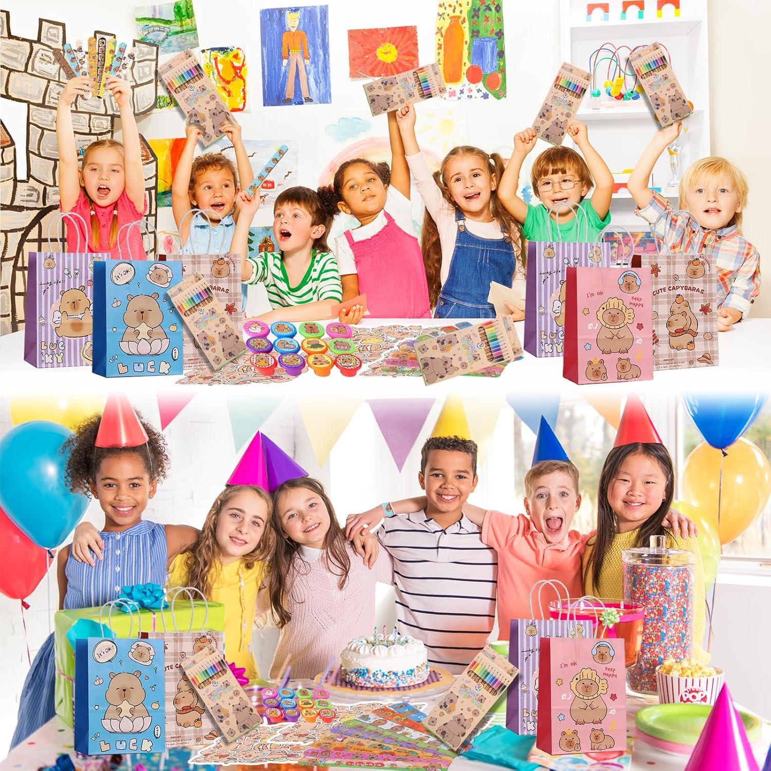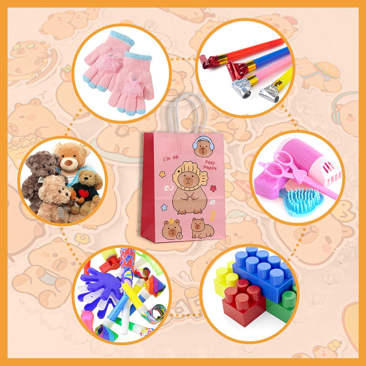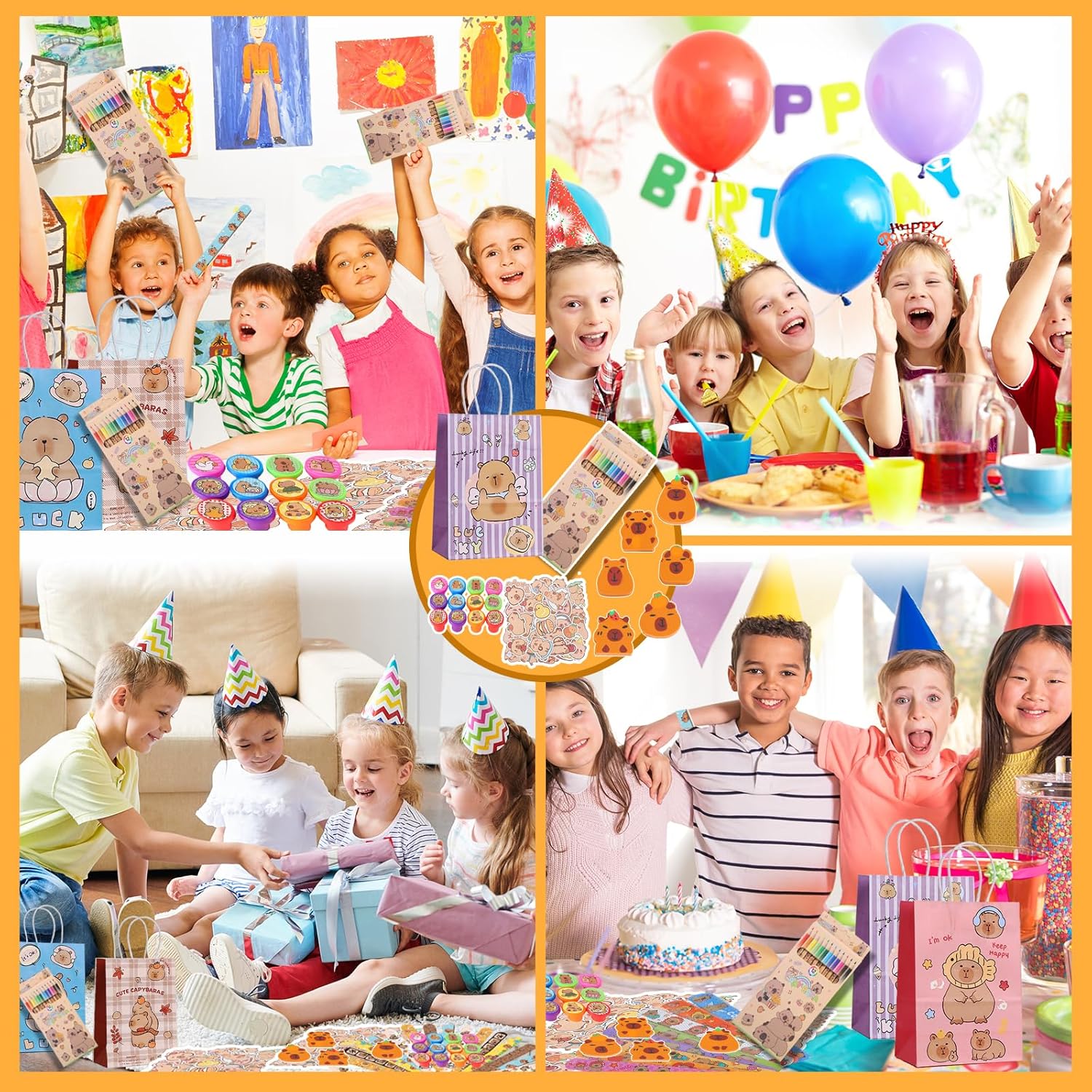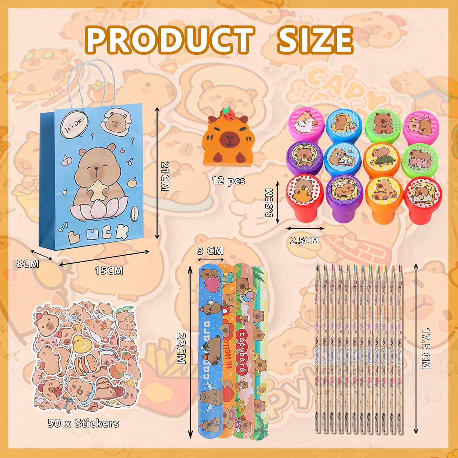 Set di regalini Capybara: questo set di 110 pezzi Capybara per feste di compleanno per bambini contiene tutto ciò di cui hai bisogno per una festa di compleanno per bambini di successo. Capybara Party Mitgebsel Con 12 sacchetti regalo, 12 matite colorate, 12 braccialetti Slap, 12 pratici timbri, 12 gomme per cancellare Capybara e 50 simpatici adesivi Capybara, ogni festa sarà un punto forte Alta qualità: i nostri kit di accessori per feste Capybara scelgono rigorosamente materiali di alta qualità. Adesivi Capybara, i sacchetti regalo sono realizzati in carta spessa di alta qualità, con colori vivaci. Il bracciale Capybara può essere indossato solo con un leggero colpo al polso ed essere durevole. Le borse regalo Capybara sono ampiamente utilizzate, resistenti e non hanno un odore pungente. Questo regalo per bambini può essere riutilizzato Design raffinato: gli accessori decorativi per feste di compleanno con il tema Capybara, la moda colorata e il simpatico kapibara sono molto popolari tra i bambini, per aggiungere un paio di punti salienti al vostro evento di festa Borsa regalo a tema Capybara: puoi mettere caramelle, cioccolato, snack, bracciali, portachiavi, adesivi, ecc. nella busta regalo per trasformarli in una scatola cieca a sorpresa, e tornare a casa alla fine della festa con il sacchetto regalo pieno di regali, sarà la festa più indimenticabile per i bambini Regalo perfetto: sorprendi i tuoi piccoli ospiti con questi regali unici! Sia come ringraziamento per gli ospiti di compleanno o come piccola sorpresa, questo set garantisce volti luminosi e momenti indimenticabili. Rendi ogni festa un'esperienza speciale con questo affascinante regalo Capybara