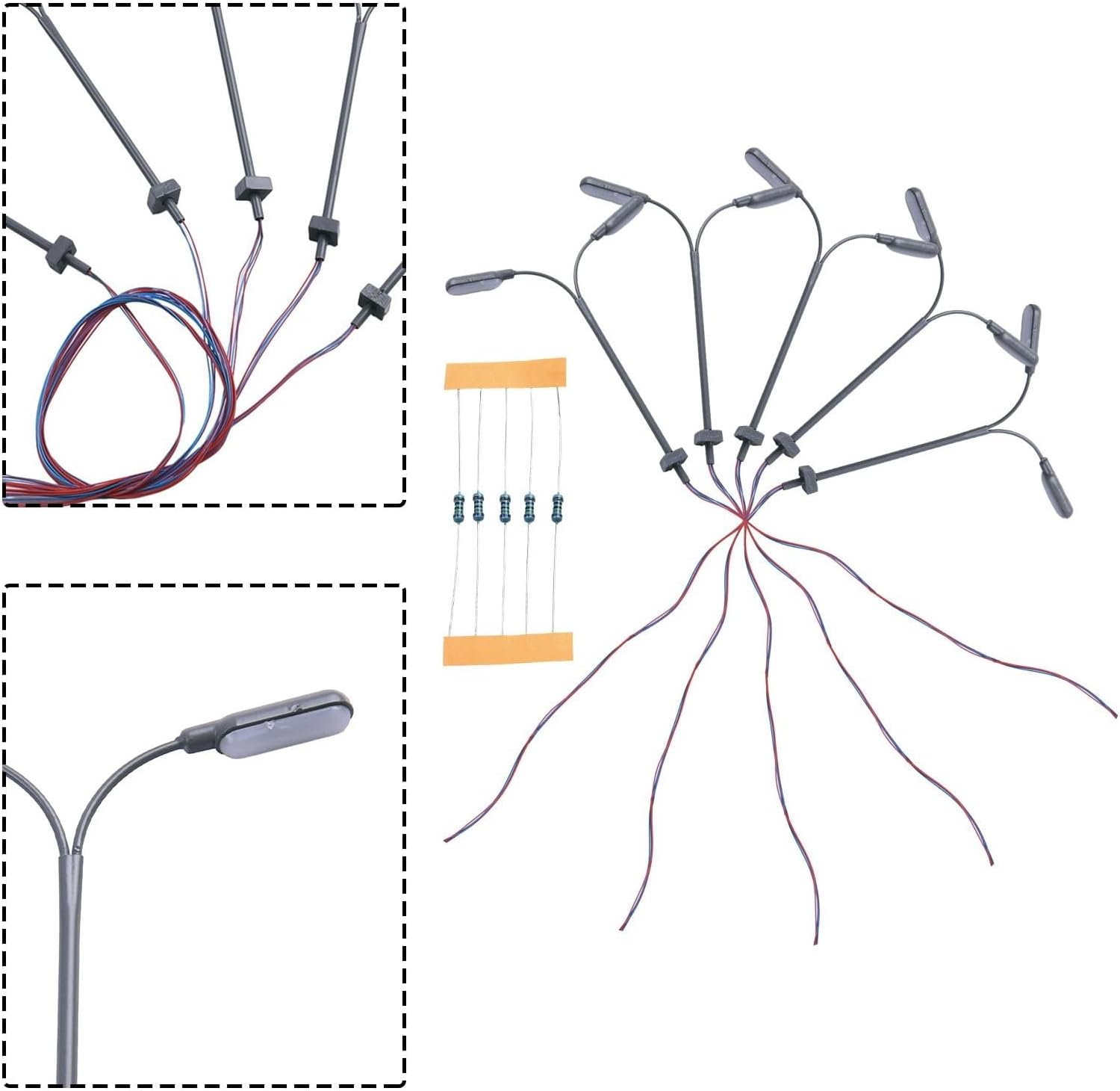 Calibro lampione a LED N 1:160: il modello di luce della piattaforma è composto da 5 lampioni a LED in scala N 1:160, perfetti per migliorare l'abbellimento del layout del tuo edificio. Requisiti di tensione 3 V: queste lampade a LED sono appositamente progettate per tensioni da 3 V. Si consiglia di non utilizzarli direttamente con 12 V o 16 V per evitare potenziali danni al LED. Corrente di funzionamento 20 mA: per garantire prestazioni ottimali, si consiglia di applicare una corrente di funzionamento corretta di 20 mA a ciascun LED. Ciò garantirà un'illuminazione stabile e uniforme. Include resistori in serie per connessione da 12 a 16 V: per coloro che utilizzano un trasformatore da 12-16 V, il nostro prodotto viene fornito con resistenze in serie che possono essere facilmente collegate per garantire la compatibilità e prevenire eventuali problemi legati alla tensione. Struttura tubolare in acciaio: il modello di luce a piattaforma è realizzato con tubi in acciaio, garantendo durata e longevità. Ogni lampada viene fornita con un paralume per una maggiore autenticità e fascino visivo.