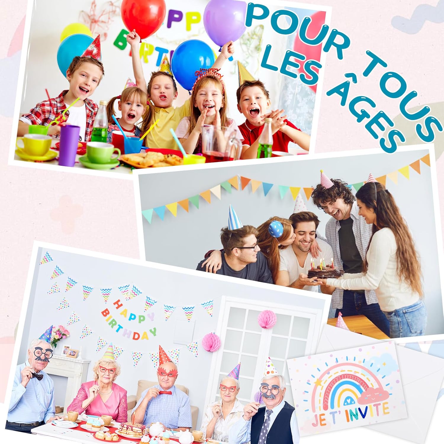 Contenuto della confezione: 12 biglietti d'invito a tema arcobaleno, che contiene anche 12 buste rosa e 12 adesivi di chiusura rotonda. Questo set è ideale per piccoli e grandi compleanni, invita tutti gli amici di tuo figlio a condividere questa esperienza unica 【Facile personalizzazione】--Ogni celebrazione inizia con un invito, pre-compilato in francese. La personalizzazione di ogni invito consiste nell'aggiungere i dettagli specifici della festa, come data, ora e luogo. Questa personalizzazione rende ogni invito unico e prezioso, creando un'esperienza unica per ogni ospite; 【Semplice e veloce】-Risparmiate tempo e fastidio di creare bellissimi biglietti di compleanno colorati con i nostri biglietti di invito progettati per i compleanni dei bambini. Riceverete 12 biglietti di invito A6 pronti all'uso con buste autoadesive. Basta etichettarli e distribuirli ai tuoi ospiti; 【Invitate interesse】--Questo biglietto d'invito per un compleanno di una ragazza susciterà interesse e curiosità. Questo prodotto è presentato in confezione originale. Con il suo design innovativo, porterà un tocco di novità al suo compleanno, finito gli inviti classici, i piccoli ospiti desidereranno di trascorrere del tempo insieme e la festa avrà successo. Crea ricordi indimenticabili: questo kit è più di un semplice invito. Crea ricordi indimenticabili