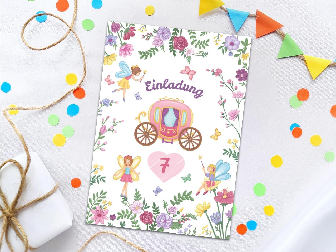 12 biglietti d'invito per il 7° compleanno dei bambini, motivo: fate, principessa, invito, settimo compleanno