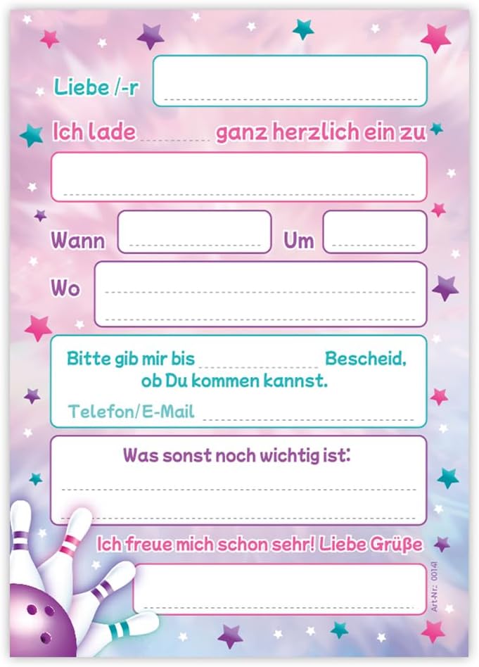 Contenuto: 12 biglietti d'invito Pratico: gli inviti sono moderni e progettati con molti dettagli. Sul retro troverete i campi prestampati da compilare. Dimensioni: i biglietti d'invito sono molto stabili, hanno formato DIN A6 (10,50 cm x 14,80 cm), stampa di alta qualità 300 g/m² e sono rivestiti con vernice UV per la finitura. Occasioni: i biglietti di invito sono molto adatti per una festa di compleanno o una festa di compleanno. È possibile utilizzare questi biglietti anche come inviti per battesimo, festa a tema, feste al cinema o feste in piscina. HAI BISOGNO DI UN ALTRO NUMERO? : da noi troverete questi graziosi inviti anche in set da 6, 8 o 10 pezzi. Altri motivi: nel nostro negozio troverete anche molti altri motivi di inviti, come lama, cavalli, calcio, cinema, piscina, bowling, salto. Prodotto in Germania: i biglietti sono stati prodotti in una tipografia tedesca.