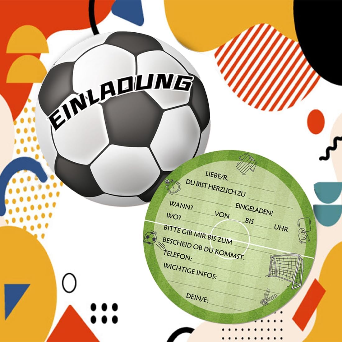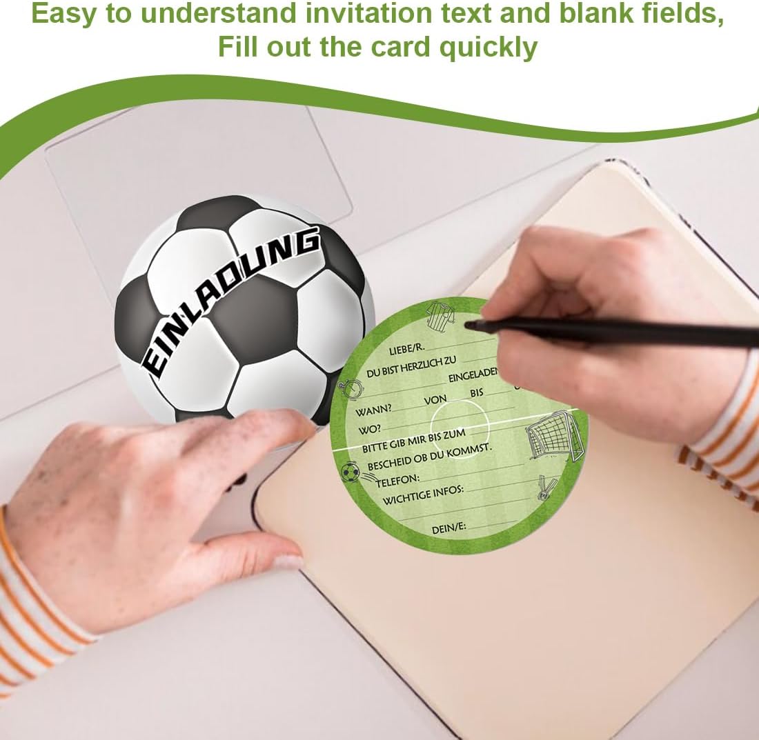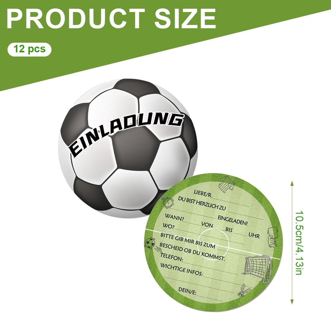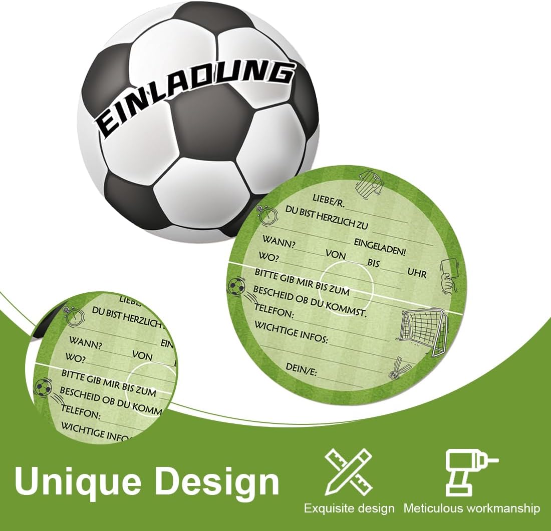 Value Set: il pacchetto include 12 inviti a tema calcio. Materiale di alta qualità: realizzato in cartone spesso di alta qualità, stampa su entrambi i lati, bei motivi, non sbiadisce. Compilazione rapida: il testo dell'invito è facile da capire e il biglietto si compila rapidamente. Dimensioni del prodotto: l'invito ha un diametro di circa 15 cm e può contenere tutte le informazioni importanti e può essere scritto con tutte le penne standard. Multiuso: che si tratti di un compleanno per bambini, feste in giardino, festa dei bambini, feste a tema o feste estive, questi biglietti sono perfetti per invitare gli amici alla festa.