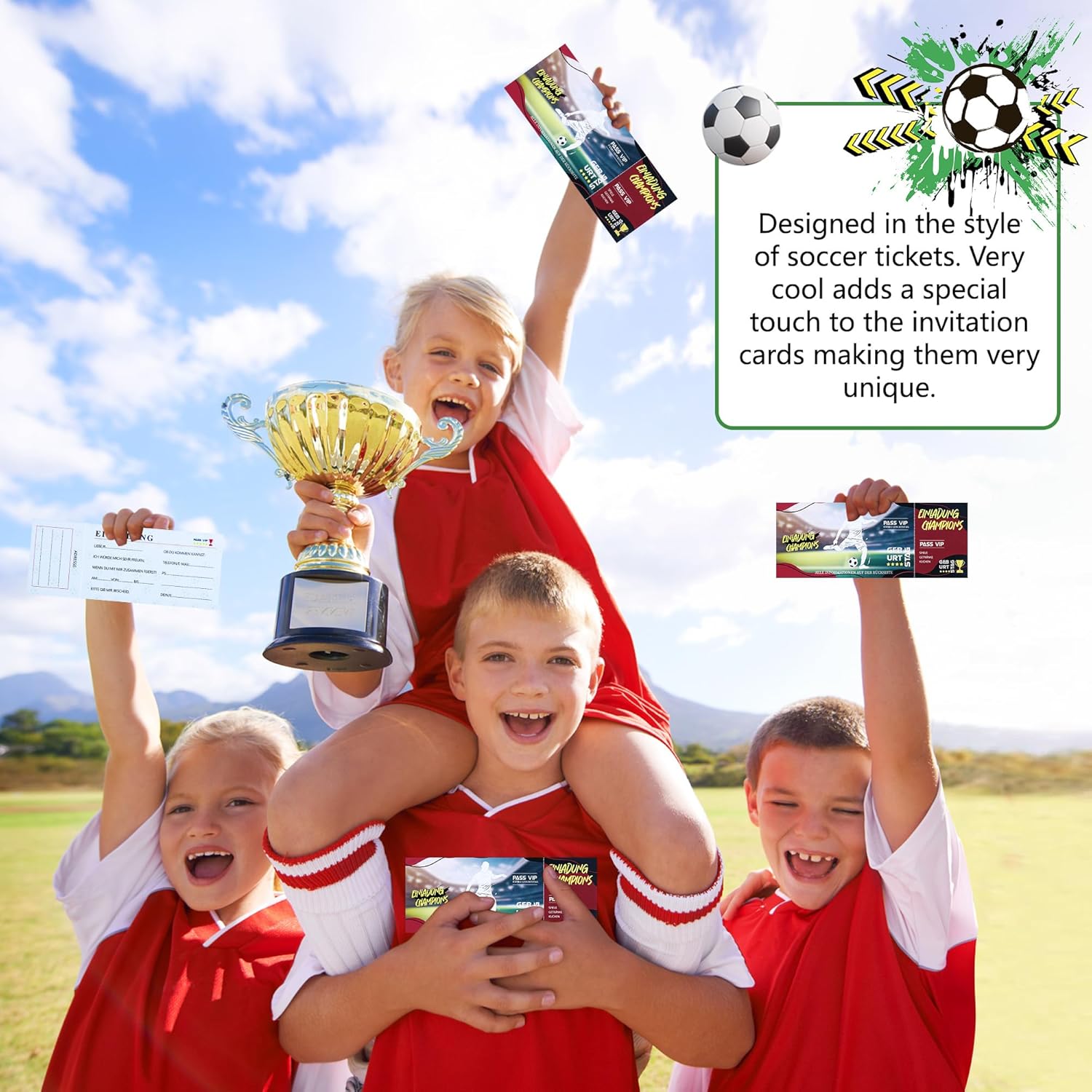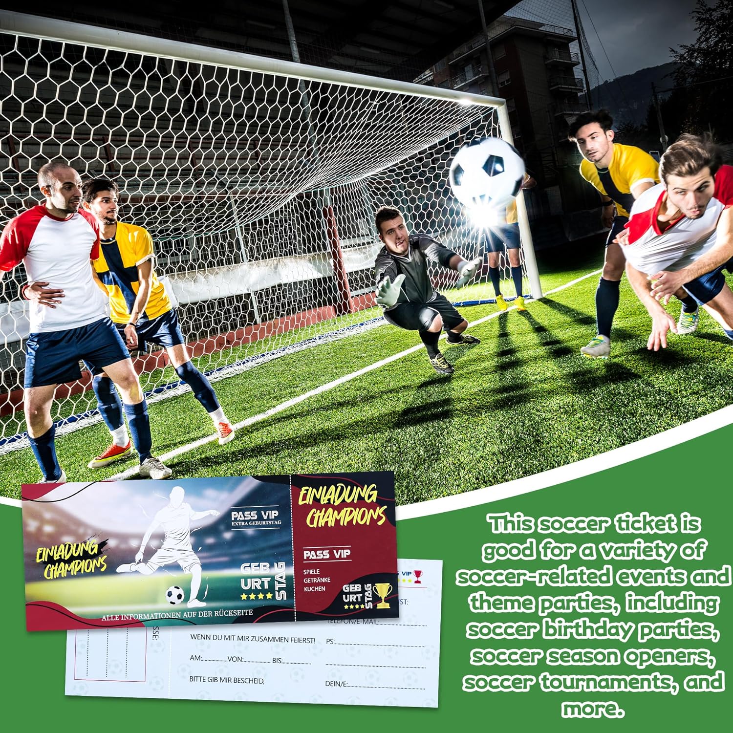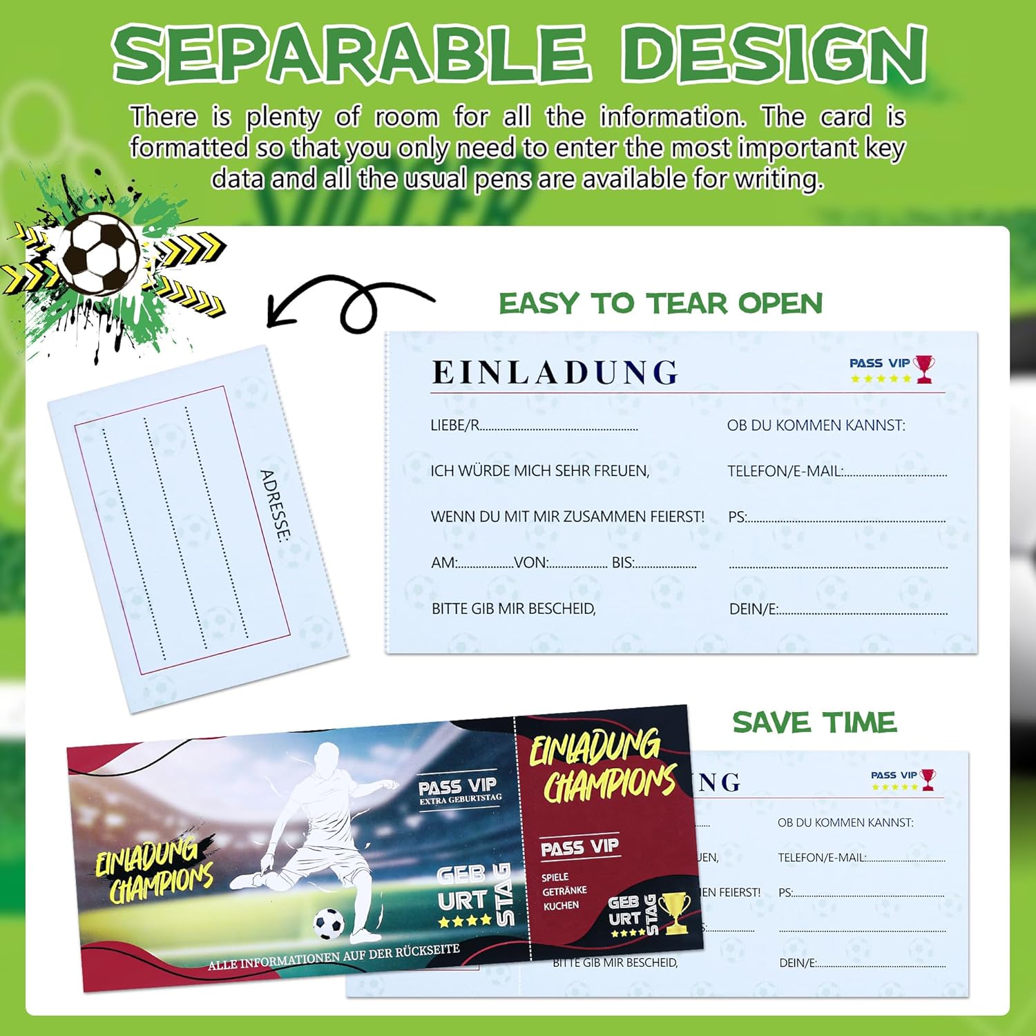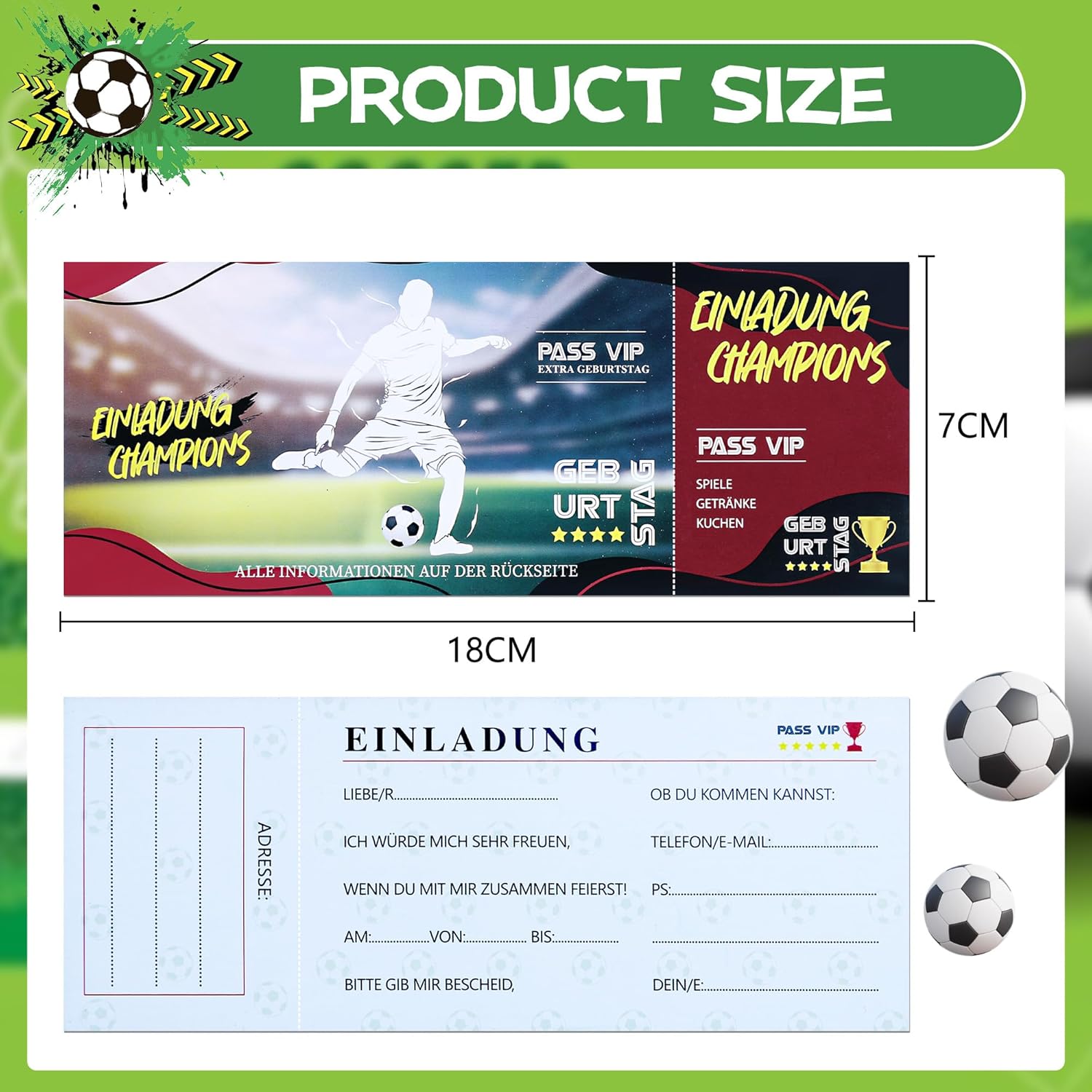 12 biglietti d'invito Cool Soccer Kids Birthday Party sono realizzati in carta di alta qualità, robusti e durevoli, con stampa offset di qualità. Ogni biglietto ha un design incantevole che sicuramente delizierà i piccoli appassionati di calcio. Design unico: il nostro biglietto d'invito è progettato nello stile di un biglietto di calcio. È stata creata con elementi personalizzati simili ai veri biglietti da calcio. Questa non è solo una rappresentazione della tua festa di compleanno, ma anche un biglietto per una festa di calcio unica! Perfetti per gli amanti del calcio: questi biglietti d'invito sono più di semplici biglietti d'ingresso per emozionanti avventure calcistiche. I colori vivaci e le illustrazioni divertenti si rivolgono sia a bambini che a genitori. Lascia che i tuoi inviti riflettano l'amore per il gioco e la gioia di festeggiare con gli amici! Facile da compilare: con molto spazio per scrivere un messaggio personale su ogni biglietto, è possibile personalizzare facilmente ogni biglietto. Invita i tuoi amici a una festa divertente e vedrai i loro occhi brillare quando riceveranno il loro invito unico! Ampia applicazione: i nostri biglietti d'invito per biglietti da calcio per bambini sono ideali per diversi eventi legati al calcio e feste a tema, tra cui feste di calcio, aperture stagionali di calcio, feste di compleanno e eventi di calcio, organizzati da scuole e associazioni.