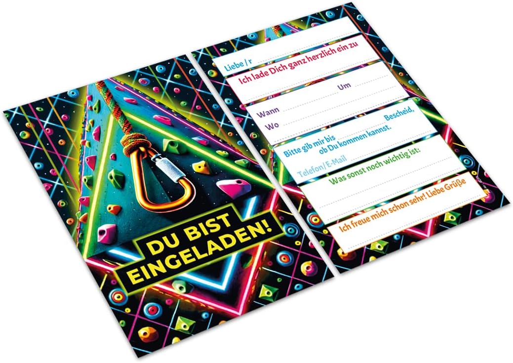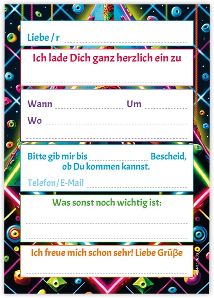 Contenuto: 12 biglietti d'invito Pratico: gli inviti sono moderni e progettati con molti dettagli. Sul retro troverete i campi prestampati da compilare. Dimensioni: i biglietti d'invito sono molto stabili, hanno formato DIN A6 (10,50 cm x 14,80 cm), stampa di alta qualità 300 g/m² e sono rivestiti con vernice UV per la finitura. Occasioni: i biglietti di invito sono ideali per feste di compleanno. HAI BISOGNO DI UN ALTRO NUMERO? : nelle varianti troverete questi graziosi inviti anche in set da 6, 8 o 10 pezzi. Altri motivi: nel nostro negozio troverete anche molti altri motivi di inviti, come lama, cavalli, calcio, cinema laser, bowling, jump. Prodotto in Germania: i biglietti sono stati prodotti in una tipografia tedesca.