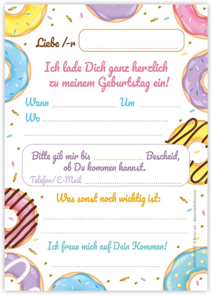 Contenuto: 12 biglietti d'invito Pratico: gli inviti sono moderni e progettati con molti dettagli. Sul retro troverete i campi prestampati da compilare. Dimensioni: i biglietti d'invito sono molto stabili, hanno formato DIN A6 (10,50 cm x 14,80 cm), stampa di alta qualità 300 g/m² e sono rivestiti con vernice UV per la finitura. Occasioni: i biglietti di invito sono molto adatti per una festa di compleanno o una festa di compleanno. HAI BISOGNO DI UN ALTRO NUMERO? : da noi troverete questi graziosi inviti anche in set da 6, 8 o 10 pezzi. Altri motivi: nel nostro negozio troverete anche molti altri motivi di inviti, come lama, cavallo, calcio, cinema, piscina, bowling, salto. Prodotto in Germania: i biglietti sono stati prodotti in una tipografia tedesca.