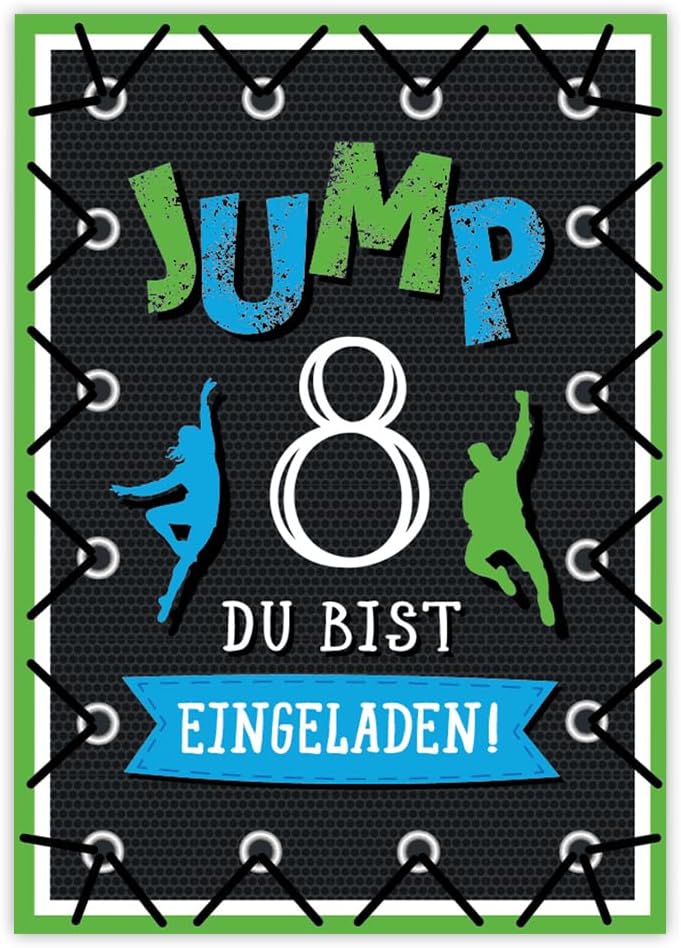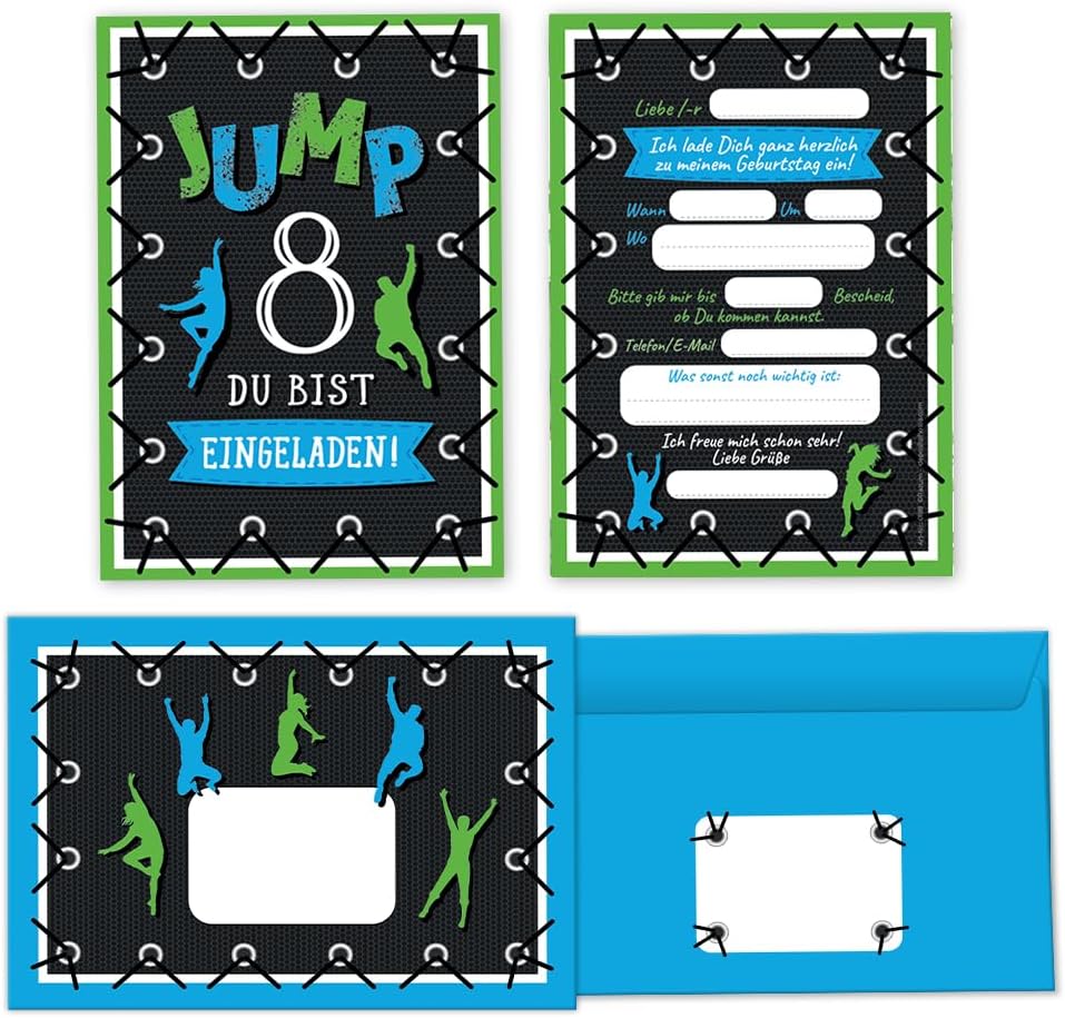 12 biglietti d'invito per l'8° compleanno dei bambini, per ragazzi, ragazze, trampolino d'invito per l'8° compleanno, con 12 buste, 12 sacchetti per feste, colore naturale, 12 adesivi