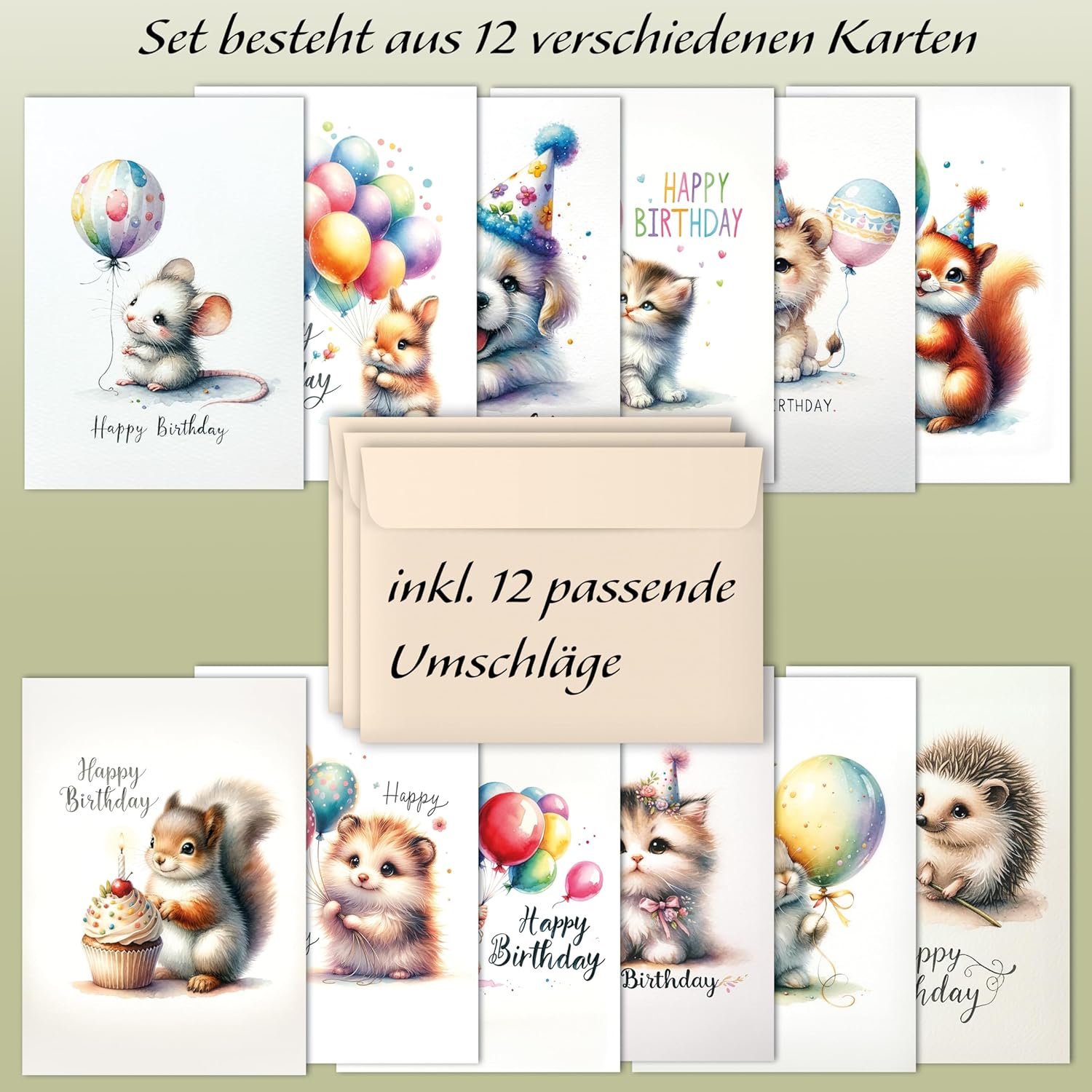 Biglietti d'auguri: questo set è composto da 12 cartoline con 12 buste. Design: questo set di compleanno unico è composto da 12 design di animali moderni, divertenti e carini adatti a tutte le età, adulti, uomini, donne, bambini, ragazze e ragazzi. Le buste sono beige. Formato: formato cartolina A6 10,5 x 14,8 cm Made in Germany: le nostre carte sono prodotte esclusivamente in Germania. Le carte sono molto resistenti e stabili, stampate su cartoncino cromato di alta qualità con vernice lucida, che le rende molto eleganti. Regala la gioia: compiace i tuoi cari. Un biglietto d'auguri è un gesto adorabile che rende ogni regalo un po' più personale.