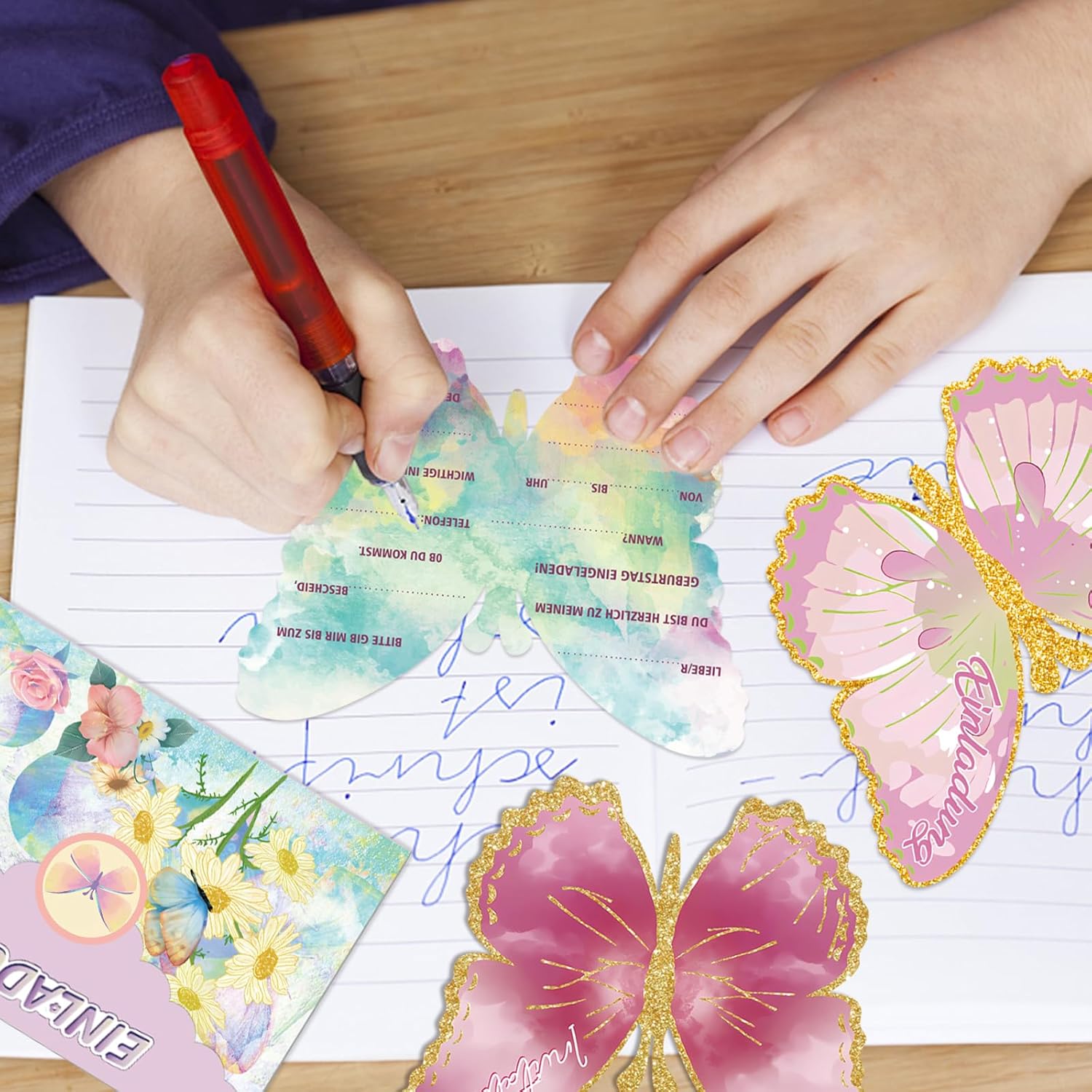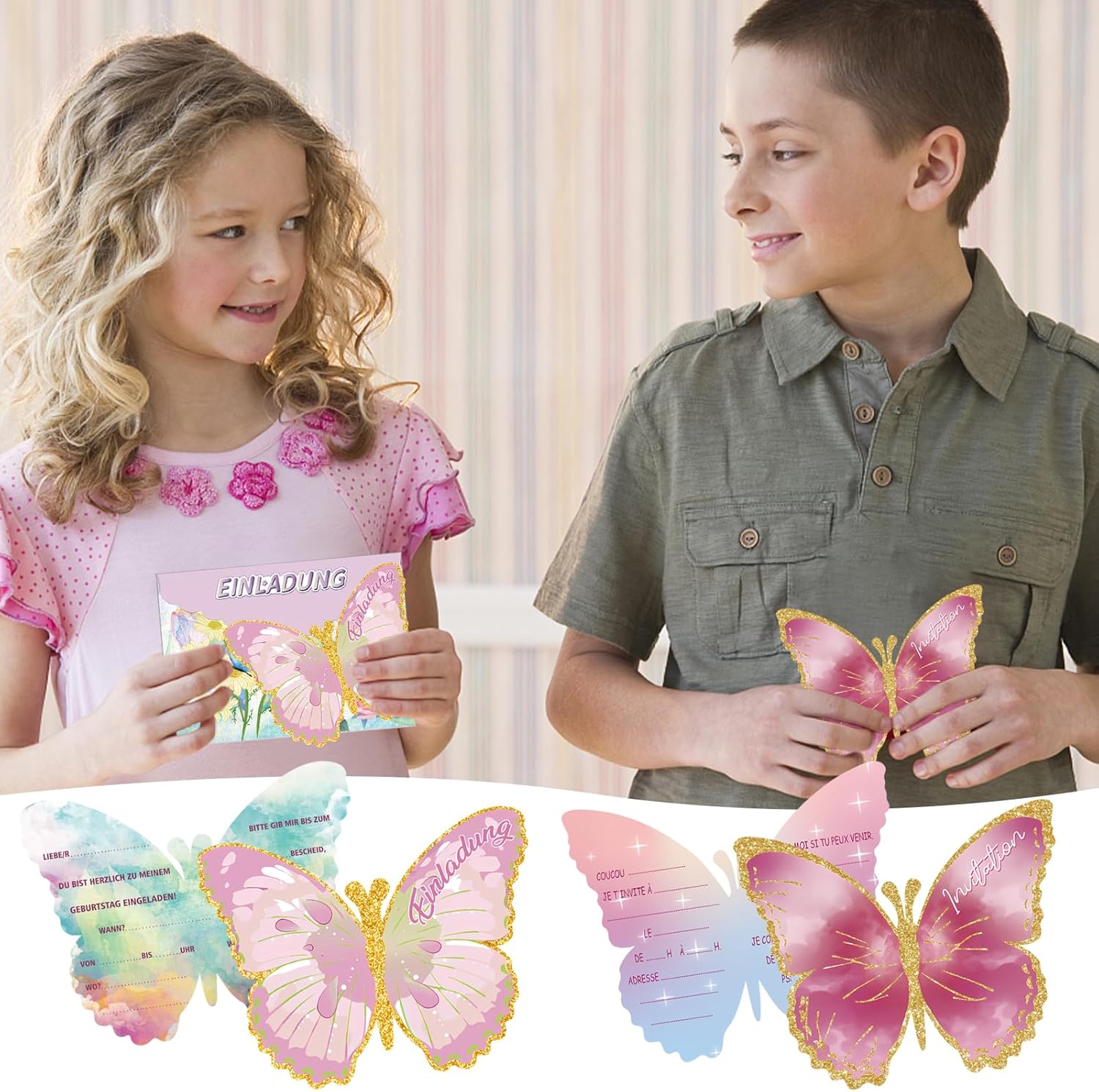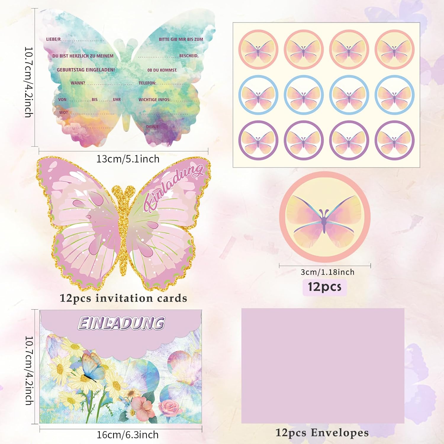 Set di biglietti di invito a farfalla: con questo set unico riceverete 12 splendidi biglietti di invito, 12 buste e 12 incantevoli adesivi. Materiali di alta qualità: i biglietti d'invito sono realizzati in carta di alta qualità e si distinguono per la loro alta qualità e l'aspetto estetico. Ogni biglietto è decorato con un incantevole motivo a farfalla che simboleggia eleganza e bellezza. Materiali di alta qualità: il biglietto di invito per feste a farfalla offre la possibilità di trasmettere i vostri inviti con stile e autenticità. Design a forma di farfalla: biglietto di invito per festa a farfalla, biglietti di invito per feste di compleanno per bambini. Che si tratti di matrimoni, compleanni o altre occasioni speciali, questi biglietti di invito a farfalla stupiranno i tuoi ospiti con la loro eleganza semplice e il loro design affascinante. Adatto per diverse occasioni: che si tratti di un compleanno per bambini, una festa in giardino o un'altra festa festiva, questi inviti a farfalla si adattano perfettamente a diverse occasioni.