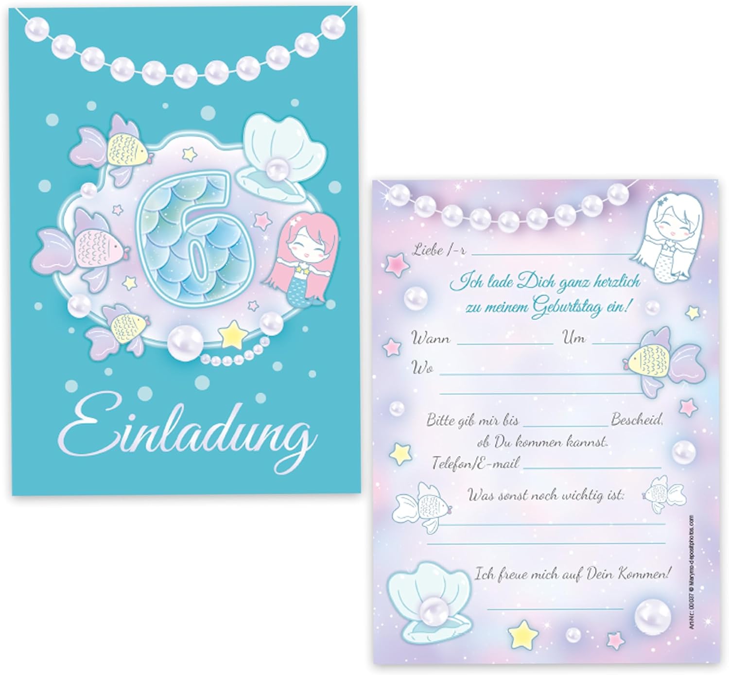 12 biglietti di invito, incl. 12 buste per il 6° compleanno dei bambini, invito per compleanno, ragazza, sirena, sirena, sirena, perle turchesi