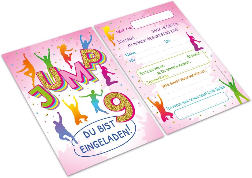 Contenuto: 12 biglietti d'invito + 12 buste Pratico: gli inviti sono moderni e progettati con molti dettagli. Sul retro troverete i campi prestampati da compilare. Biglietti: i biglietti d'invito sono molto robusti, hanno formato A6 (10,50 cm x 14,80 cm), stampa di alta qualità 300 g/m e sono rivestiti con vernice UV per la finitura. Buste autoadesive: la busta ha una dimensione di 11,40 cm x 16,20 cm, stampa da 80 g/m ed è adesiva (con striscia adesiva). Occasioni: i biglietti di invito sono molto adatti per una festa di compleanno o una festa di compleanno. È possibile utilizzare questi biglietti anche come inviti per battesimi, feste a tema, feste al cinema o feste in piscina. HAI BISOGNO DI UN ALTRO NUMERO? : da noi troverete anche biglietti e buste in set da 6, 8 o 10 pezzi. Altri motivi: nel nostro negozio troverete anche molti altri motivi di inviti, come lama, cavalli, calcio, cinema, piscina, bowling, salto. Prodotto in Germania: i biglietti e le buste sono stati prodotti in una tipografia tedesca.