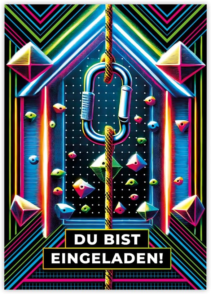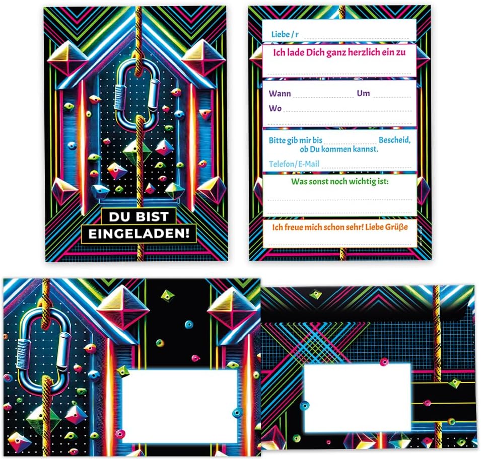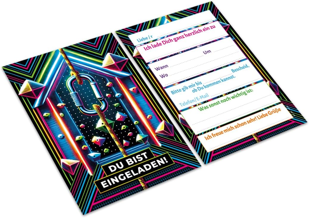 Contenuto: 12 biglietti d'invito + 12 buste Pratico: gli inviti sono moderni e progettati con molti dettagli. Sul retro troverete i campi prestampati da compilare. Biglietti: i biglietti d'invito sono molto robusti, hanno formato A6 (10,50 cm x 14,80 cm), stampa di alta qualità 300 g/m e sono rivestiti con vernice UV per la finitura. Buste autoadesive: la busta ha una dimensione di 11,40 cm x 16,20 cm, stampa da 80 g/m ed è adesiva (con striscia adesiva). Occasioni: i biglietti di invito sono ideali per feste di compleanno. HAI BISOGNO DI UN ALTRO NUMERO? : nelle varianti troverete questi graziosi inviti anche in set da 6, 8 o 10 pezzi. Altri motivi: nel nostro negozio troverete anche molti altri motivi di inviti, come lama, cavalli, calcio, cinema, piscina, bowling, salto. Prodotto in Germania: i biglietti e le buste sono stati prodotti in una tipografia tedesca.