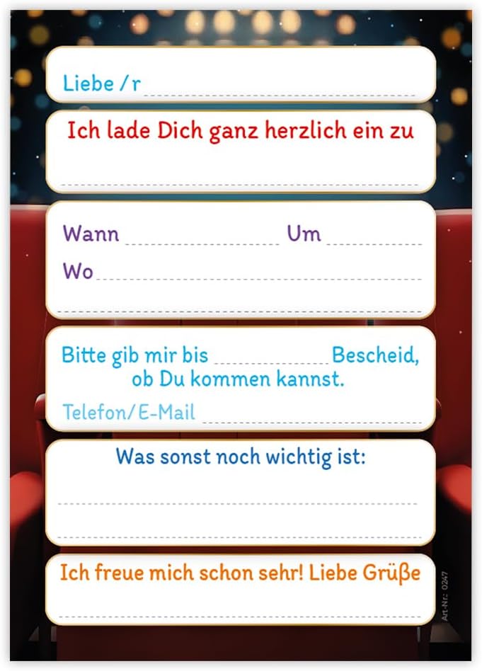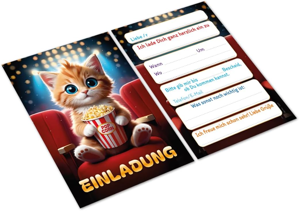 Contenuto: 12 biglietti d'invito Pratico: gli inviti sono moderni e progettati con molti dettagli. Sul retro troverete i campi prestampati da compilare. Dimensioni: i biglietti d'invito sono molto stabili, hanno formato DIN A6 (10,50 cm x 14,80 cm), stampa di alta qualità 300 g/m² e sono rivestiti con vernice UV per la finitura. Occasione: il set per feste è ideale per feste di compleanno. HAI BISOGNO DI UN ALTRO NUMERO? : da noi troverete questi graziosi inviti anche in set da 6, 8 o 10 pezzi. Altri motivi: nel nostro negozio troverete anche molti altri motivi di inviti, come lama, cavalli, calcio, cinema laser, bowling, jump. Prodotto in Germania: i biglietti sono stati prodotti in una tipografia tedesca.