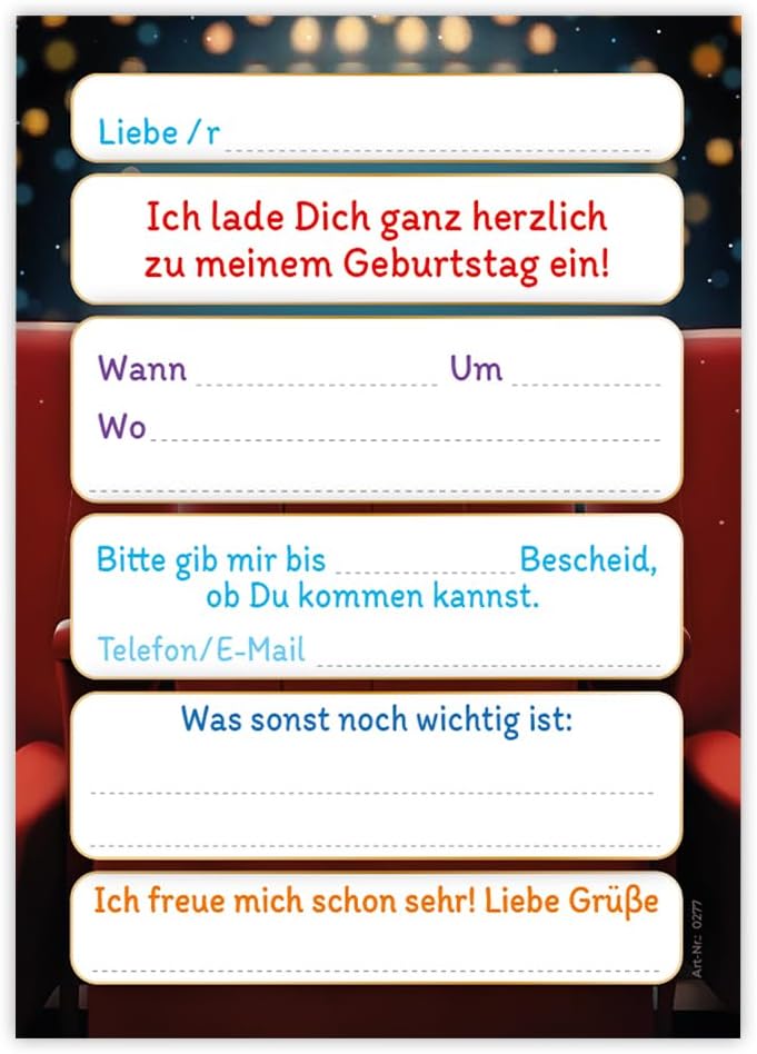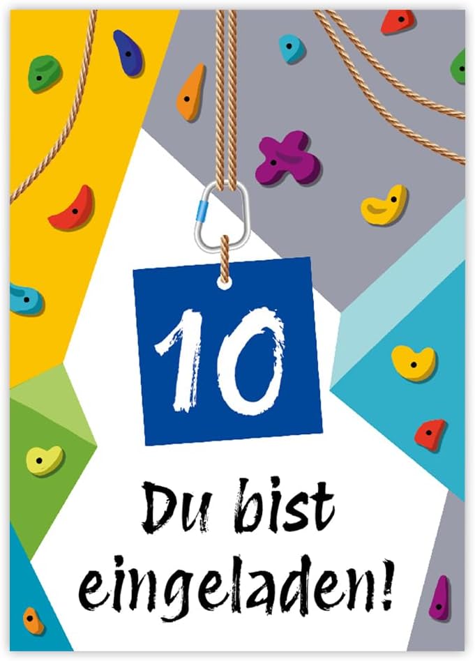 Contenuto: 12 biglietti d'invito Pratico: gli inviti sono moderni e progettati con molti dettagli. Sul retro troverete i campi prestampati da compilare. Dimensioni: i biglietti d'invito sono molto stabili, hanno formato DIN A6 (10,50 cm x 14,80 cm), stampa di alta qualità 300 g/m² e sono rivestiti con vernice UV per la finitura. Occasione: il set per feste è ideale per feste di compleanno. HAI BISOGNO DI UN ALTRO NUMERO? : da noi troverete questi graziosi inviti anche in set da 6, 8 o 10 pezzi. Altri motivi: nel nostro negozio troverete anche molti altri motivi di inviti, come lama, cavalli, calcio, cinema laser, bowling, jump. Prodotto in Germania: i biglietti sono stati prodotti in una tipografia tedesca.