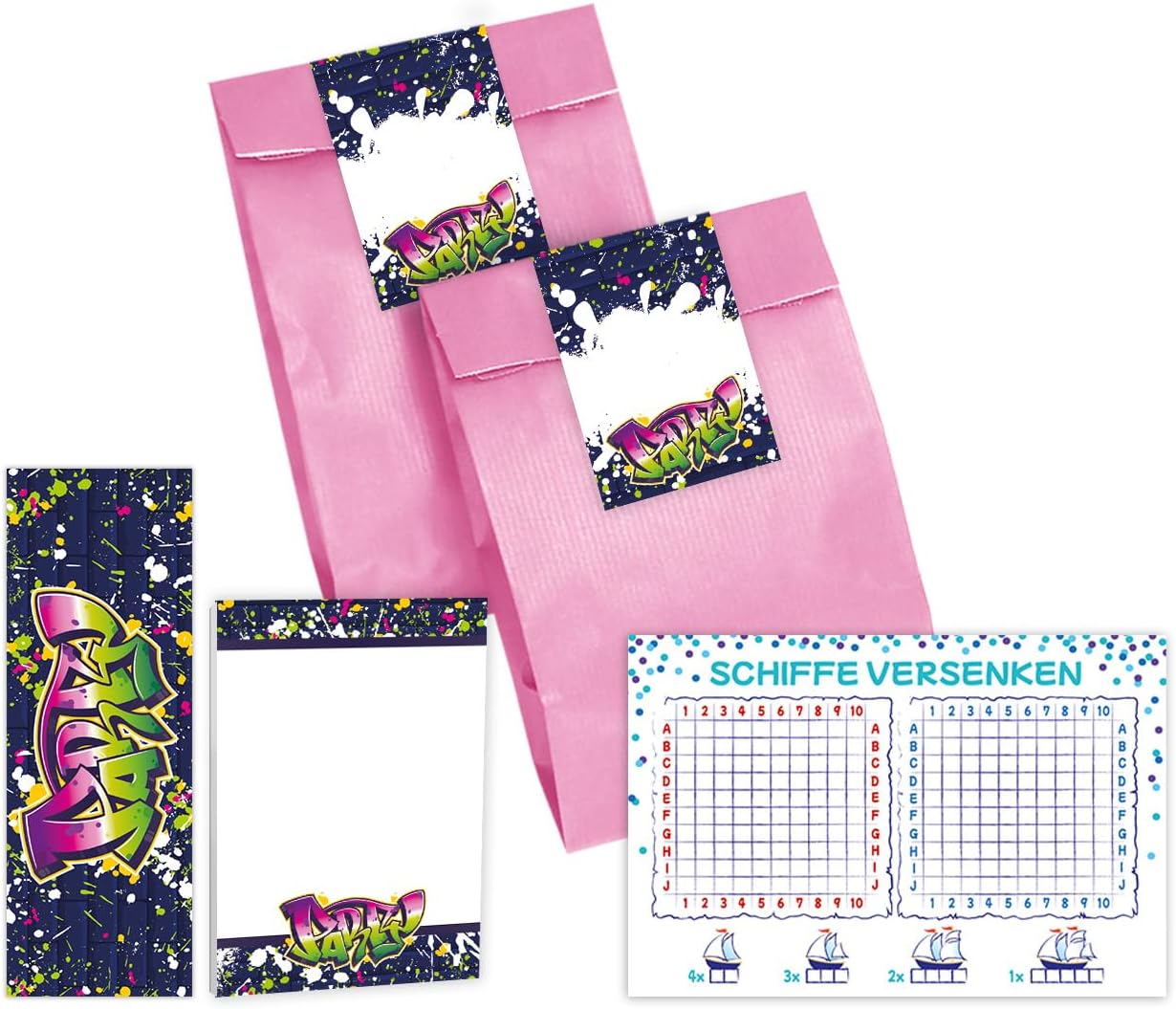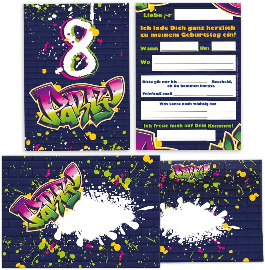 12 biglietti di invito per l'8° compleanno dei bambini, unisex, ragazze, ragazzi, bomboniera, con 12 buste, 12 sacchetti, 12 adesivi, 12 segnalibri, 12 blocchi, 12 navi, 12 graffiti