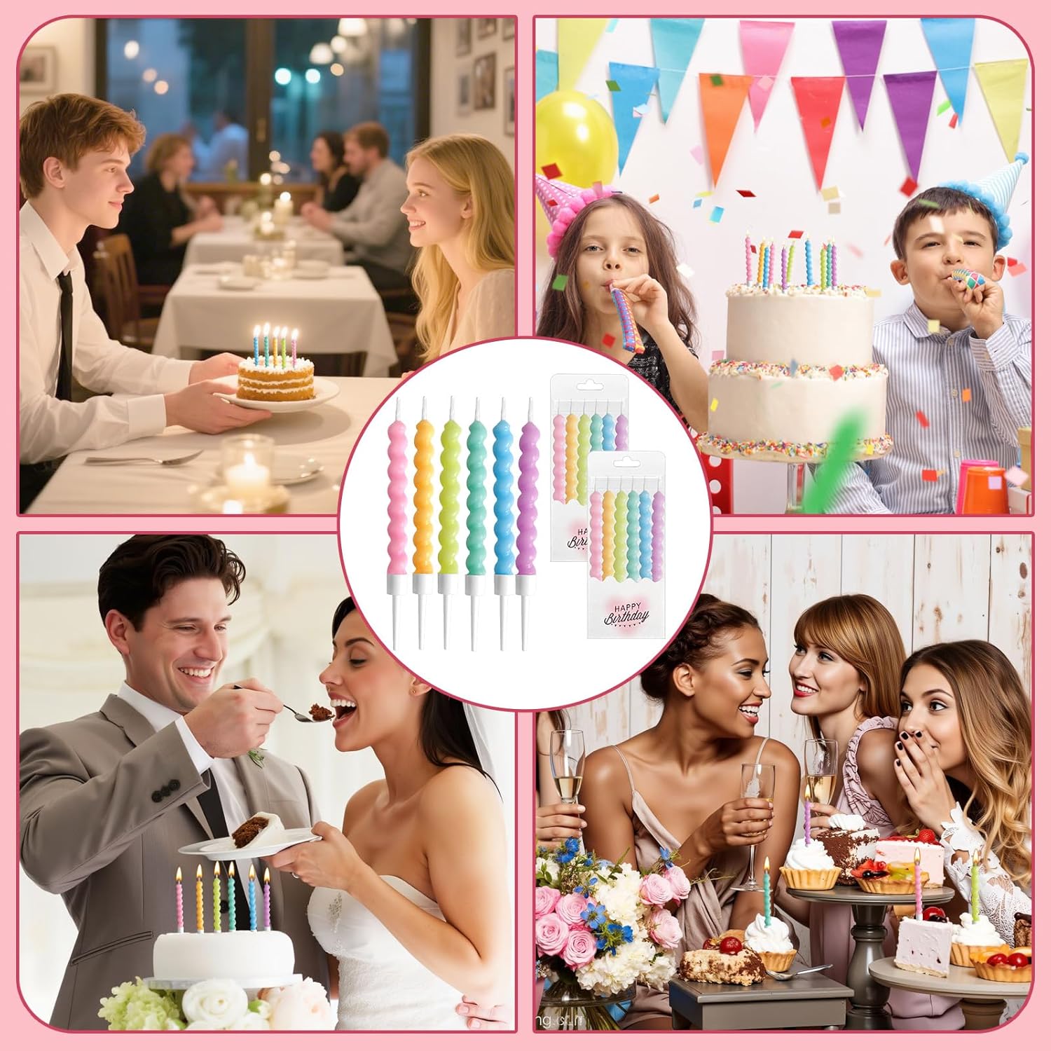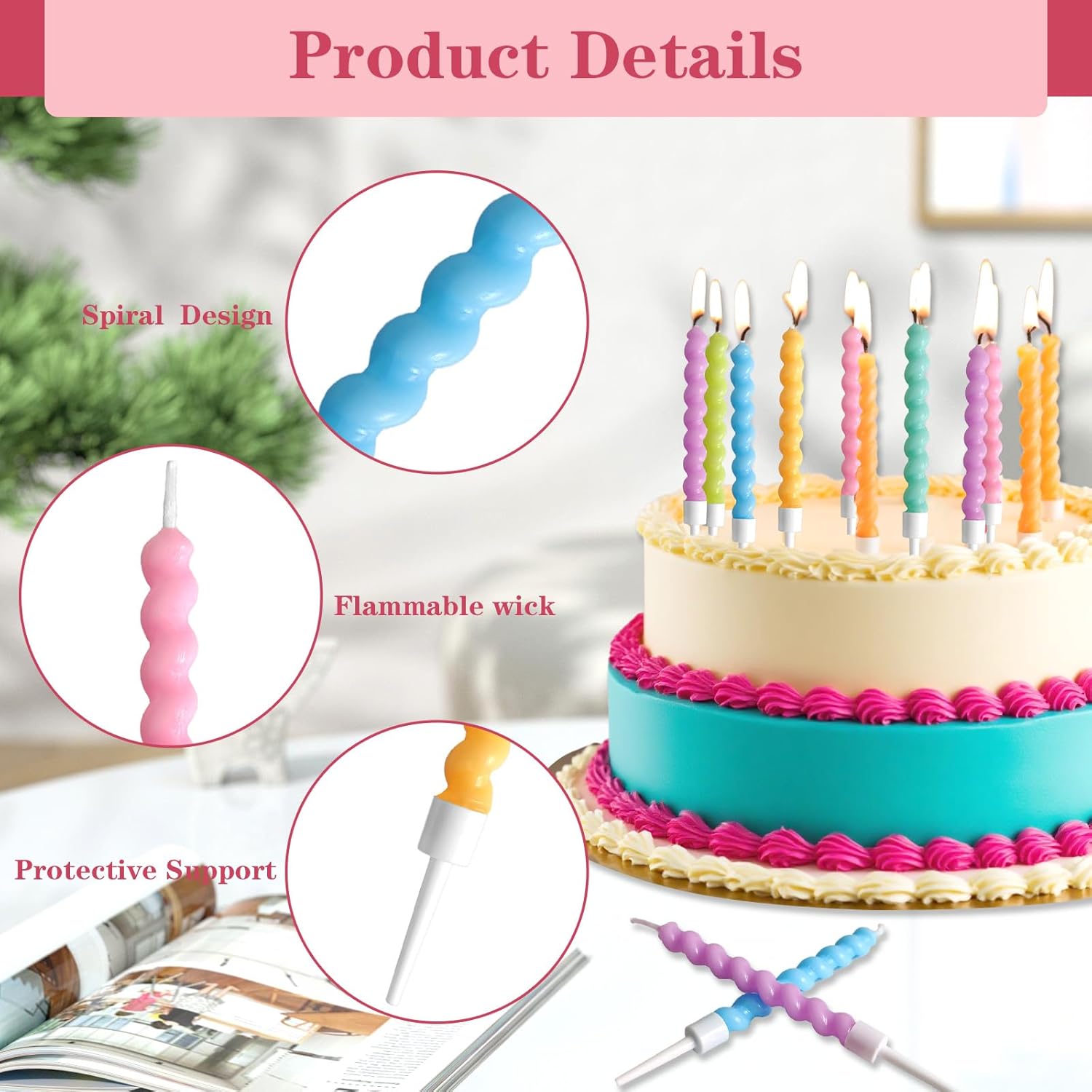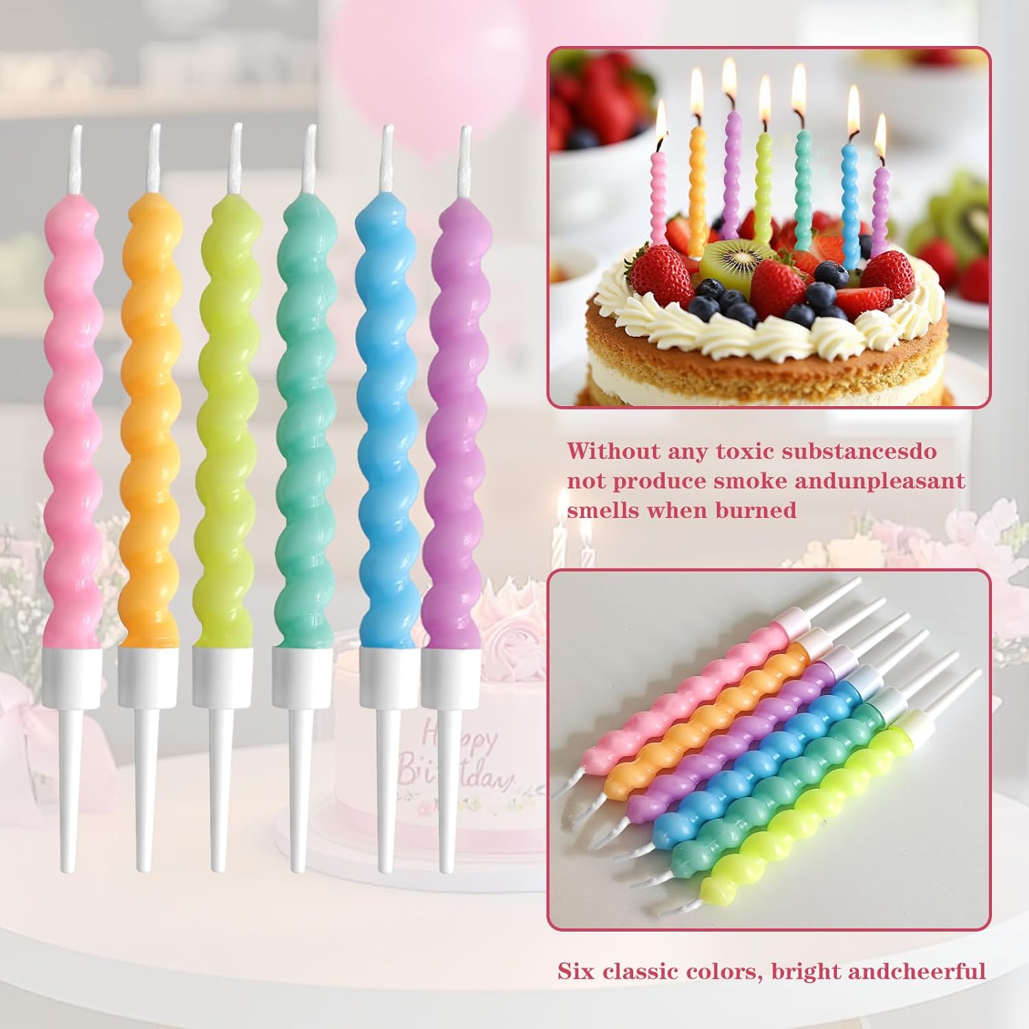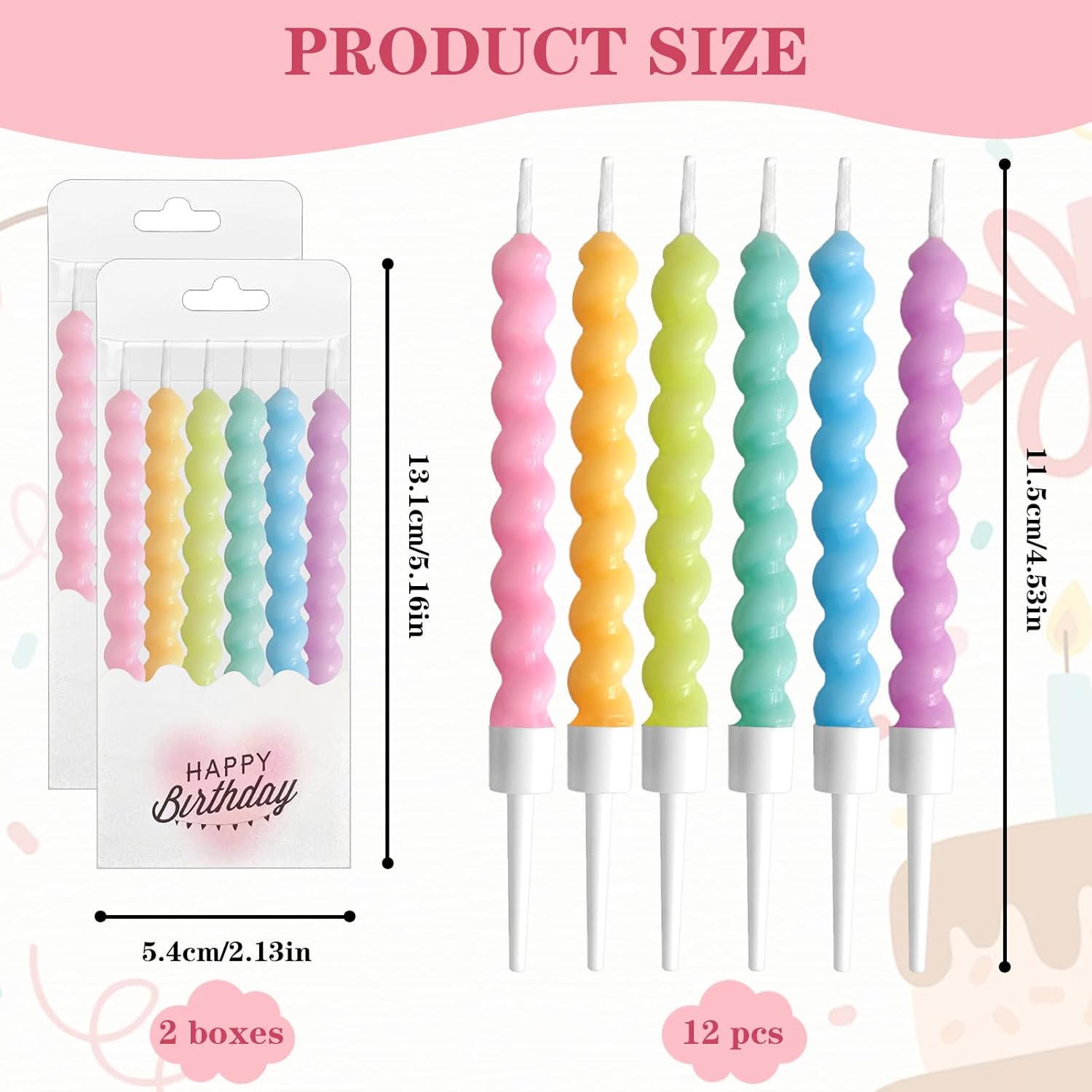 12 candele arcobaleno Twisty: design a spirale vibrante con supporti per torte di compleanno, cupcake e dessert per baby shower. Riaccensione e sicurezza: candele di riaccensione a lunga combustione (6-8 minuti) realizzate in cera atossica, perfette per le feste dei bambini. Design sottile a spirale: le candele a spirale ultra sottili da 11 cm si adattano a cupcake stretti e torte nuziali a più livelli. Multiuso: ideale per compleanni, matrimoni, baby shower e decorazioni per feste. Confezione arcobaleno di alta qualità: 12 candele colorate per torta a spirale con 6 tonalità metalliche per display accattivanti.