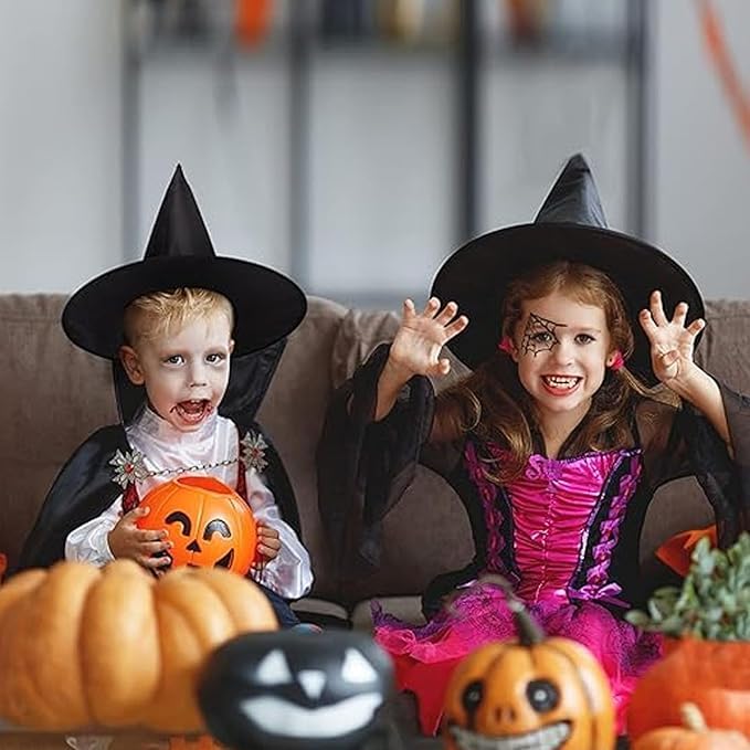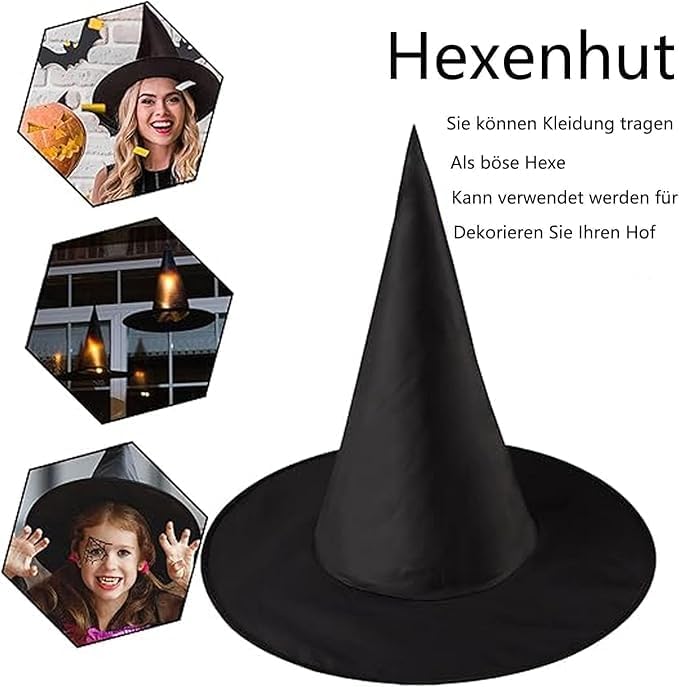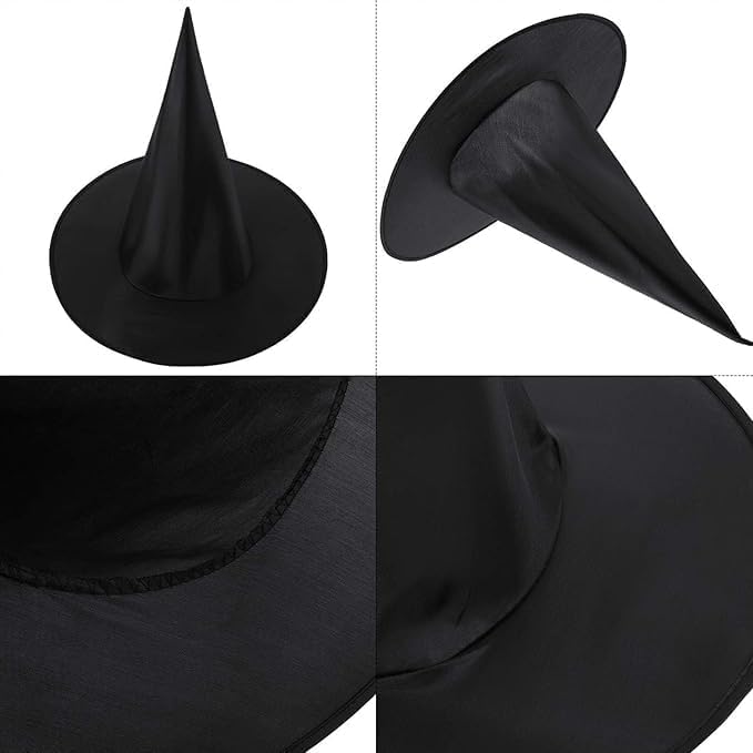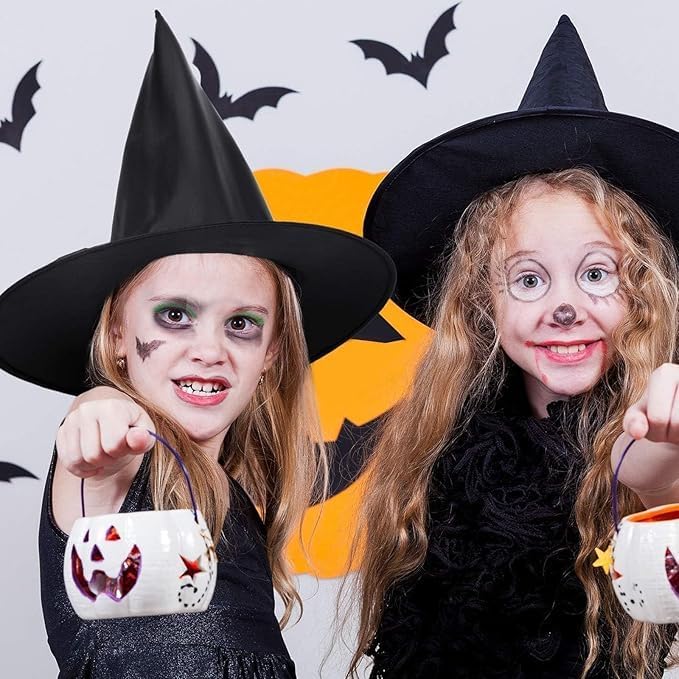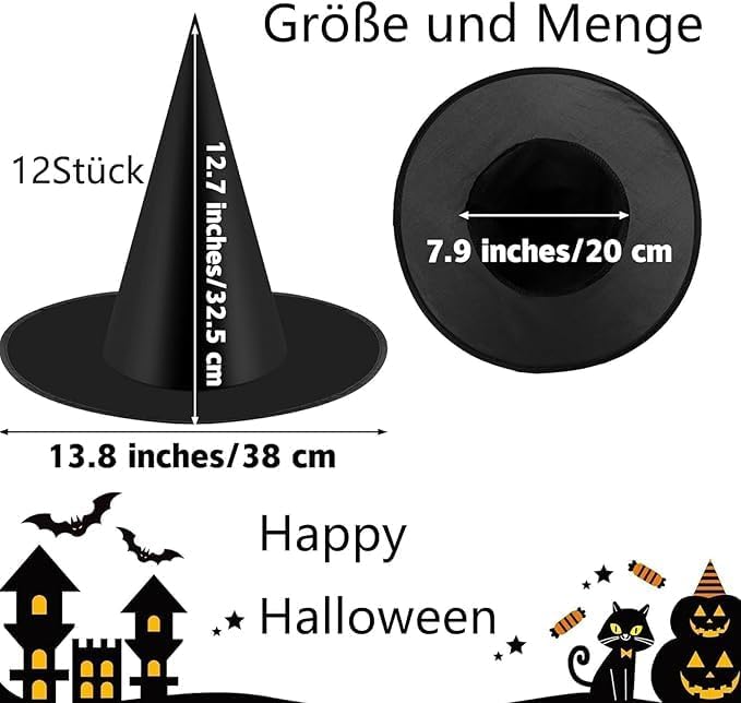 12 cappelli da strega, cappello da strega per bambini, accessorio da strega, cappello magico, cappello da strega, costume da strega, per feste di Halloween, carnevale GRANDE CAPACITÀ DEI cappelli da strega: la confezione contiene 12 cappelli da strega, che sono sufficienti per le tue esigenze di decorazione e possono anche essere condivisi con i tuoi amici e familiari. Aggiungerà un'atmosfera festosa alla tua festa. FUNNY DESIGN: facile da indossare, può creare un'atmosfera festosa, aggiungere divertimento alla tua festa, renderti più attraente alla festa e attirare l'attenzione degli altri. DIMENSIONI: i cappelli da strega sono realizzati in tessuto Oxford di alta qualità, durevoli, non facili da rompere, consistenza morbida, comodo da indossare. Il diametro rotondo della tesa è di 38 cm, il diametro del becco è di 19 cm e l'altezza del cappello è di 35 cm. Applicazione versatile: perfetto per Halloween, cosplay, feste a tema, feste in maschera, carnevale. Comodo da appendere direttamente sulla casa, veranda, porta, cortile, giardino, ufficio, stanza, ristorante, aula, parco giochi e ovunque tu voglia. GOOD VIBE EFFETTO: questi cappelli da strega possono essere il miglior accessorio per costumi per eventi di Halloween. Sono ideali per Halloween, Ringraziamento, Natale, bar, feste scolastiche, matrimoni e altre decorazioni per le feste.
