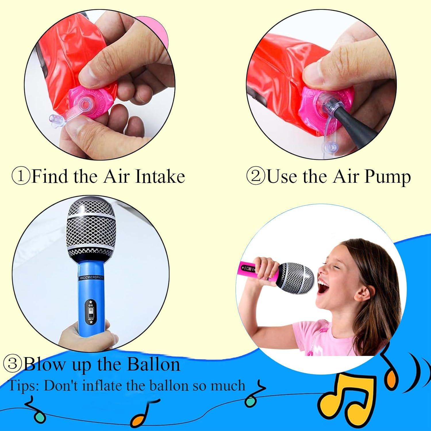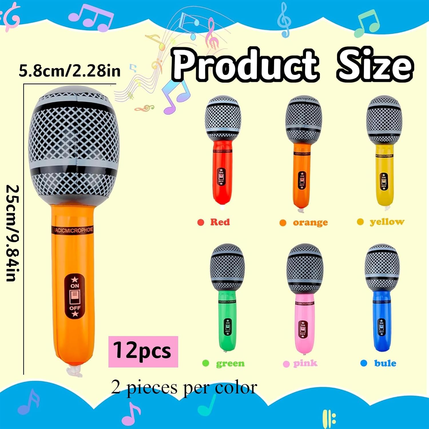 Set di 12 microfoni gonfiabili – Include 12 microfoni gonfiabili (25 cm di lunghezza) in sei colori accattivanti: rosa, arancione, blu, verde, giallo e rosso. Ognuno presenta dettagli stampati per un look realistico. Robusto e riutilizzabile: i microfoni gonfiabili sono realizzati in PVC resistente, possono mantenere la loro forma bene dopo il gonfiaggio. Non sono facili da scoppiare o perdere, resistenti e riutilizzabili. Garantire ermeticità e superficie liscia. I materiali robusti e leggeri garantiscono una maggiore durata e non si danneggiano o si deformano facilmente in circostanze normali. Installazione facile e veloce: non c'è bisogno di pompe o gonfiaggio complicato: i nostri microfoni gonfiabili per feste sono dotati di una valvola facile da usare per gonfiare senza sforzo in pochi minuti. Basta soffiare, sigillare e lasciare che il divertimento abbia inizio! Comoda conservazione: inserire l'ago nel collo del microfono gonfiabile per sgonfiare facilmente. Possono essere comodamente conservati in uno spazio compatto fino al prossimo incontro o evento. Divertimento pronto per le feste: porta energia a qualsiasi celebrazione con questi vivaci oggetti di scena per microfono! Il microfono falso è ideale per serate karaoke, feste di compleanno, festival, spettacoli teatrali o eventi a tema come Halloween e Natale. I colori vivaci e il design realistico aggiungono un tocco giocoso al tuo intrattenimento.