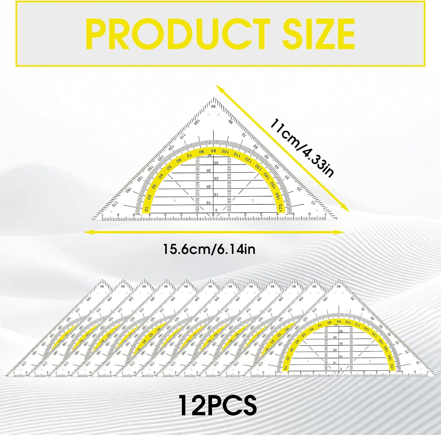 Set Completo di Triangoli Geometrici: Questo set include 12 triangoli geometrici gialli in plastica trasparente, ideali per disegno tecnico, geometria di triangolo e misurazioni precise. Perfetto per uso scolastico, in ufficio o per professionisti come architetti, ingegneri e designer. Materiale Resistente e di Alta Qualità: I triangoli geometrici sono realizzati in plastica di alta qualità, materiale resistente e durevole. La plastica è robusta e non si rompe facilmente, con una superficie liscia che consente un disegno preciso e una lettura chiara delle scale Funzione Goniometro per Misurazioni Facili: Ogni triangolo può essere utilizzato come goniometro per misurare e tracciare angoli con precisione. Grazie alla scala chiara e leggibile, i triangoli sono perfetti per attività che richiedono misurazioni angolari esatte Adatto per Scuola, Ufficio e Professionisti: Il set di triangoli geometrici è ideale per studenti, insegnanti, progettisti e professionisti che lavorano con geometria e misurazioni. La dimensione di rende i triangoli facili da portare con sé, perfetti da riporre in uno zaino