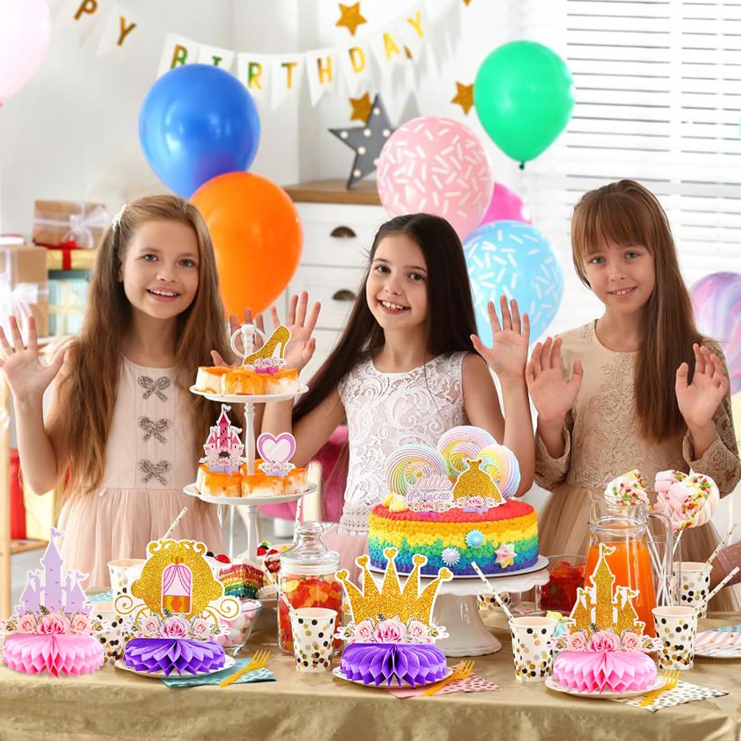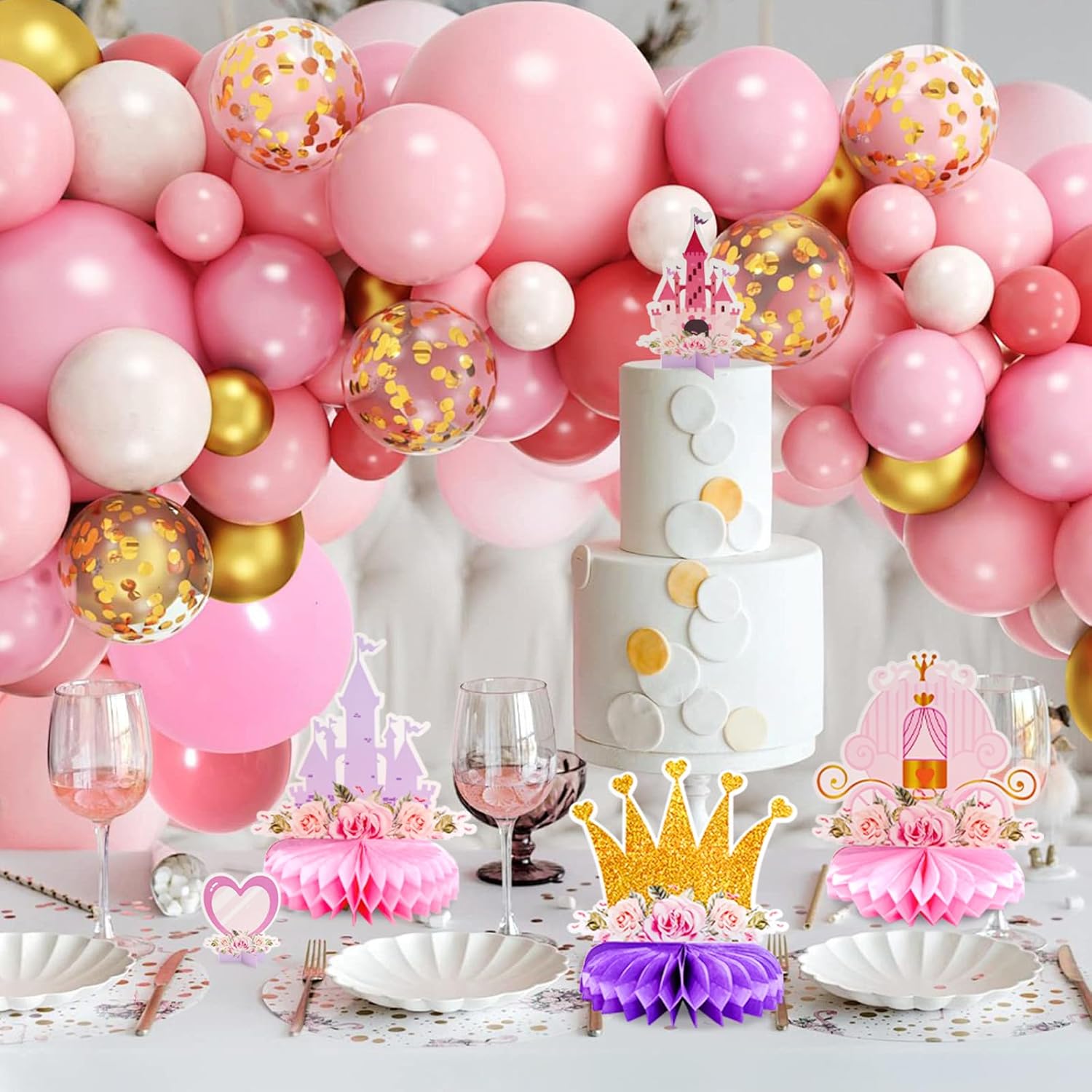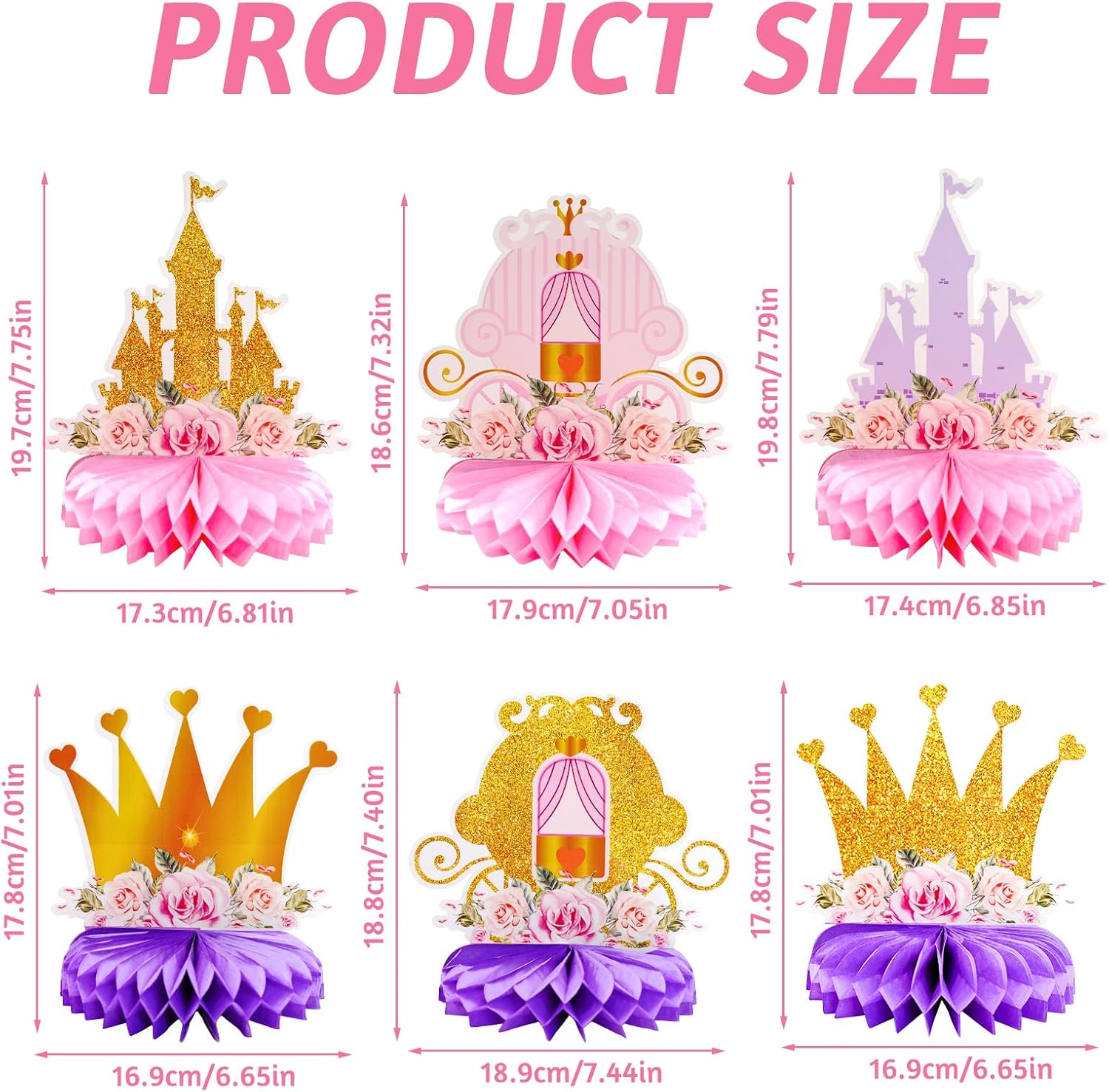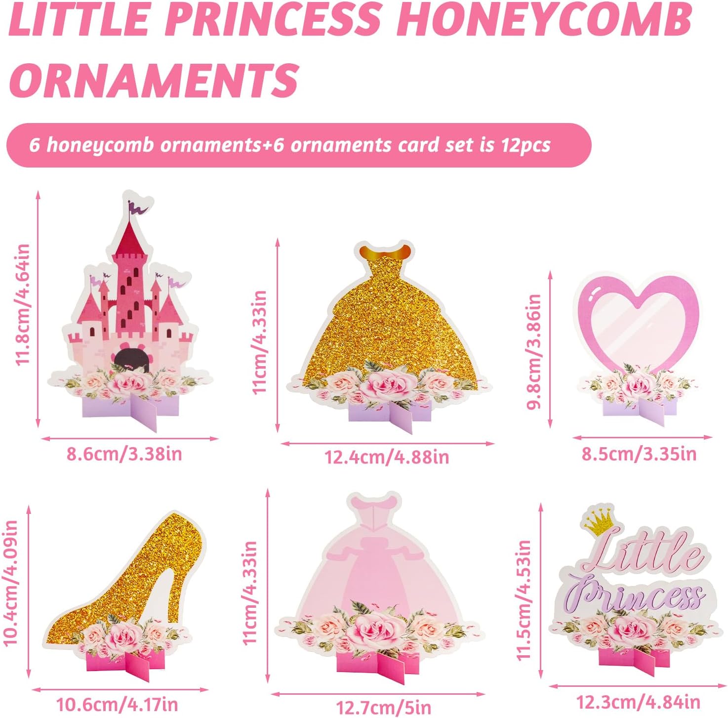 【Decorazioni per feste a tema principesse】Un set di decorazioni a tema principesse composto da 12 pezzi in materiale a nido d'ape, tra cui una carrozza a forma di zucca, un abito da principessa, scarpe con tacco alto, un castello, una corona, ecc., pieno di amore e dolcezza, per soddisfare i tuoi desideri di decorazioni in stile principessa. 【Materiali riutilizzabili】Queste decorazioni sono realizzate con materiali resistenti e possono essere conservate e riutilizzate per futuri eventi o feste a tema principesse. 【Design vivaci】Con romantiche tonalità di rosa, viola e oro e iconiche grafiche a tema principesse, queste decorazioni creano un'atmosfera vivace e accogliente. 【Facile da montare】La struttura a nido d'ape consente un montaggio rapido e semplice, garantendo un'esperienza di decorazione senza stress. 【Molteplici possibilità di utilizzo】Adatto per decorazioni da tavolo, arazzi o come parte di un insieme decorativo più ampio per creare un tema coinvolgente. Adatto per baby shower, feste di compleanno, feste di famiglia e altre occasioni.