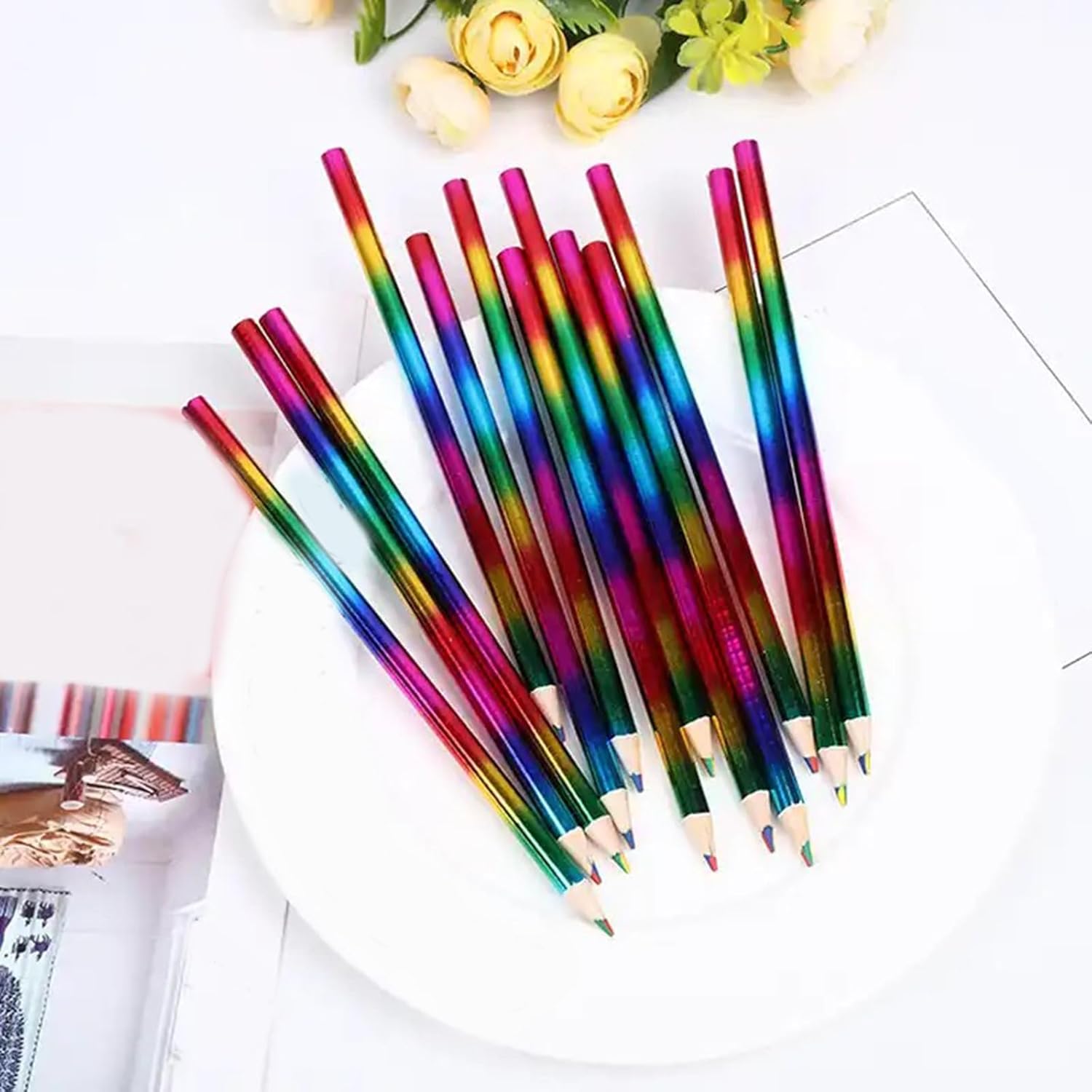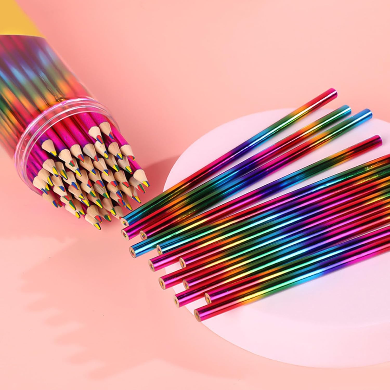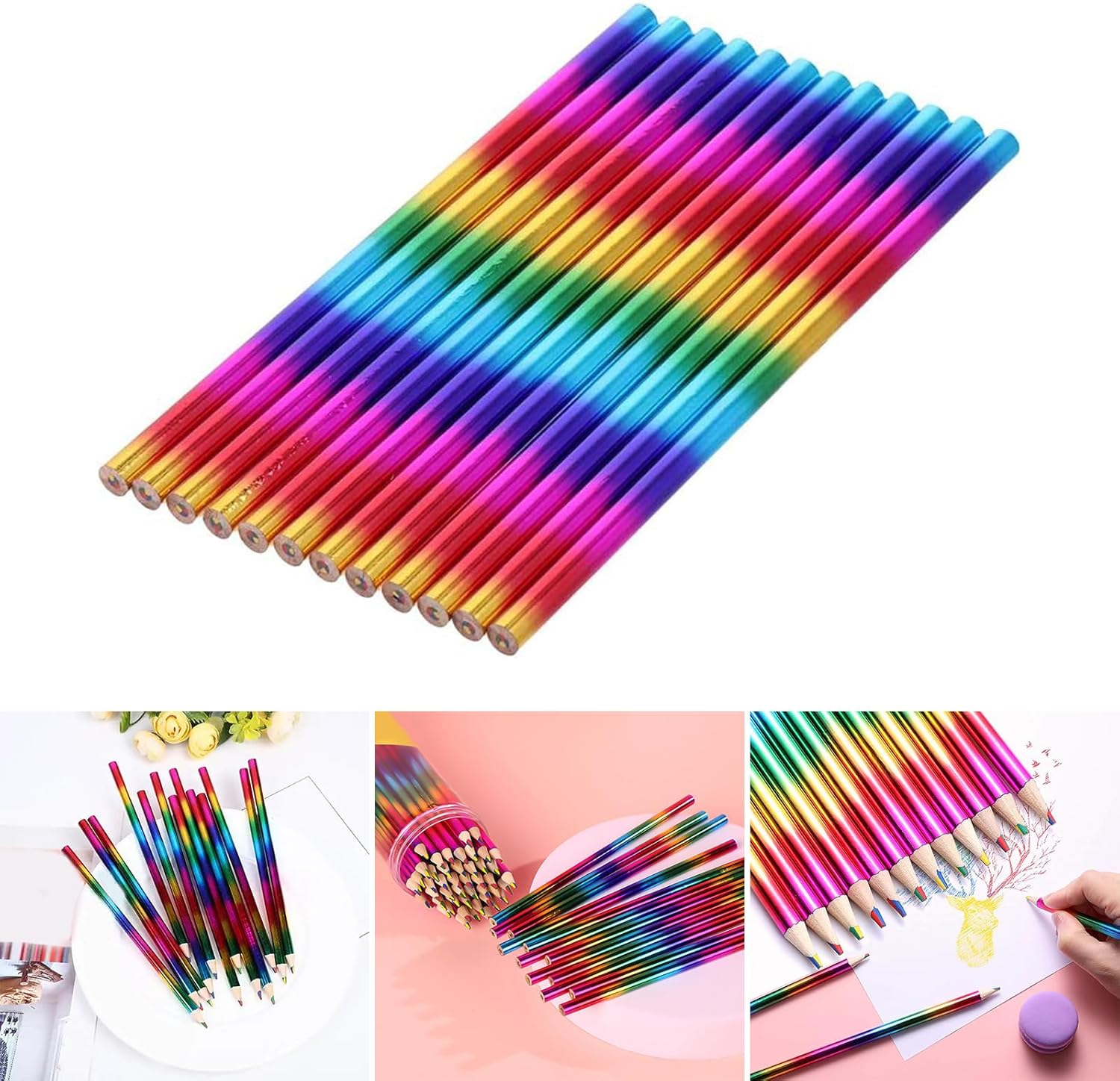Le matite arcobaleno sono perfette per aule, case e studi d'arte. Queste matite sono perfette per varie attività di disegno. Adatte a chiunque desideri esplorare il proprio lato artistico, queste matite colorate arcobaleno sono ideali per disegnare, colorare e creare. Dai compiti scolastici ai progetti personali, le pagine da colorare sono strumenti versatili che ispirano la creatività. Lascia correre la tua immaginazione con queste matite arcobaleno. Esplora un'ampia gamma di colori e crea splendide opere d'arte che riflettono il tuo stile unico. Le penne arcobaleno 4 in 1 colori possono anche essere un regalo premuroso per i propri cari che amano l'arte.