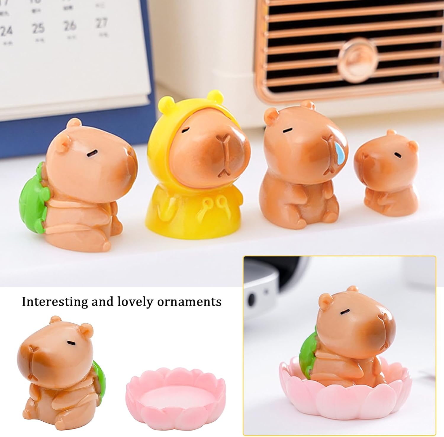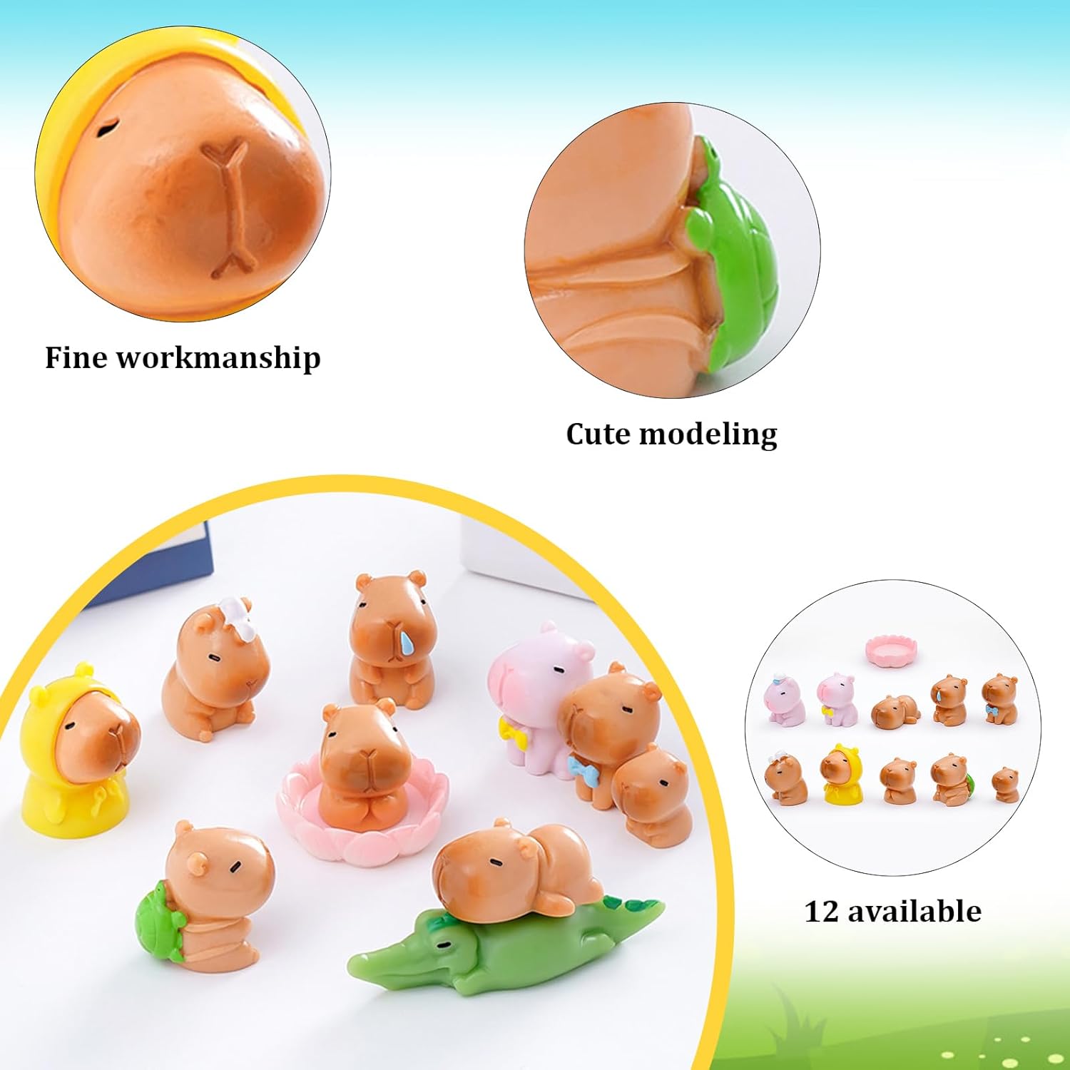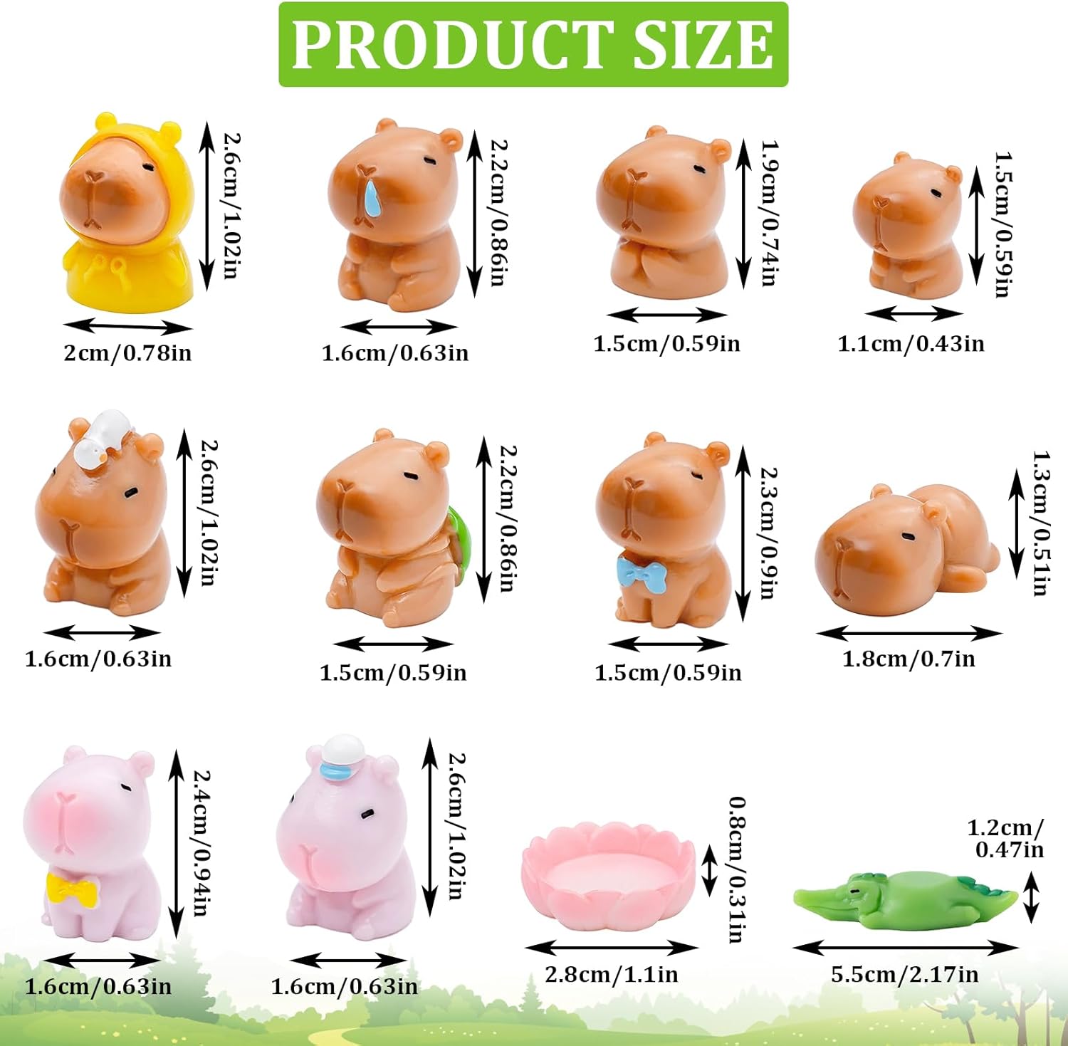 🍰【Miniature di capibara】Riceverai 12 graziose statuine di capibara da utilizzare come ornamenti paesaggistici. Con design raffinati e variegati, piccole e raffinate, dall'aspetto realistico, dai colori vivaci e uniformi, sono perfette per paesaggi in miniatura, decorazioni per torte, giardini fatati o come decorazioni da tavola. 🎂【Design unico】Ispirato all'animale capibara, il design è carino e può essere combinato per l'uso. Il modellato cartoon e le caratteristiche carine aggiungono divertimento alla tua vita. È molto popolare e anche i bambini lo adorano. 🧁【Materiale affidabile】L'ornamento in miniatura del capibara è realizzato in resina resistente, ha dimensioni mini di circa 1~2 pollici e ha le caratteristiche di anti-caduta, anti-strappo, resistente, riutilizzabile e indeformabile. Per garantire che la tua collezione rimanga vivace e intatta, anche in aree esterne. 💒【Molteplici usi】Puoi utilizzare queste decorazioni per numerose occasioni, non solo per feste di compleanno, mini giardini decorativi fai da te o terrari, scene di case delle bambole e scatole ombra, decorazioni per cupcake, decorazioni per feste in ufficio e a casa. 💝【Regalo ideale】Che sia per gli amanti degli animali, gli appassionati di miniature o come piccolo regalo, questo set è un dono incantevole. Le figurine di capibara per case delle bambole sono ideali come regali di compleanno per bambini, regali per adulti, regali per la famiglia, premi di classe, regali di Halloween, regali di anniversario e molto altro ancora.