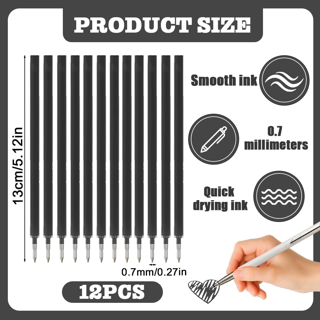 1,✏【12 Ricariche di alta qualità】: Il set HABNI include 12 ricariche nere (punta 0,7 mm, diametro 4 mm, lunghezza 13 cm) con inchiostro termocromatico. Le ricariche sono perfettamente compatibili con le penne cancellabili Legami, offrendo una soluzione economica per sostituire le originali, senza sacrificare la qualità di scrittura. Ideale per chi cerca un'alternativa conveniente e durevole. 2,🔄【Cancellazione facile grazie all'inchiostro termocromatico】: La nostra ricarica è dotata di inchiostro sensibile al calore che permette di correggere facilmente gli errori con una gomma Legami. Perfetto per documenti, appunti e schizzi che necessitano di correzioni frequenti. Si consiglia di mantenere le ricariche lontano da fonti di calore per garantire prestazioni ottimali e una cancellabilità duratura. 3,⚫【Scrittura nitida con inchiostro nero intenso】: L'inchiostro nero ad alta densità garantisce una scrittura chiara e leggibile, ideale per note professionali, lavoro d'ufficio o appunti accademici. La sua forte pigmentazione conferisce un aspetto professionale e pulito, perfetto per tutti gli ambienti che richiedono una scrittura precisa e di alta qualità. 4,✨【Ricariche durevoli e affidabili】: Ogni ricarica è progettata con precisione per garantire un flusso d'inchiostro costante senza sbavature. La punta da 0,7 mm permette di scrivere in modo preciso e uniforme, sia a scuola che in ufficio. Con una durata media di 250 metri per ricarica, sono ideali per uso quotidiano e professionale. 5,🎁【Regalo perfetto per studenti e professionisti】: Il set da 12 ricariche è confezionato in modo elegante, rappresentando un regalo ideale per colleghi, studenti, insegnanti o amici. È un'ottima scelta per occasioni speciali come compleanni, festività o come regalo per il ritorno a scuola, offrendo praticità e stile a chi lo riceve.