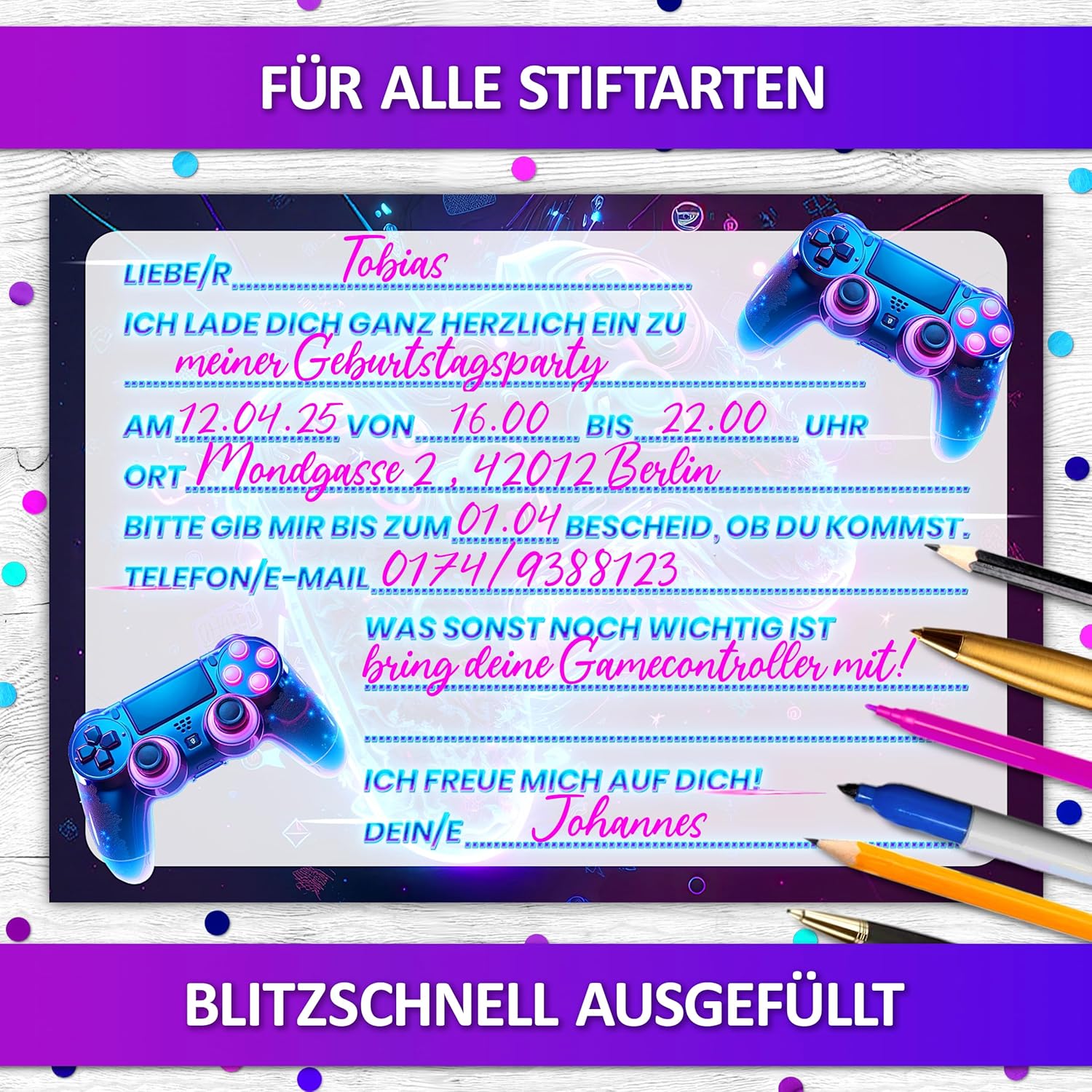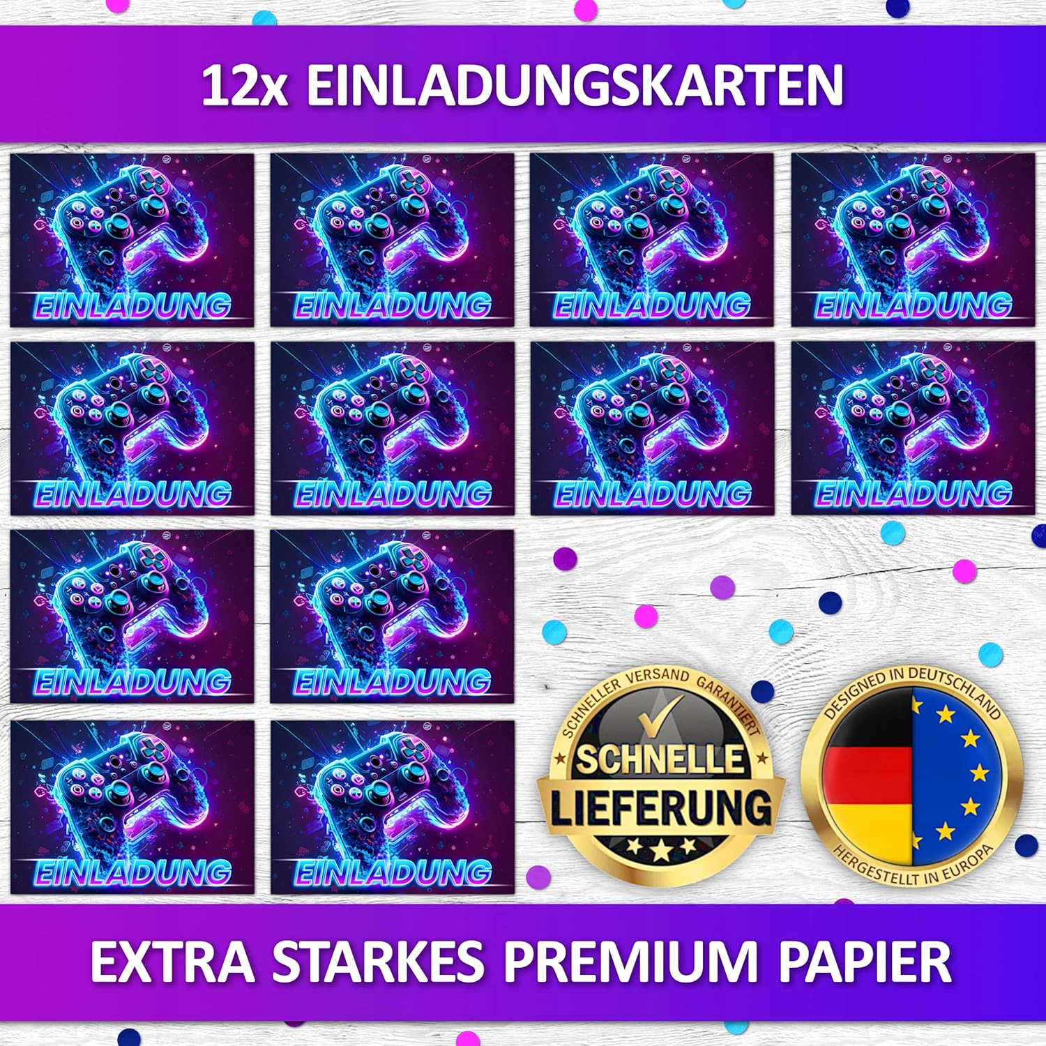 Versatile: per feste di gioco per bambini, feste di compleanno per bambini, feste di compleanno per bambini, feste notturne o torneo di videogiochi, le carte da gioco sono l'invito alla festa per ragazzi, amici, giocatori Unici: i nostri biglietti d'invito per giocatori di compleanno per bambini e bambine sono l'accessorio per ogni festa di compleanno per bambini – facile da distribuire come regalino agli amici o a scuola Vera qualità: i nostri biglietti d'invito sono prodotti in Germania: gli inviti di compleanno in carta riciclabile da 350 g di alta qualità sono rifiniti con speciali processi di stampa Formato ottimale: i biglietti d'invito per feste DIN A6 offrono spazio per tutte le informazioni importanti e sono scrivibili con tutte le penne comuni: sono il ricordo dell'infanzia per ogni amico Il biglietto d'invito perfetto: con i 12 divertenti inviti per feste in stile gioco e formato cartoline, tutti gli ospiti saranno sicuri che tutti i bambini e gli adolescenti arrivino alla festa di compleanno!