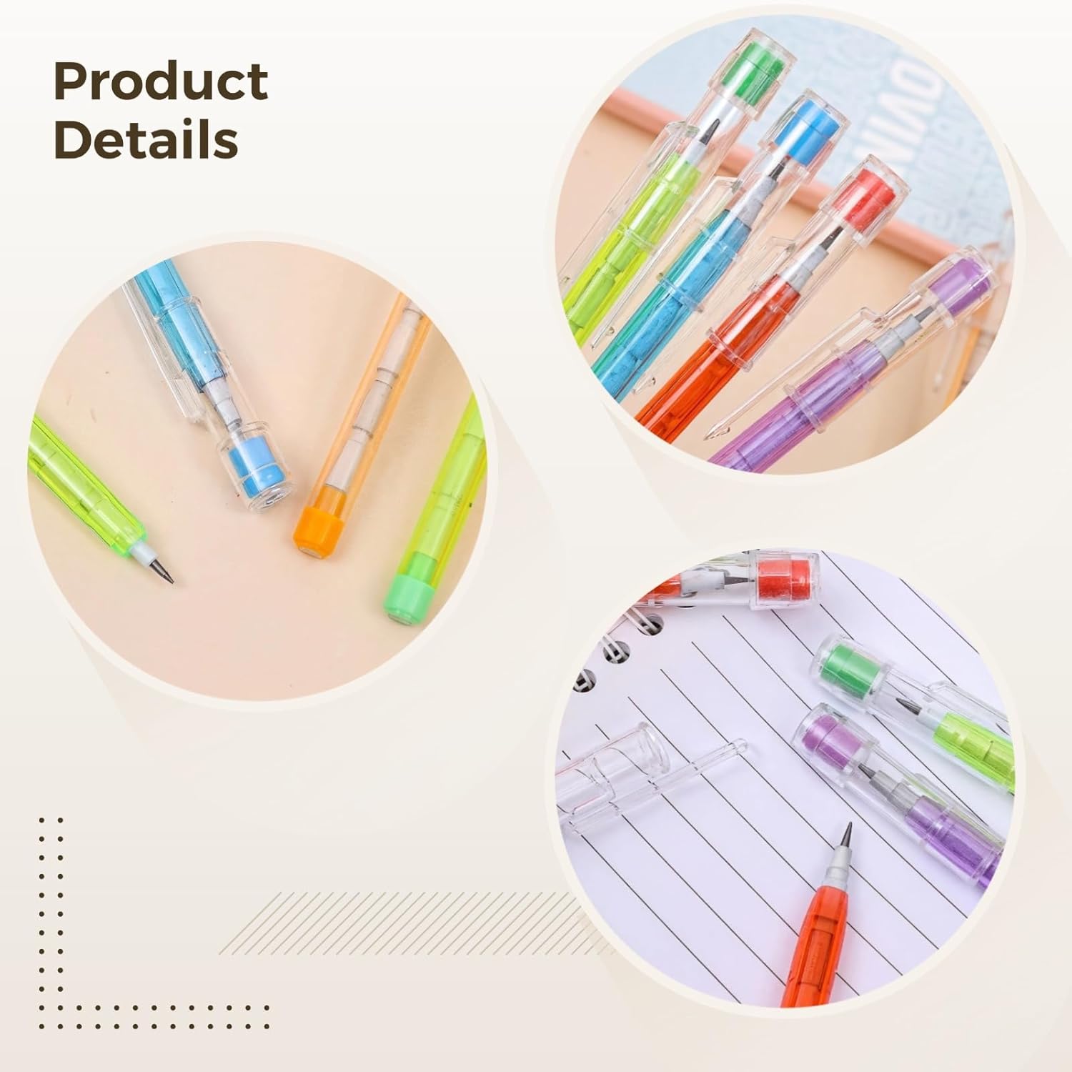 Involucro trasparente: il design trasparente consente un facile tracciamento dell'usura della matita; aiuta a evitare interruzioni e mantiene le attività fluide Ricariche senza problemi: sostituisci facilmente i segmenti di matita; comodo per lezioni ininterrotte o sessioni creative Gomma integrata: comoda gomma attaccata; elimina la necessità di uno strumento separato; rende la correzione degli errori più facile e veloce Coinvolgente per i bambini: i colori vivaci attirano l'attenzione e mantengono i bambini concentrati sulle attività; sicuro per i bambini da usare Durevole e di lunga durata: struttura in plastica resistente; resistente all'usura; per ambienti scolastici o di progetto