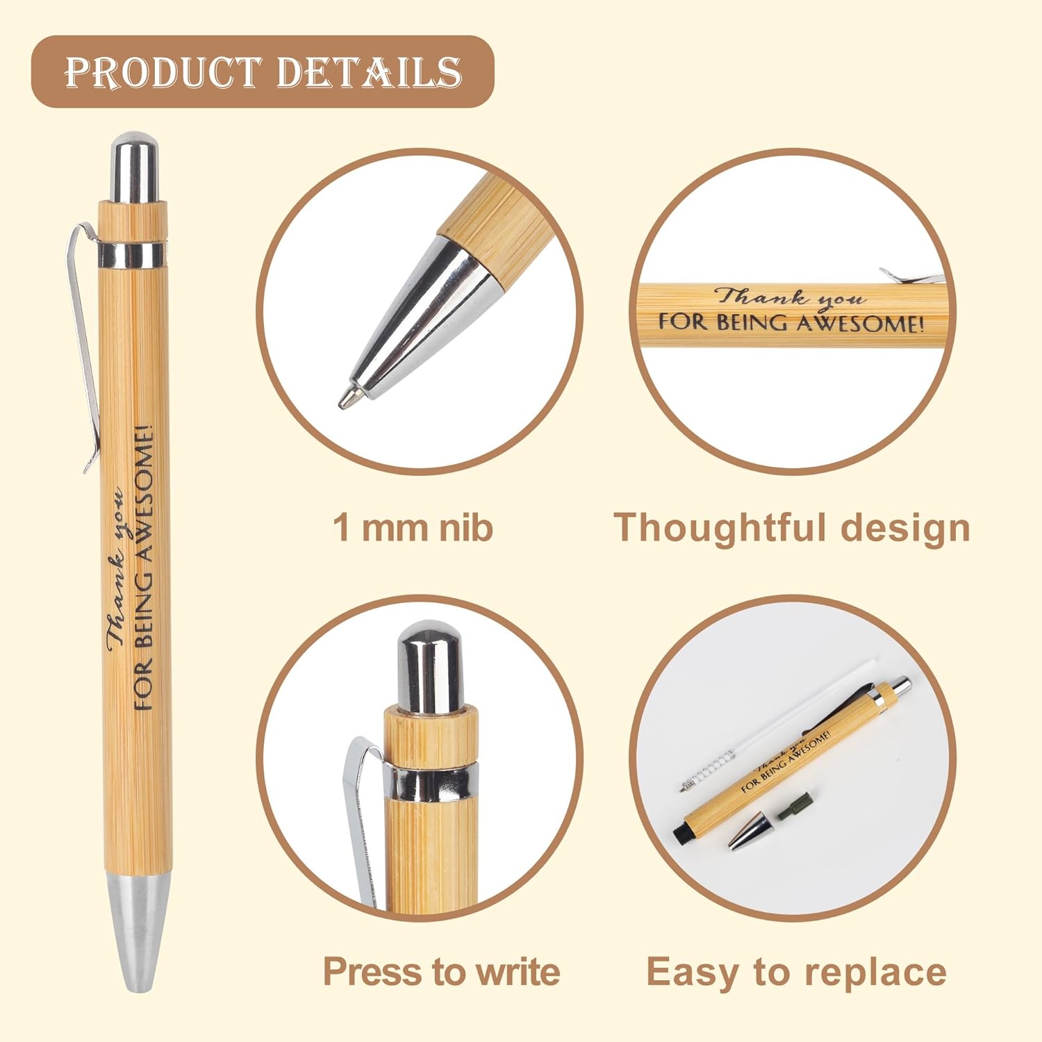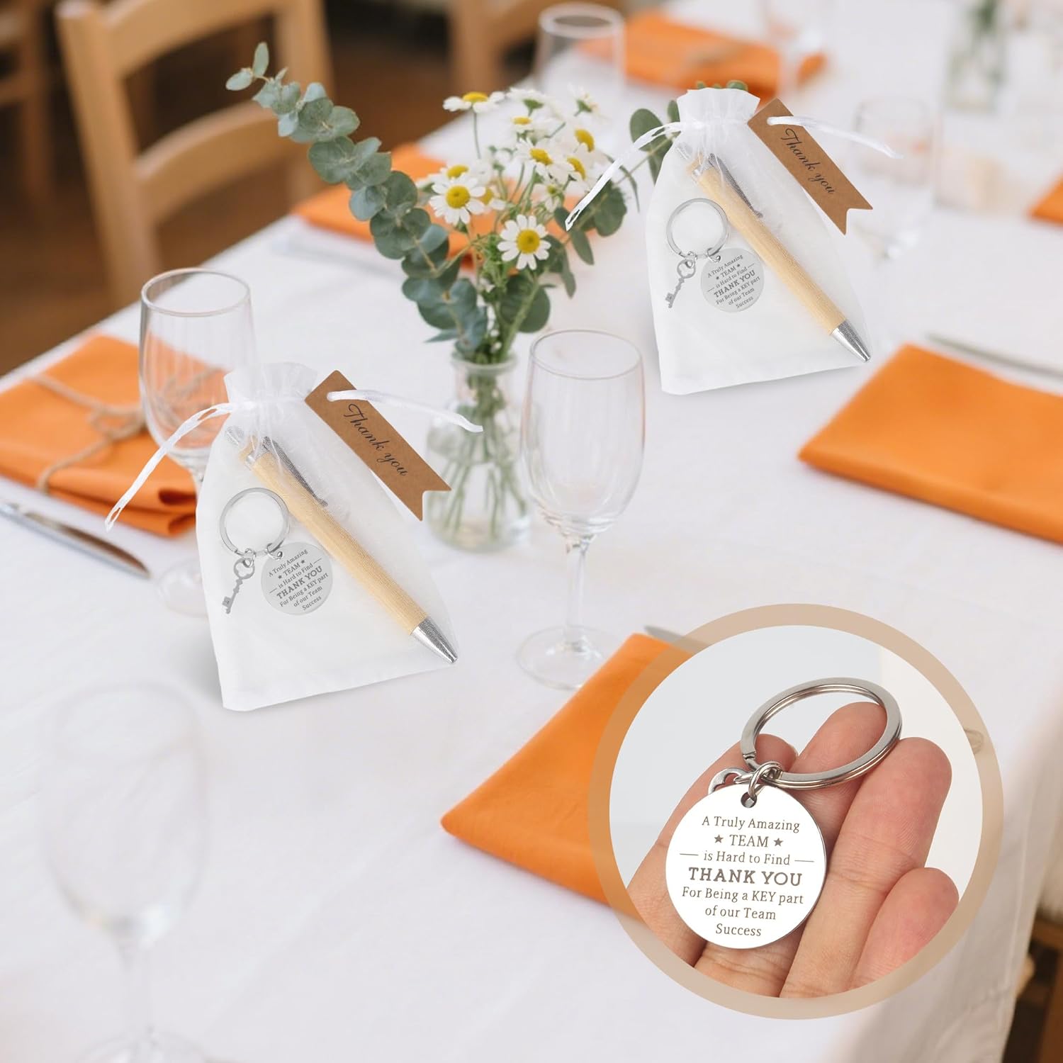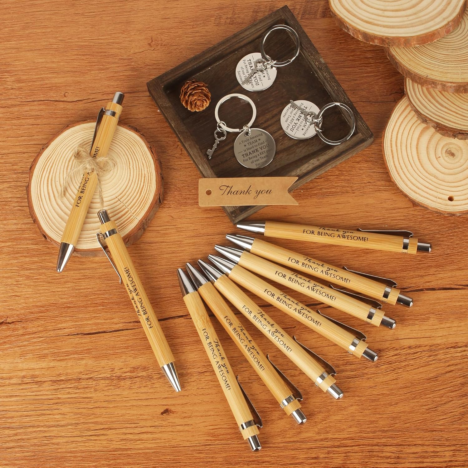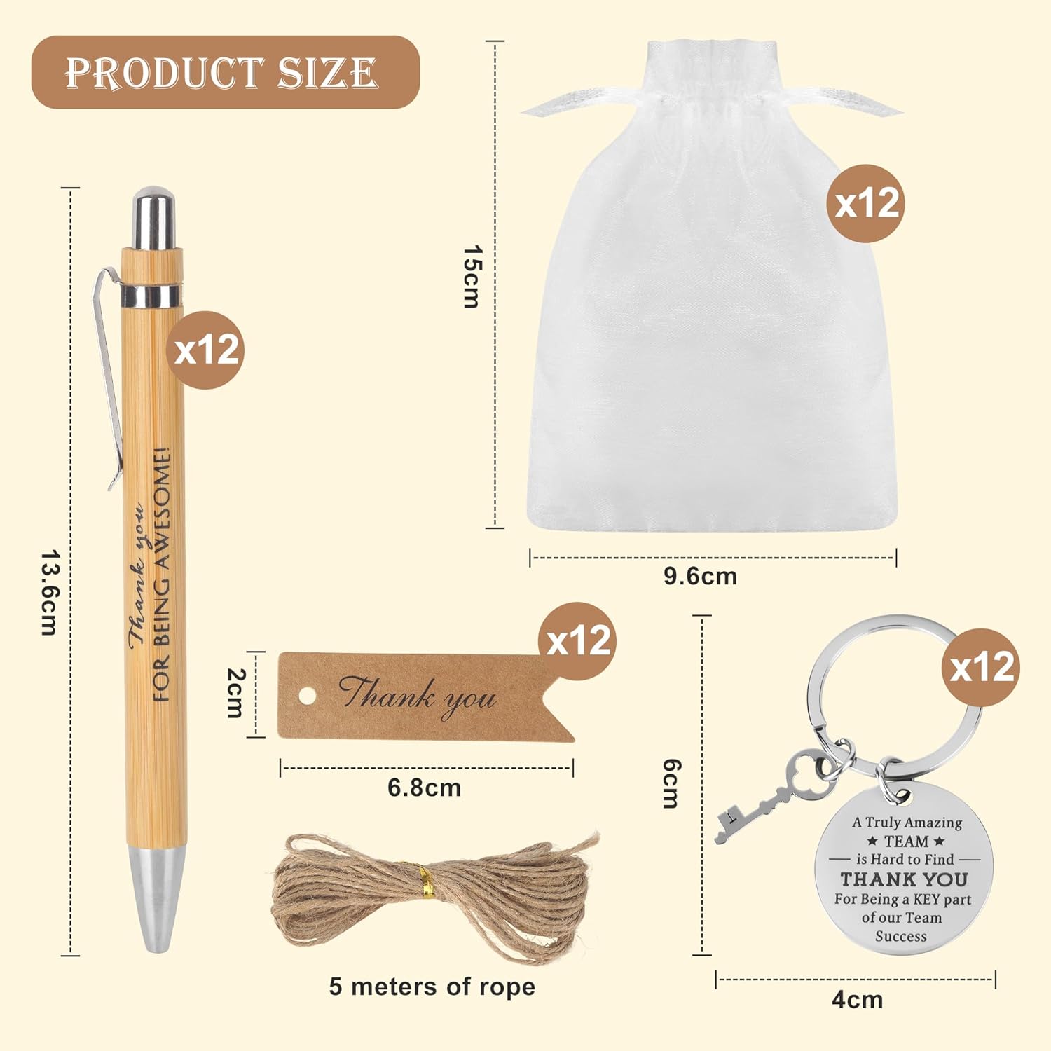 Cosa Riceverete: Questo set regalo è una scelta eccellente per esprimere la vostra gratitudine. Il set regalo di ringraziamento contiene 12 penne a sfera in legno di alta qualità con la scritta “Thank you FOR BEING AWESOME!”, 12 portachiavi, 12 sacchetti di organza bianchi, 12 bigliettini con la scritta “Thank you” e un rotolo di spago. Materiali di alta Qualità: Le penne a sfera sono realizzate in legno di bambù, che le rende robuste e comode da usare. I biglietti di ringraziamento sono stampati su carta patinata con grafica chiara. Il portachiavi è realizzato in acciaio inossidabile resistente; il design argentato è sia bello che pratico. I sacchetti di organza e lo spago sono realizzati con materiali robusti e affidabili e possono essere utilizzati senza esitazioni. Inchiostro dai Colori Vivaci: Le nostre penne a sfera ispiratrici sono riempite con inchiostro nero che scorre fluidamente e offre un'esperienza di scrittura piacevole. Che tu stia prendendo appunti, scrivendo i tuoi pensieri o redigendo una lettera, le nostre penne a sfera con frase garantiscono una scrittura chiara e precisa. Design Stimolante: I portachiavi motivazionali riportano parole incoraggianti [A Truly Amazing ★TEAM ★ is Hard to Find -THANK YOU For Being a KEY part of our Team Success] che mirano a rafforzare la fiducia in se stessi e a promuovere una vita positiva e ottimista. Adattabile a Molte Occasioni: Che si tratti di un collega o di un subordinato, questo set regalo può soddisfare le vostre diverse esigenze; che si tratti di un collega che desidera esprimere gratitudine o di un subordinato che ha bisogno di motivazione e sostegno, questo regalo è la scelta ideale. Anche come piccolo regalo tra colleghi, può avvicinarvi e approfondire l'amicizia.