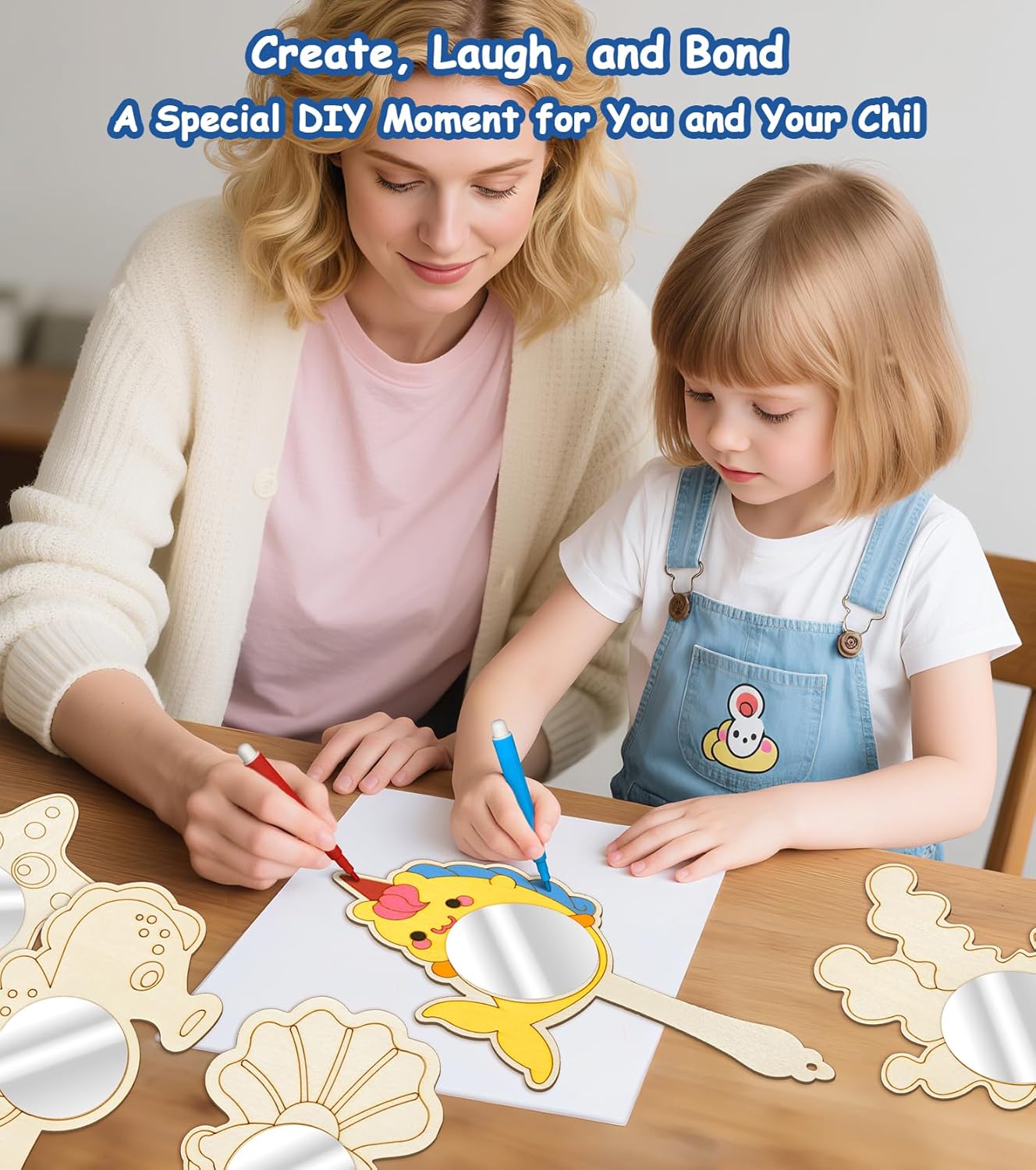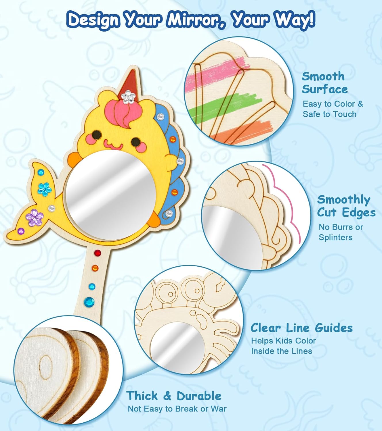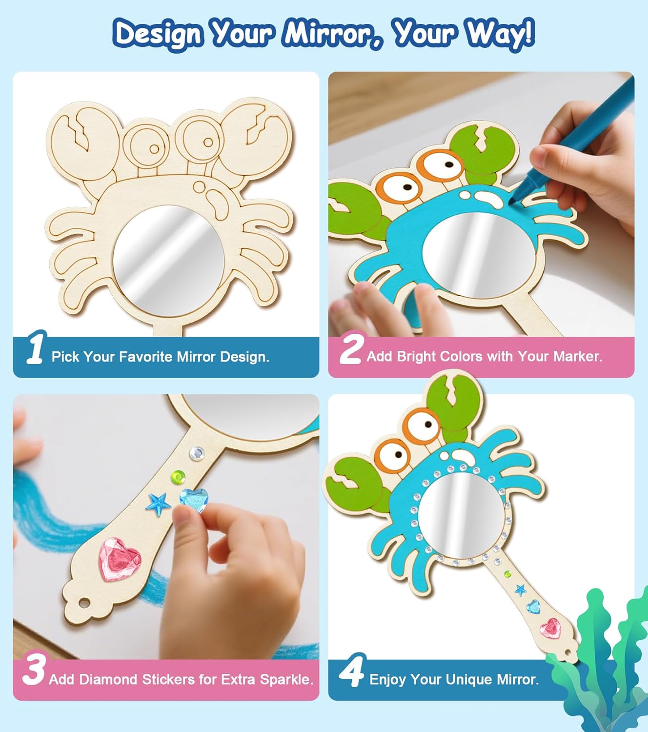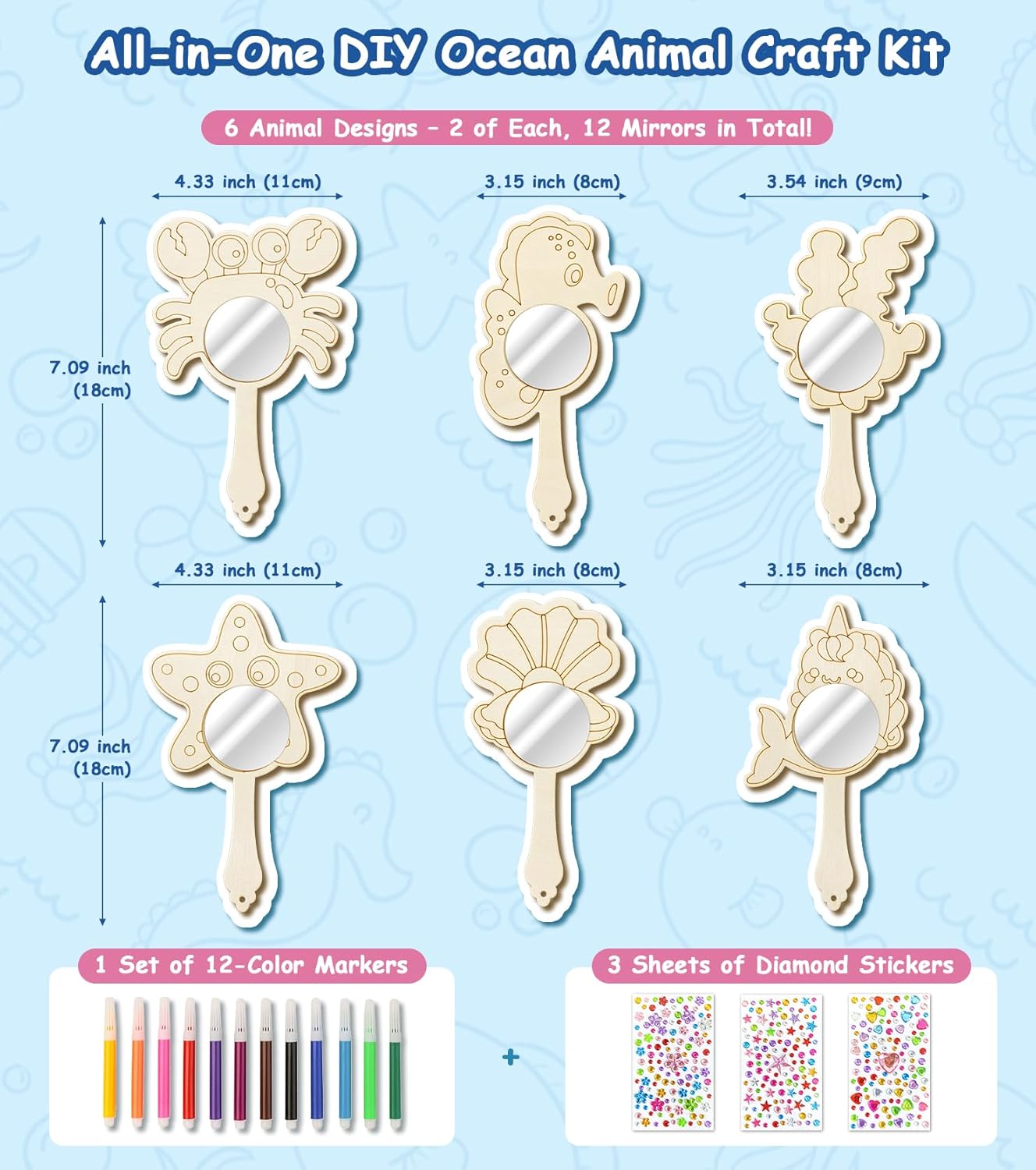 【DIY Set di Specchi in Legno di Creature Marine】 Questo set di specchi in legno per bambini da dipingere include 12 specchi in legno intagliati e non dipinti con 6 diverse forme di creature marine (2 pezzi per forma: granchio, cavalluccio marino, stella marina, conchiglia, alghe, delfino), 12 acquerelli e 3 fogli di adesivi diamantati. I bambini possono dare libero sfogo alla loro fantasia, personalizzare ogni specchio e allo stesso tempo sviluppare la loro creatività e abilità pratiche. 【Materiale di Alta Qualità】 Gli specchi in legno sono realizzati in legno naturale e specchi acrilici. La superficie è liscia, i bordi sono accuratamente levigati – nessuna scheggia di legno, sicuro per le mani dei bambini. Le tavole di legno sono facili da dipingere, ideali per il set di artigianato per compleanni, per creare specchi colorati e unici. 【Divertimento Creativo DIY】 I bambini possono dipingere ogni specchio in legno e decorarlo con gli adesivi diamantati inclusi per creare il loro piccolo specchio personalizzato. Questa attività stimola la creatività, l'immaginazione e le capacità motorie fini dei bambini. 【Tempo Familiare Interattivo】 Questo set di artigianato per bambini dai 4 ai 9 anni è perfetto per le attività genitori-figli. Creare insieme rafforza i legami familiari, promuove la collaborazione e crea ricordi preziosi. 【Perfetto Regalo】 Ideale per feste di compleanno, compleanni dei bambini, Natale, Pasqua, Halloween o come piccolo regalo alle feste. Questo set di artigianato per bambini è un regalo creativo, educativo e divertente che terrà i bambini occupati per ore, allenando anche le loro abilità pratiche.