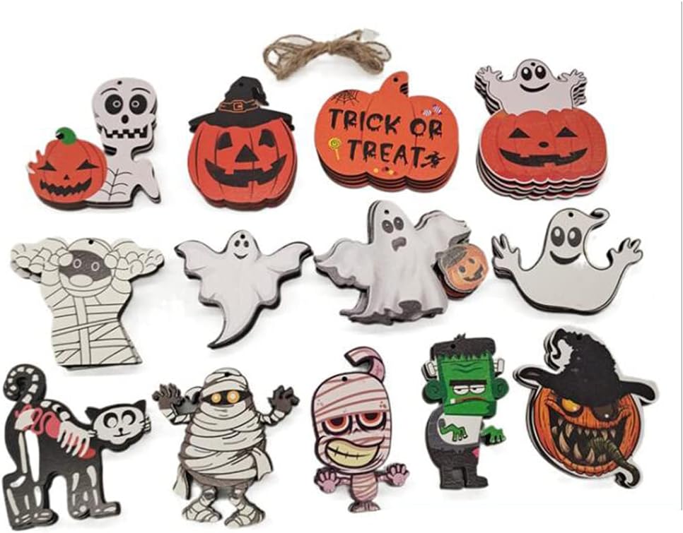 13 diversi modelli da appendere ornamenti in legno con corde in questa confezione. Usa il tema di Halloween: usa mummia, scheletro, zucca e Le classiche decorazioni da appendere di Halloween aggiungono un tocco di atmosfera al festival di Halloween. Realizzato in legno dotato di corde di spago Design del foro: ogni decorazione in legno è progettata con foro, in modo da poterlo facilmente con la corda attrezzata Proprio dove vuoi decorare, facile da usare, crea un'atmosfera gioiosa per la tua festa di Halloween Specifiche Colore legno: come da immagine. Dimensioni: come da immagine. (circa) 5,7 x 9,8 cm, 9,4 x 5,2 cm, 9,8 x 7,1 cm, 11,4 x 8,5 cm, 8,8 x 9,5 cm. x 7,4 cm. 10 x 8,4 cm, 9 x 8 cm, 8,8 x 9,5 cm, 9 x 9,4 cm, 8,6 x 9,8 cm, 9,2 x 9,4 cm, 8,6 x 9,8 cm. 10,2 x 8,5 x 9 cm. Quantità: 1 set