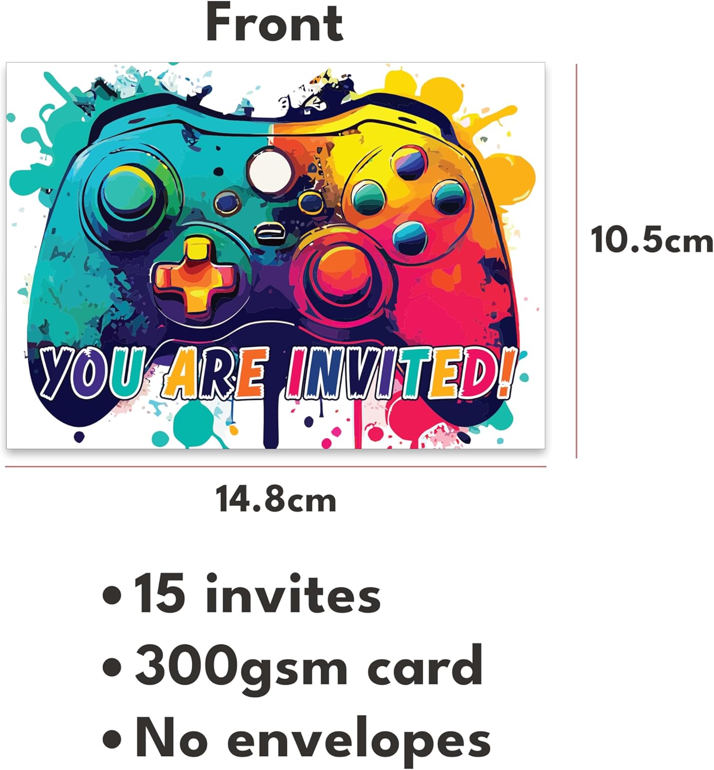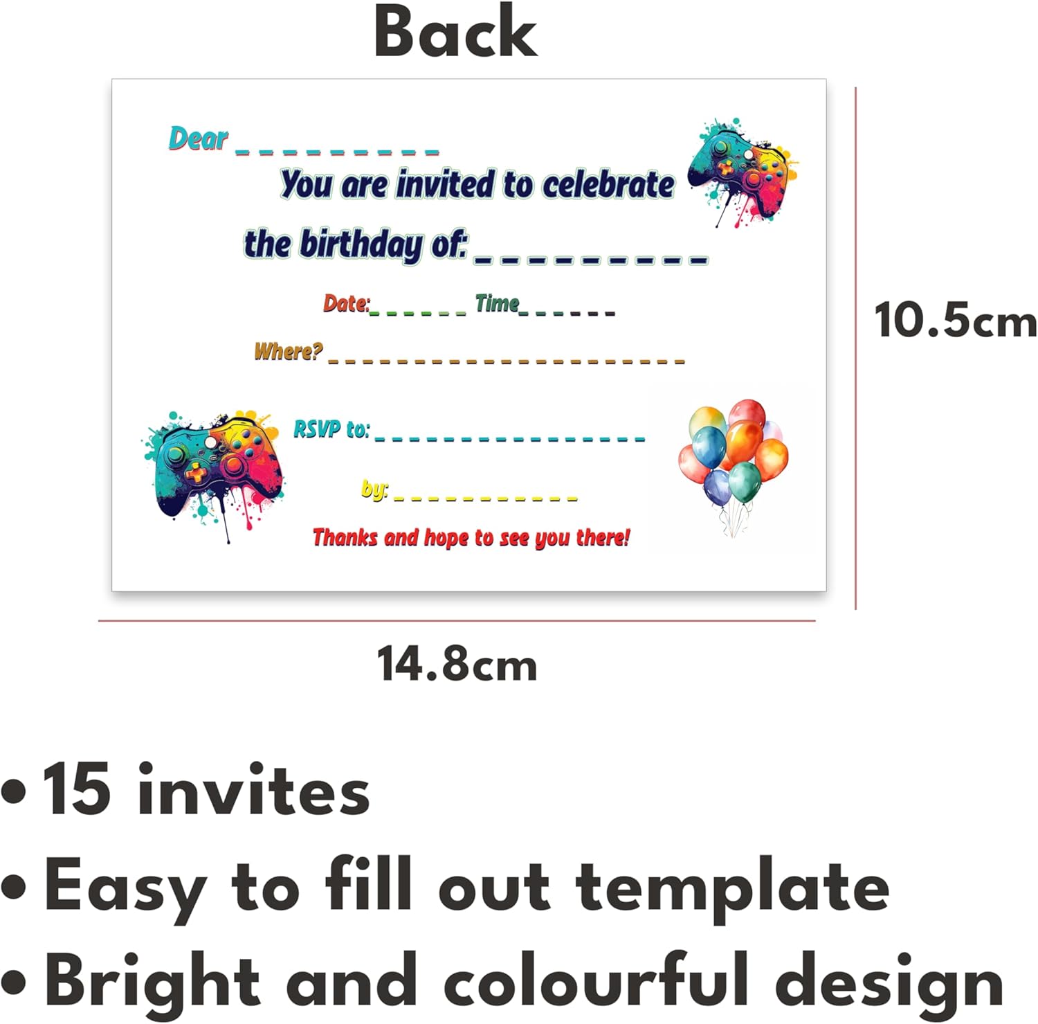 15 biglietti d'invito colorati, luminosi e divertenti. 14,8 cm di larghezza, 10,5 cm di altezza con modello sul retro in modo che siano veloci da riempire. Cartoncino da 300 g/m², bello e luminoso. Si prega di notare che non ci sono buste. Vivaci ed emozionanti: i nostri inviti per feste di compleanno per bambini presentano un design di gioco colorato che attira immediatamente l'attenzione e dà il tono per una festa divertente ed energica, eccitando i giovani ospiti dal momento in cui li ricevono. Appello ai giocatori: perfetti per i giovani appassionati di gioco, gli inviti incorporano elementi e motivi di gioco popolari, rendendoli riconoscibili ed emozionanti per i bambini che amano i videogiochi. Comodo e facile da inviare: i nostri inviti sono progettati per una scrittura facile e veloce, rendendo il processo di invito degli ospiti alla festa di compleanno di tuo figlio semplice e senza problemi. Stampa di alta qualità: stampati su cartoncino premium con colori vivaci e grafica nitida, questi inviti sono durevoli e visivamente accattivanti, facendo un'impressione duratura sui destinatari.