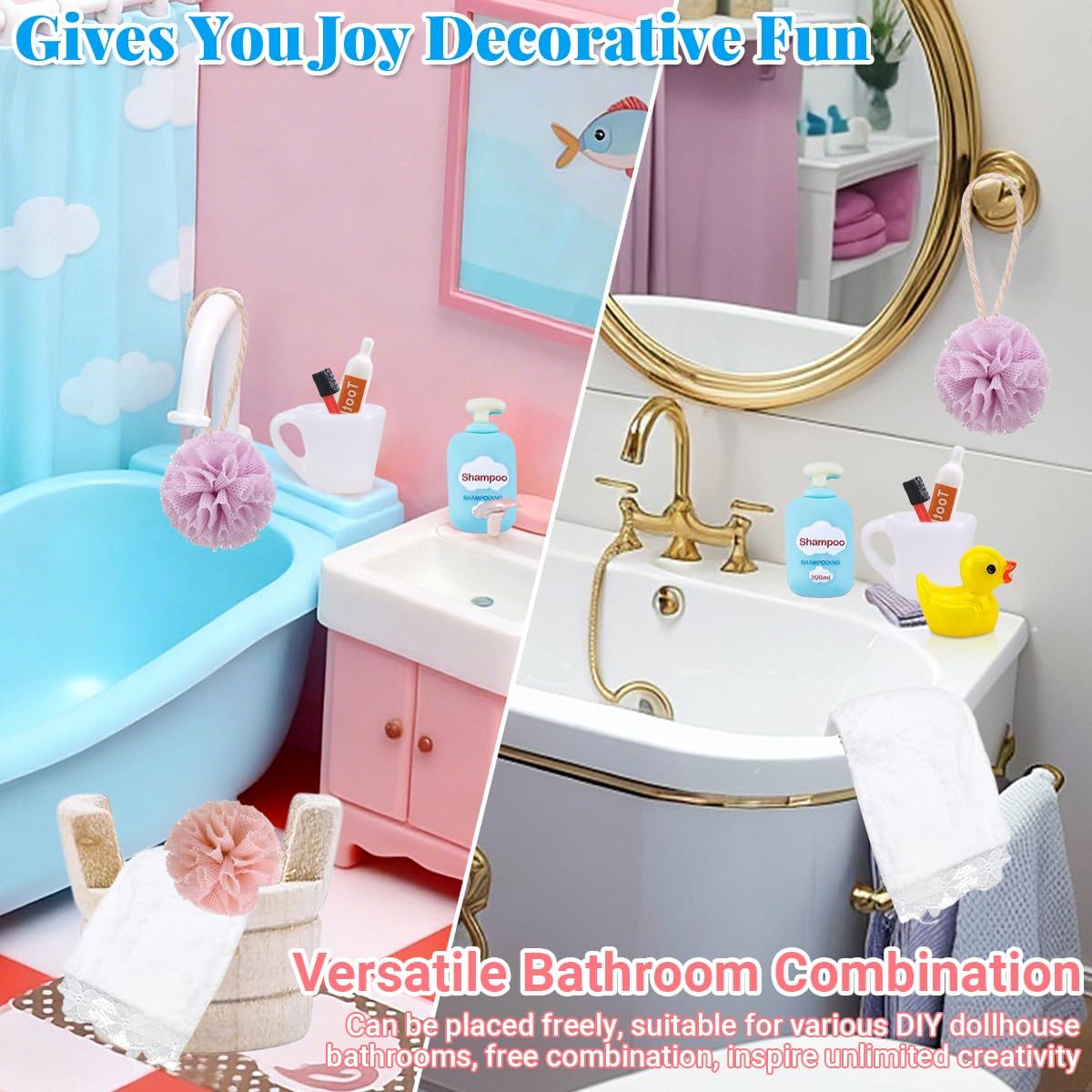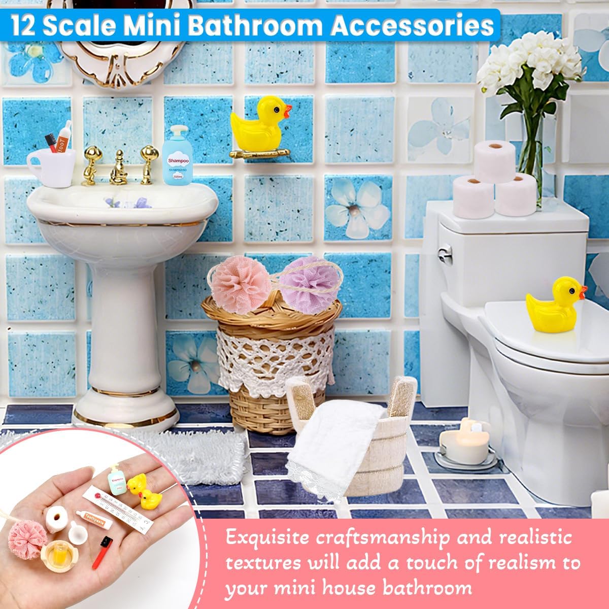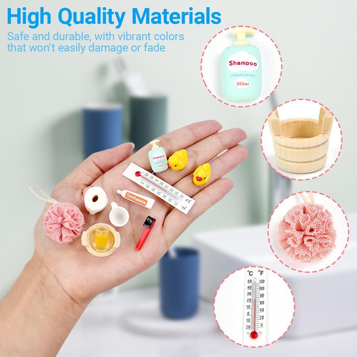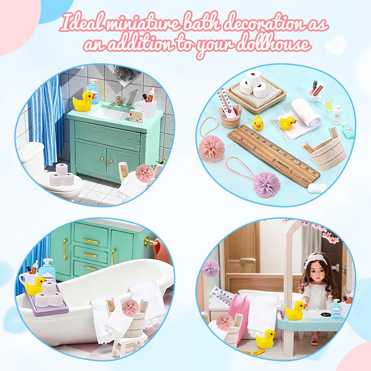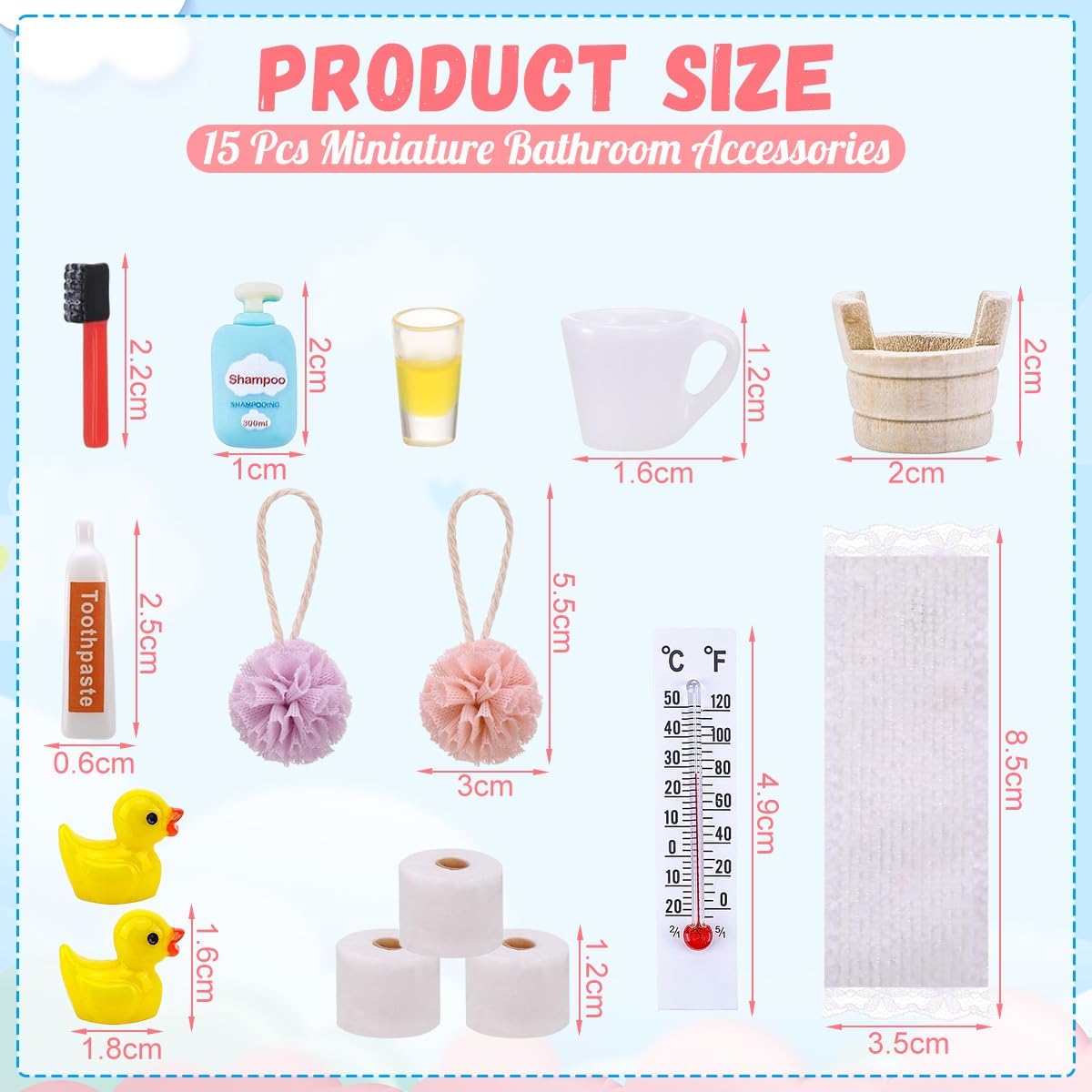 【Set Completo 15 Pezzi | Accessori da Bagno in Miniatura per Porta Gnomo】 Il set include 1 termometro, 1 secchio, 2 palline per bagno, 1 tazza per collutorio, 1 spazzolino da denti, 1 tubetto di dentifricio, 3 rotoli di carta igienica, 2 anatre, 1 asciugamano, 1 tazza e 1 bottiglia di shampoo (15 pezzi totali) di accessori da bagno in miniatura per porta gnomo 【Scala 1:12 con Dettagli Realistici | Estetica Professionale】 Realizzato in scala 1:12, ogni pezzo di questo set di accessori per case delle bambole in miniatura è meticolosamente scolpito e progettato per aggiungere un aspetto accattivante e realistico al bagno della tua casa delle bambole o all'esposizione di miniature, rendendolo l'aggiunta perfetta a qualsiasi spazio abitativo in miniatura 【Materiale Sicuro e Compatto | Spazio Minimo】 Realizzati in materiale sicuro, durevole, con superfici lisce e colori vivaci, garantiscono sicurezza per bambini. Sono compatti e occupano poco spazio, il che li rende accessori ideali per scene in miniatura, offrendo ai bambini un'esperienza di gioco reale e interessante 【Gioco Creativo & Regalo Festivo | Set di Accessori per Casa delle Bambole in Miniatura】 Gli accessori da bagno in miniatura per porta gnomo stimolano l’immaginazione dei bambini, aiutandoli a fare ruolo-play e migliorare creatività. Perfetti come regalo per Natale o compleanni, adatti a bambini che amano costruire "mondi di gnomi" o decorare la loro casa delle bambole 【Decorazione Versatile | Per la Decorazione di Scene in Miniatura】 Gli accessori da bagno in miniatura per porta gnomo sono perfetti per decorare porta gnomo, casa delle bambole, anche per collezioni o decorazioni natalizie. Il set di accessori per mini case delle bambole può migliorare l'atmosfera festiva e ispirare l'immaginazione e la creatività dei bambini, che potranno creare storie magiche per diverse occasioni