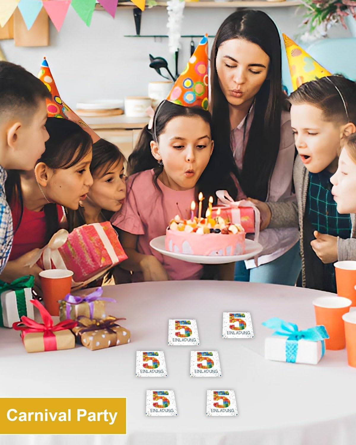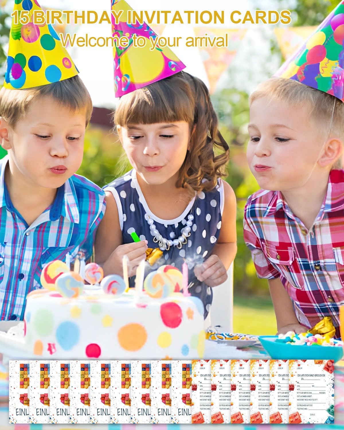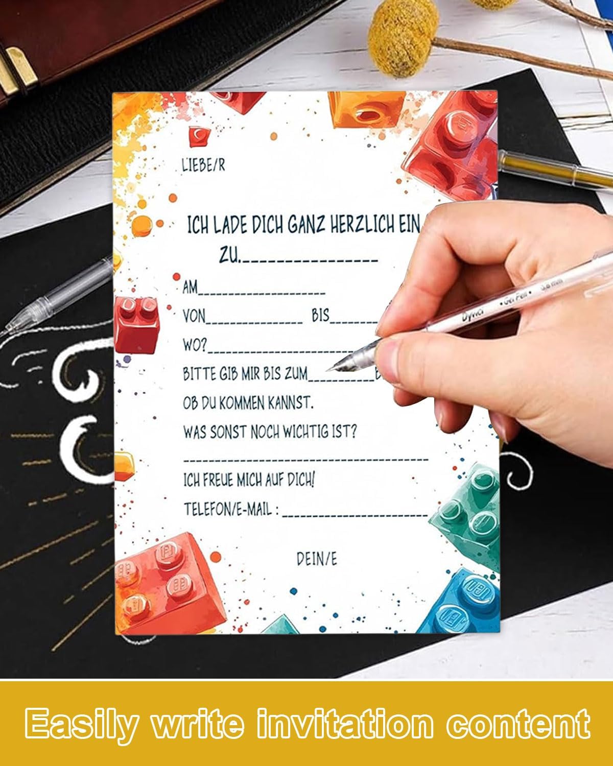 Contenuto della confezione: 15 biglietti d'invito colorati tedeschi in stile mattoncini da costruzione, stampati su entrambi i lati su cartoncino da 300 g in formato DIN A6 (10,5 cm x 14,8 cm). Inoltre riceverete adesivi per le buste in stile e numero corrispondenti. **Si prega di notare che le buste non sono incluse e devono essere acquistate separatamente o preparate autonomamente**. Impressionante: i design unici dei biglietti d'invito faranno stupire i destinatari e lasciano un'impressione duratura. I colori vivaci dei biglietti aumentano l'attesa degli ospiti per la festa o il compleanno del bambino. Creano un'atmosfera allegra e colorata che pone le basi per una giornata piena di divertimento e gioia. Tutti sono entusiasti della propria festa, e nessuno vuole perdere questo incontro. FACILE DA USARE: per evitare confusione nell'organizzazione della festa di compleanno, i biglietti di invito dispongono di campi prefabbricati per comunicare chiaramente informazioni importanti come nome dell'ospite, luogo, lasso di tempo e data. Versatile: che si tratti di compleanno per bambini, inviti a scuola, decorazioni di compleanno, feste in giardino, feste in piscina, feste a tema, feste estive, feste della gioventù, ritorno a scuola o festa dei bambini, i nostri biglietti di invito sono la scelta perfetta per gli amici di ragazzi e ragazze. Team di design professionale: sulla base delle tendenze attuali, progettiamo una varietà di biglietti d'invito alla moda e accattivanti in modo da poter trovare il tuo stile preferito!