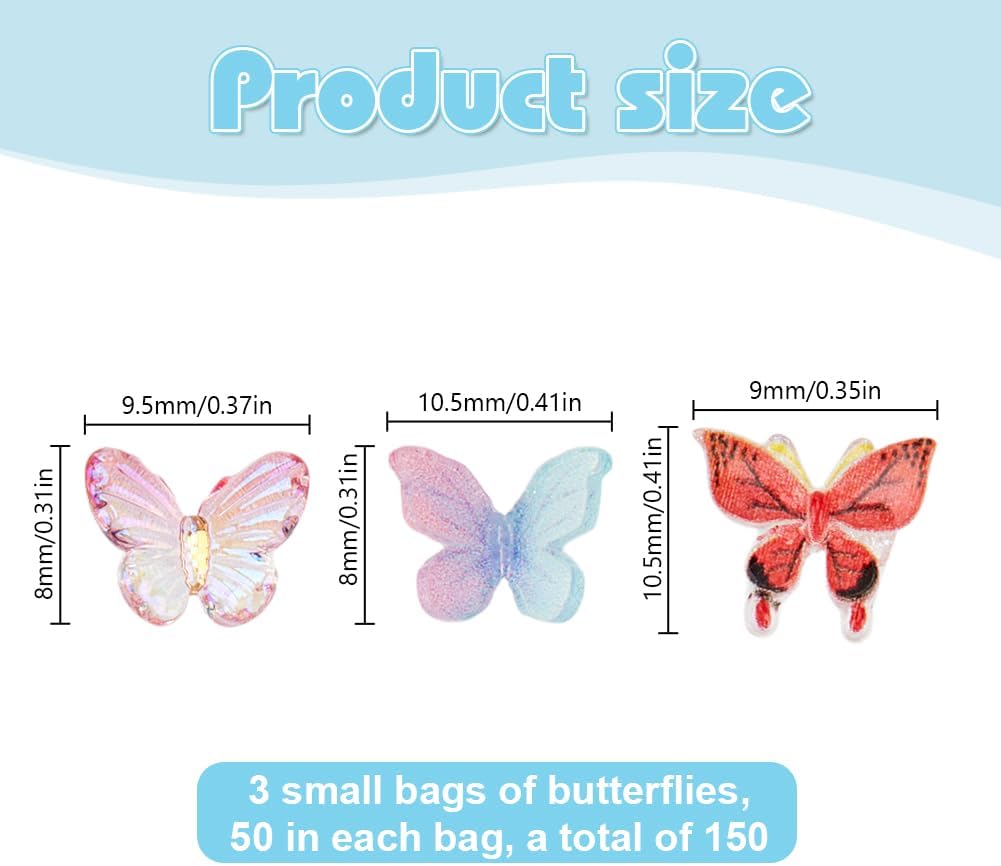 Ricca quantità: il set di decorazioni mini farfalle comprende 150 pezzi di toppe in resina, con abbinamenti di colori intelligenti e forme squisite delle toppe, che possono aggiungere elementi dinamici e carini alla decorazione. Una quantità sufficiente può soddisfare le tue varie esigenze creative. Dimensioni: questo accessorio a farfalla è disponibile in tre dimensioni: 8x9,5x1,5 mm, 9x10,5x3,5 mm e 8x10,5x2 mm, con 50 pezzi per ciascuna dimensione. Compatti e leggeri, non occupano spazio di archiviazione, le diverse dimensioni consentono loro di adattarsi in modo flessibile alle diverse esigenze della scena decorativa. Materiale di alta qualità: realizzato in resina, con superficie liscia, non facile da sbiadire, rompersi o deformarsi e può essere utilizzato a lungo; Queste piccole farfalle in resina hanno una parte posteriore piatta che è facile da attaccare alle decorazioni e ovunque tu voglia attaccarle. Regalo perfetto: queste piccole farfalle in resina possono essere utilizzate per realizzare decorazioni come regali di compleanno, regali di festa, regali di laurea o qualsiasi decorazione tu voglia regalare a chiunque tu voglia, portando sorpresa e calore. I tuoi amici, familiari o compagni di classe saranno deliziati da queste adorabili decorazioni a farfalla. Ampiamente usato: le decorazioni a farfalla sono molto adatte per vari mestieri, non solo per la decorazione delle unghie, ma anche per il fai-da-te manuale, la creazione di album, la decorazione del paesaggio del giardino, le feste, l'esposizione di scene in miniatura e la decorazione della casa, aggiungendo un'atmosfera dolce e piacevole.