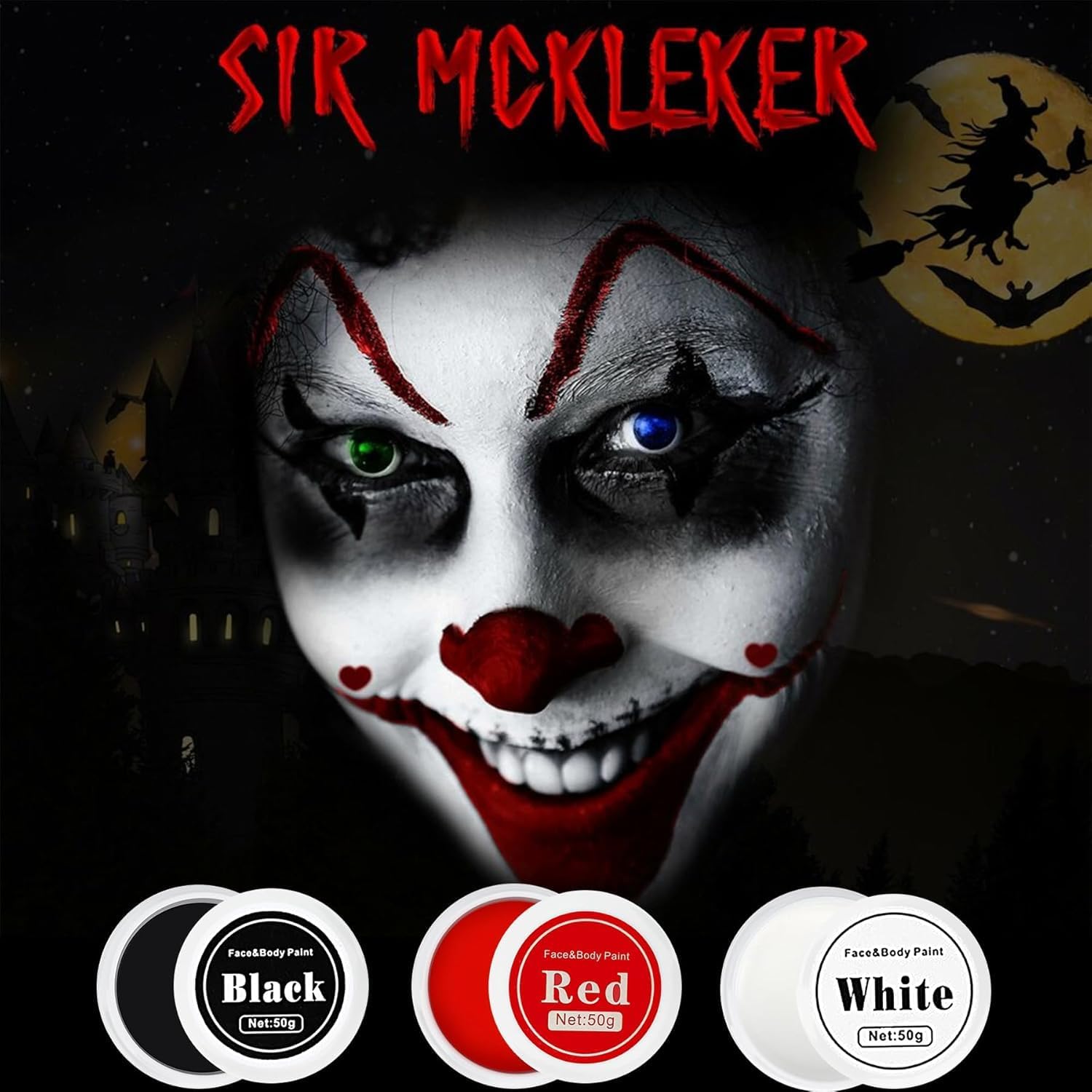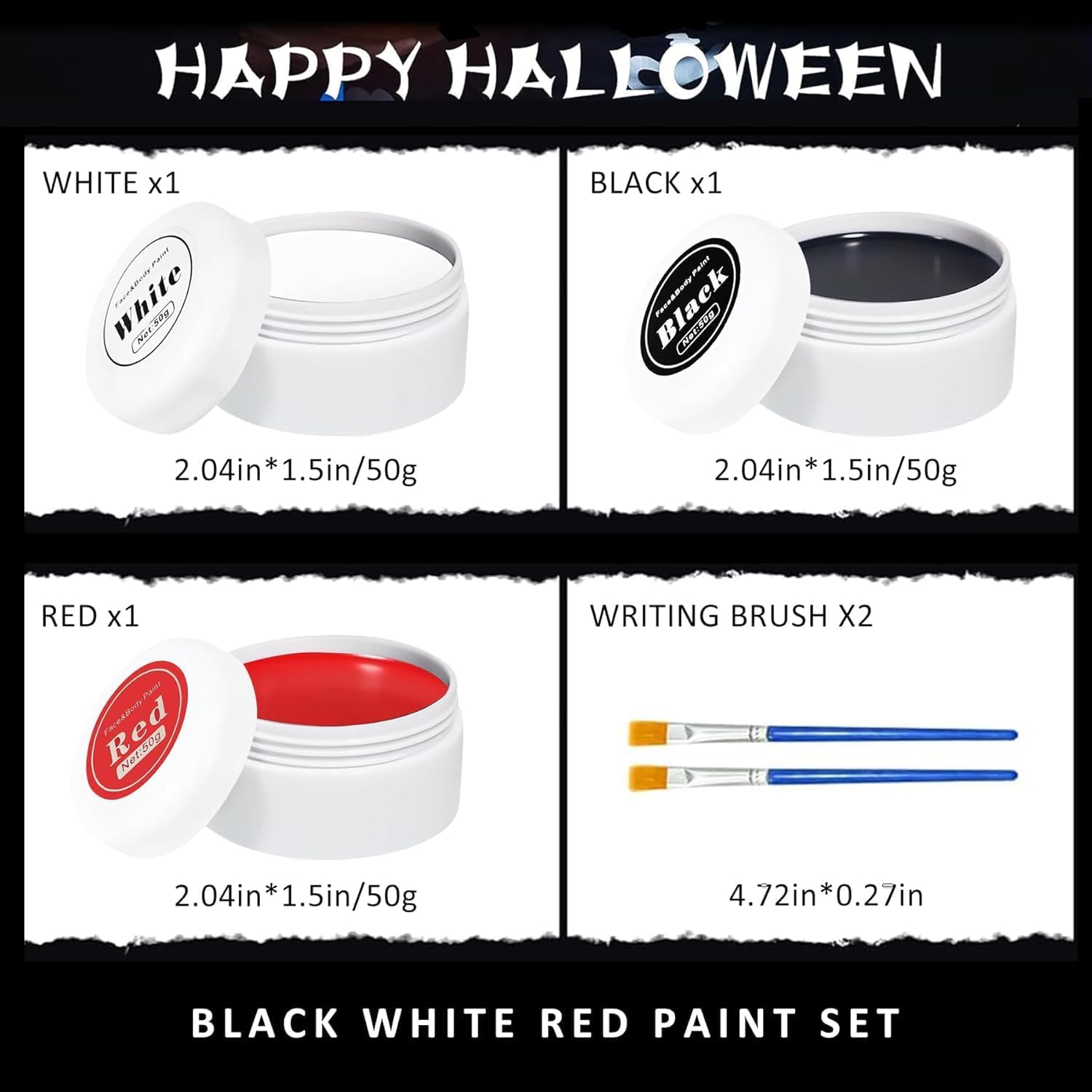 【Set trucco per Halloween】 Questo set trucco per adulti e bambini contiene 50 g ciascuno di vernice nera, bianca e rossa e due piccoli pennelli. Usa i colori singolarmente o mescolali con altri colori per creare il tuo colore preferito, perfetto per giochi di ruolo a carnevali, feste di Halloween e altro ancora. 【Sicuro e duraturo】 Questo set per il trucco di Halloween è realizzato con ingredienti di alta qualità e ha una consistenza morbida e delicata che copre facilmente l'intero viso. I disegni neri, bianchi e rossi sono perfetti per cosplay come clown, scheletro e fantasma. Nota: come per tutti i trucchi, ogni pelle è diversa. Consigliamo quindi di effettuare un piccolo test cutaneo prima dell'uso. 【Facile da applicare】 Questo trucco teatrale di Halloween è facile da applicare e rimuovere: basta usare una spugna, un pennello o le dita. La vernice per il corpo può essere facilmente rimossa con uno struccante professionale. 【Alta pigmentazione】 Questo trucco per il viso è altamente pigmentato, copre efficacemente il tono naturale della tua pelle e protegge il tuo delicato look da festa. Questo trucco a base di olio per bambini è impermeabile e resistente al sudore, quindi si applica comodamente sul viso e sulla pelle e non si secca così rapidamente come la vernice per il viso a base d'acqua. 【Occasioni adatte】 Questo set di trucchi per bambini è adatto a varie occasioni come rave, Halloween, spettacoli teatrali, attività scolastiche o dell'asilo e molto altro. È il trucco perfetto per feste a tema, cosplay, feste di compleanno, spettacoli teatrali e altro ancora!