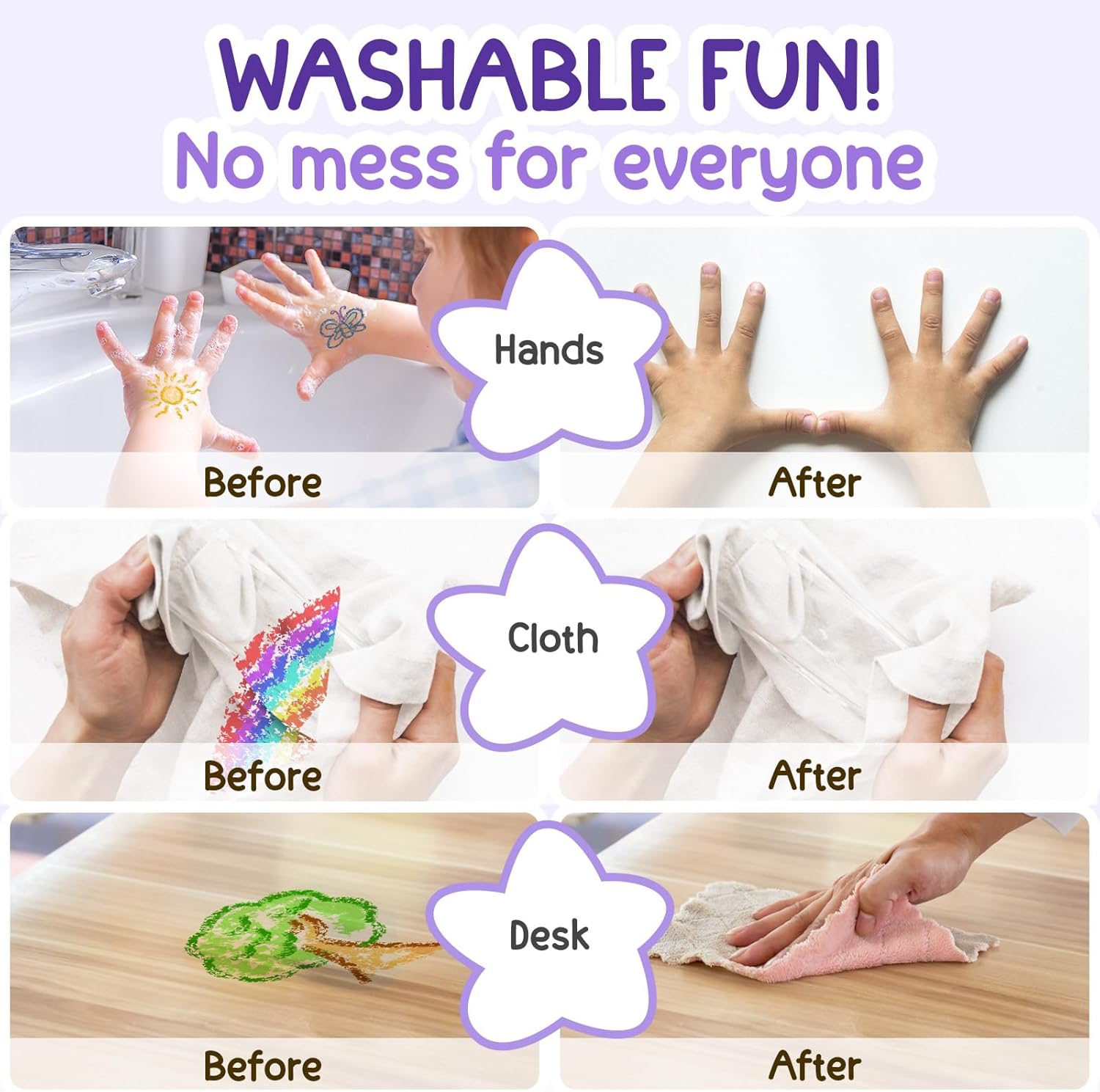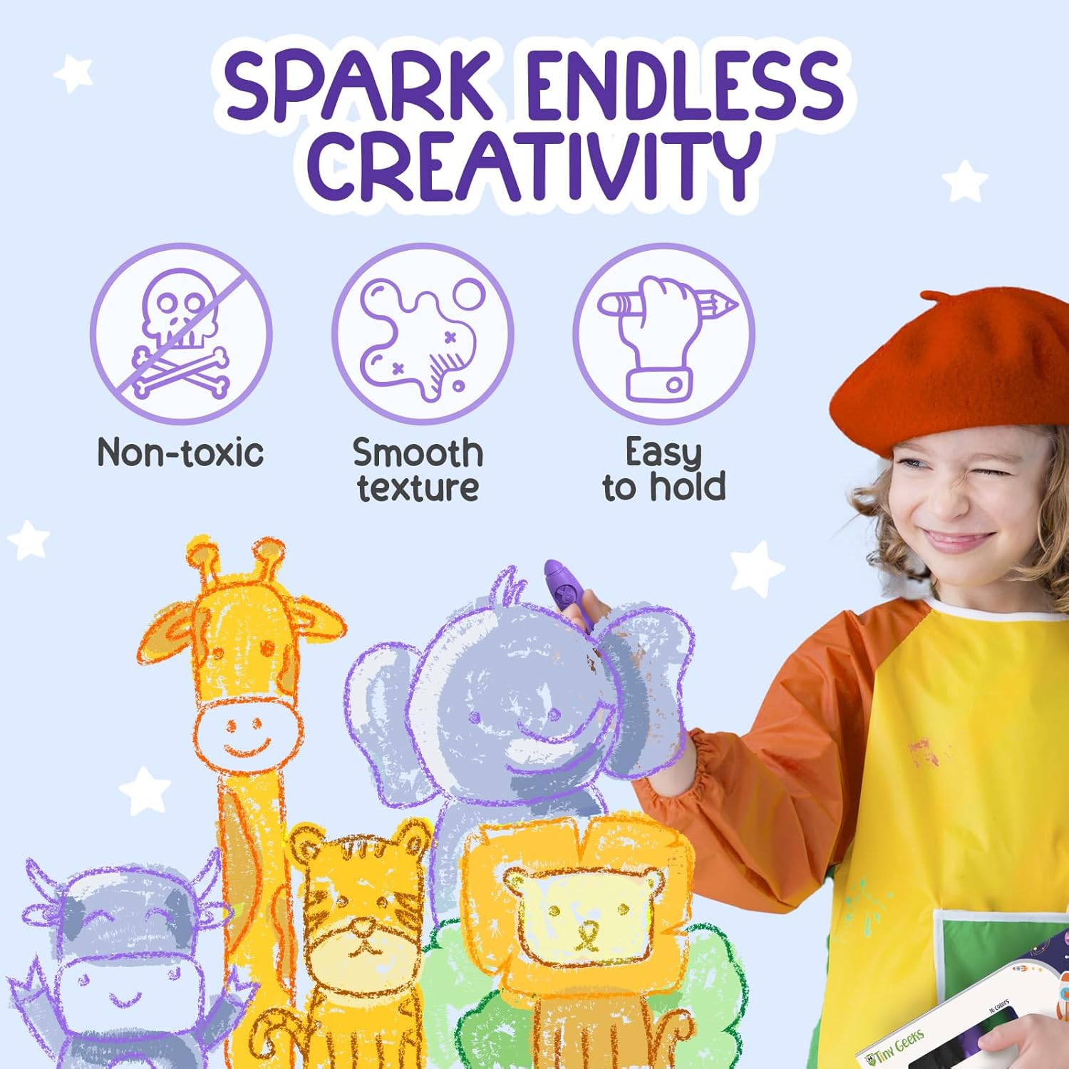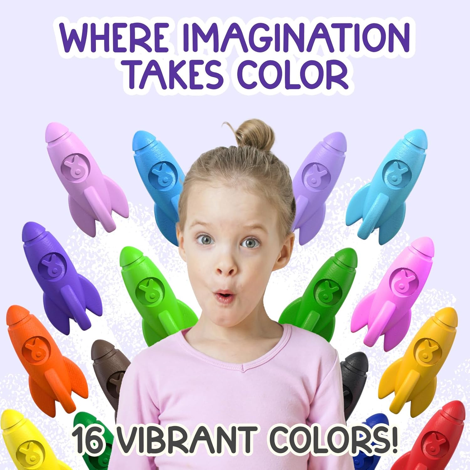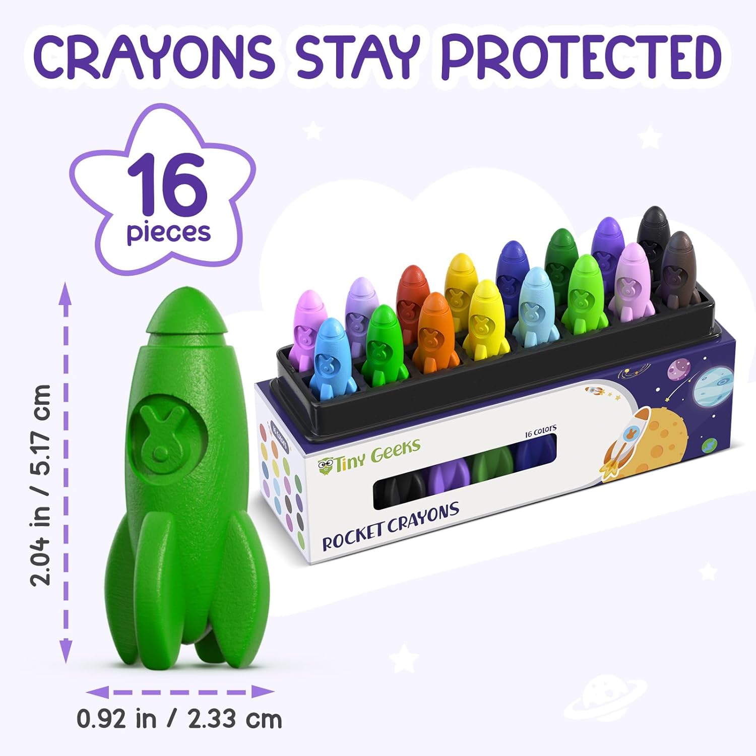 🍃 CRAYON ATOSSICI PER BAMBINI: I nostri crayon sono realizzati con cere naturali, privi di amianto, piombo e ftalati, e sono delicati sulla pelle dei bambini. Perfetti per i piccoli artisti, questi crayon per bambini sono sicuri e atossici, consentendo divertimento senza preoccupazioni. Ricorda di sorvegliare i bambini sotto i 3 anni durante l'uso. 🫳 FACILI DA IMPUGNARE: Il nostro set di colori per bambini è progettato per mani piccole. La loro forma arrotondata li rende facili da impugnare e controllare, mentre la loro robusta costruzione garantisce che resistano all'entusiasmo creativo dei più piccoli e durino a lungo! 🌈 16 COLORI VIBRANTI: Libera la creatività del tuo bambino con questo set di 16 pastelli colorati brillanti! Ogni colore è un'avventura da scoprire, perfetto per stimolare l'immaginazione e sviluppare le abilità artistiche. 🧽 DIVERTIMENTO LAVABILE: nostri crayon lavabili sono i migliori amici dei genitori! Si lavano facilmente da pelle, vestiti e pareti con acqua tiepida e sapone neutro, senza lasciare macchie ostinate 🚀 VERSO L'INFINITO E OLTRE: Questi pastelli a forma di razzo sono perfetti per i piccoli astronauti! Possono disegnare mondi fantastici e inventare storie incredibili.