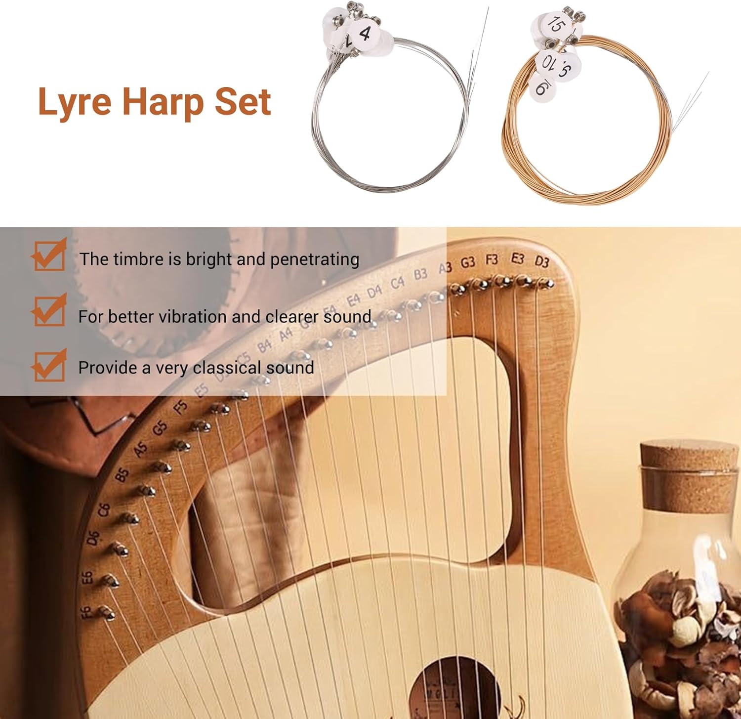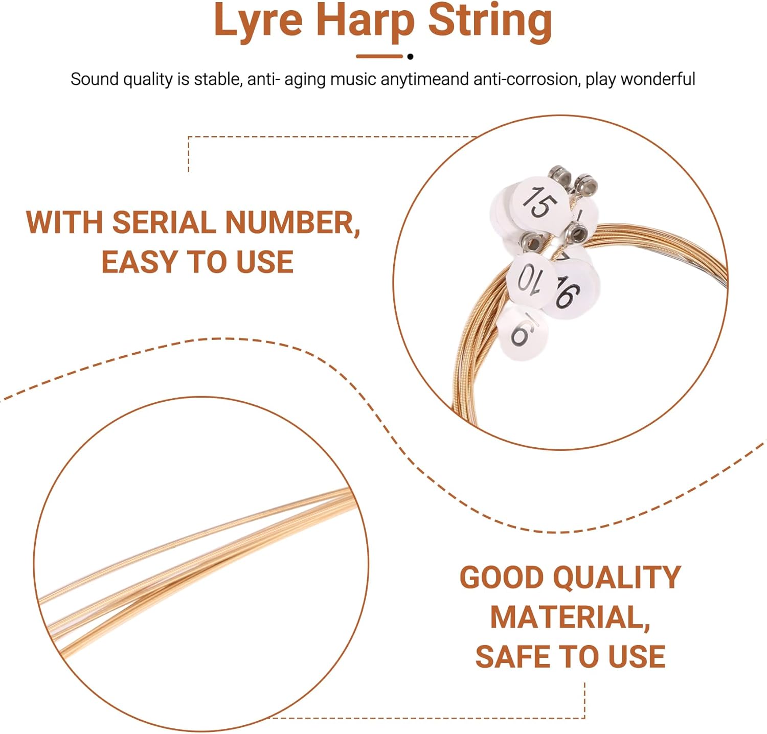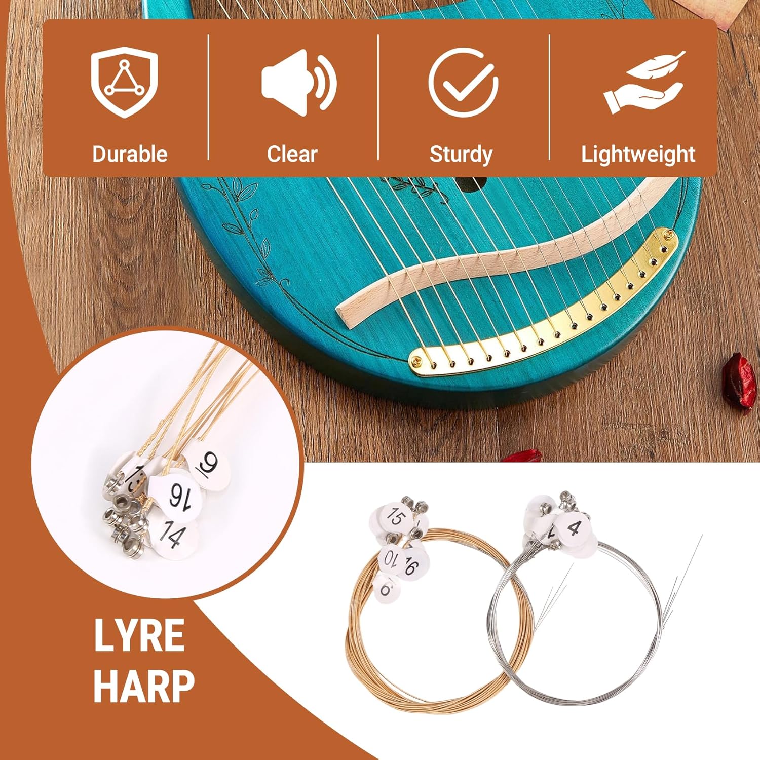 Adatto per lira .t WH-16. Set di corde di lira, 16 pezzi / set. Corde metalliche resistenti con estremità a sfera. Fornire un suono molto .