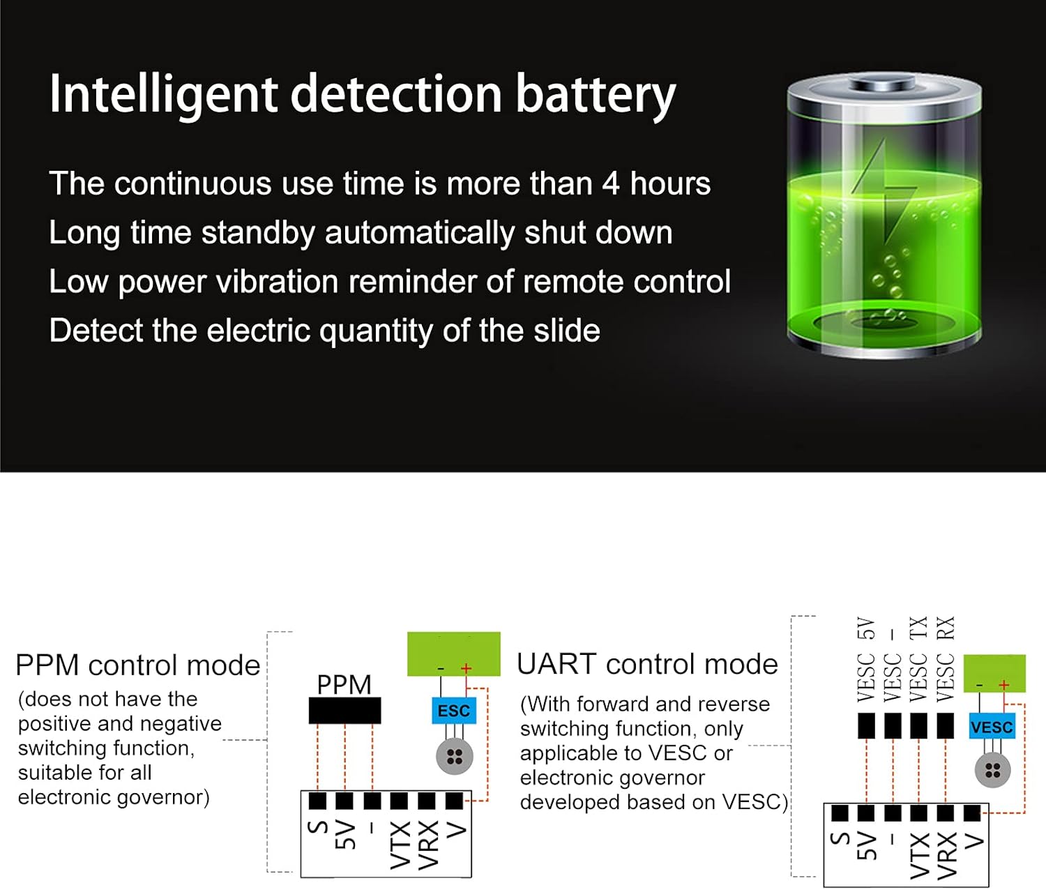 Il ricevitore da 2,4GRF auto equipaggiato può essere adattato alla maggior parte degli ESC, eliminando la tradizionale configurazione individuale, con un'applicazione più ampia e un segnale più forte. Il telecomando per skateboard elettrico ha una buona sensazione di manuale, adotta il trattamento con spray di superficie ABS, può efficace anti -slittamento. Una forte capacità anti -interferenza e l'intervallo di applicazione è più ampia e il segnale è forte. Realizzato in alta qualità, quindi è resistente al calore e resistente alla corrosione. Applicabile per V4 o per V6. Batteria di rilevamento intelligente, il tempo di utilizzo continuo è più di 4 ore.