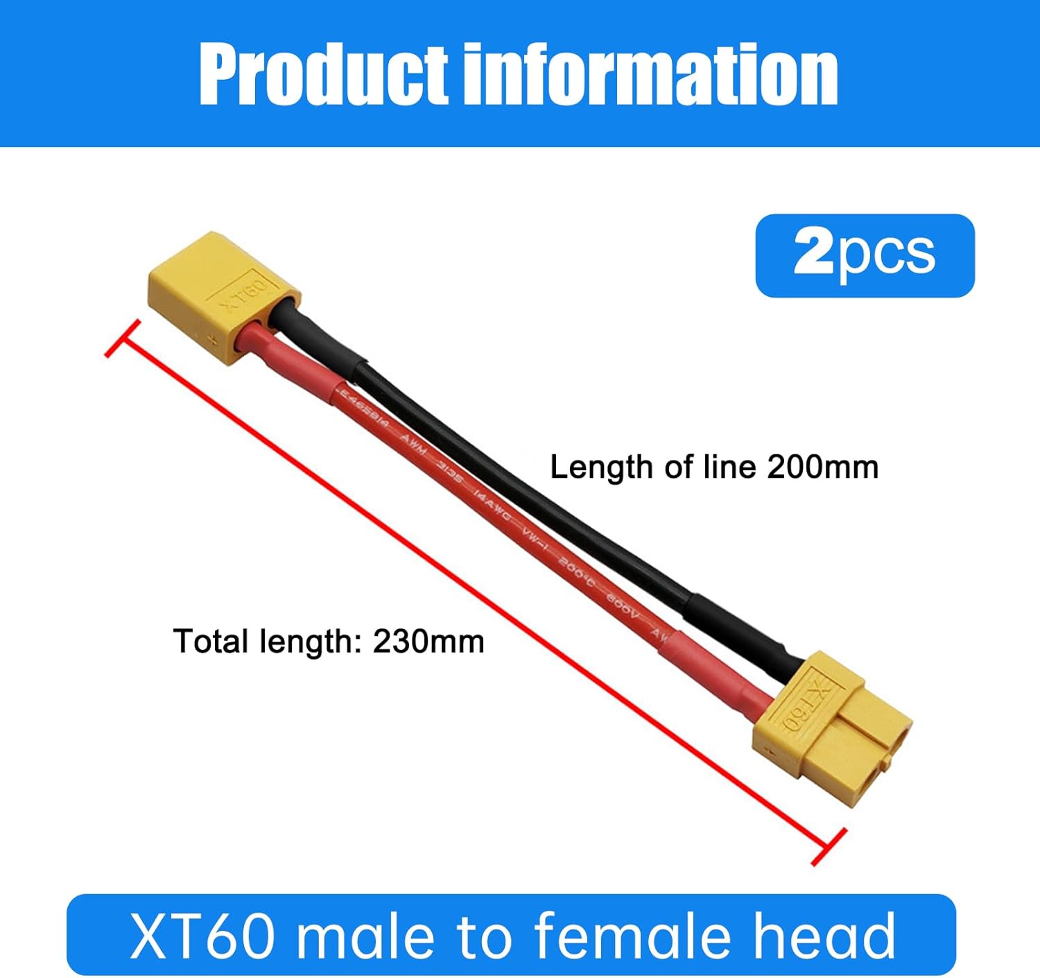 Utilizzato come adattatore o cavo di prolunga. Adattatore prolunga XT60 XT60 maschio a XT60 femmina Cavo: 20 cm Quantità: 2 pezzi