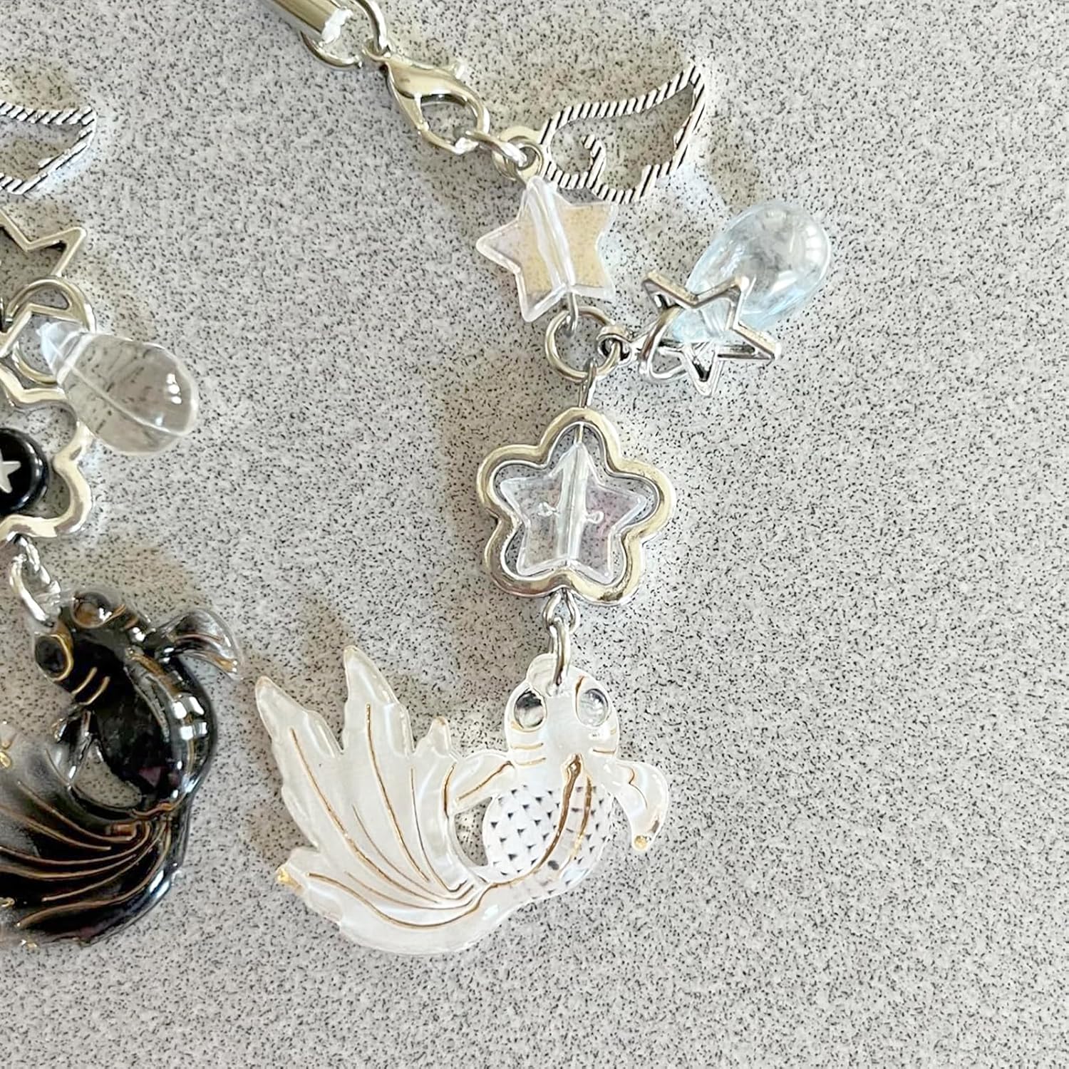 Dimensioni ideali: con una lunghezza di circa 13 cm, questi ciondoli per cellulare sono della dimensione perfetta per essere attaccati a diversi oggetti senza risultare troppo grandi o troppo piccoli. Offrono l'equilibrio ideale tra funzionalità ed estetica. Materiale di alta qualità: realizzati in leghe durevoli e perle acriliche di alta qualità, questi ciondoli per cellulare sono robusti, resistenti ai colori e dotati di un nastro forte che non si rompe facilmente. Goditi una lunga durata di utilizzo senza doverti preoccupare dell'usura. Utilizzo versatile: queste catene versatili per cellulari non solo possono abbellire il vostro cellulare, ma anche essere utilizzate come ciondolo per borsa, portachiavi o gioielli per borse, fotocamere e altri accessori. Perfetto per l'uso quotidiano per aggiungere un tocco personale al tuo stile. 【Eccellente design Y2K: questi ciondoli per cellulare sono caratterizzati da un design unico con motivo koi e perle di stelle. Aggiungono un tocco di stile retrò Y2K ai tuoi accessori e rendono il tuo cellulare, borsa o portachiavi un vero colpo d'occhio. Regalo perfetto: questi simpatici ciondoli per cellulare non sono solo un ottimo accessorio, ma anche un regalo meraviglioso per la vostra fidanzata, mamma o sorella. Ideale per occasioni come Natale, festa della mamma, laurea, San Valentino, compleanni o semplicemente come piccola sorpresa quotidiana.