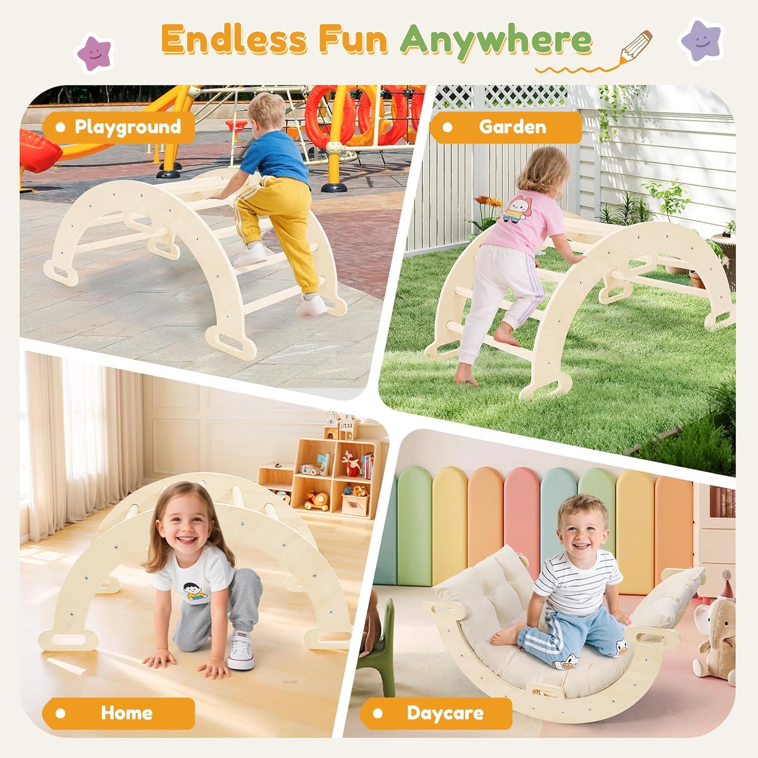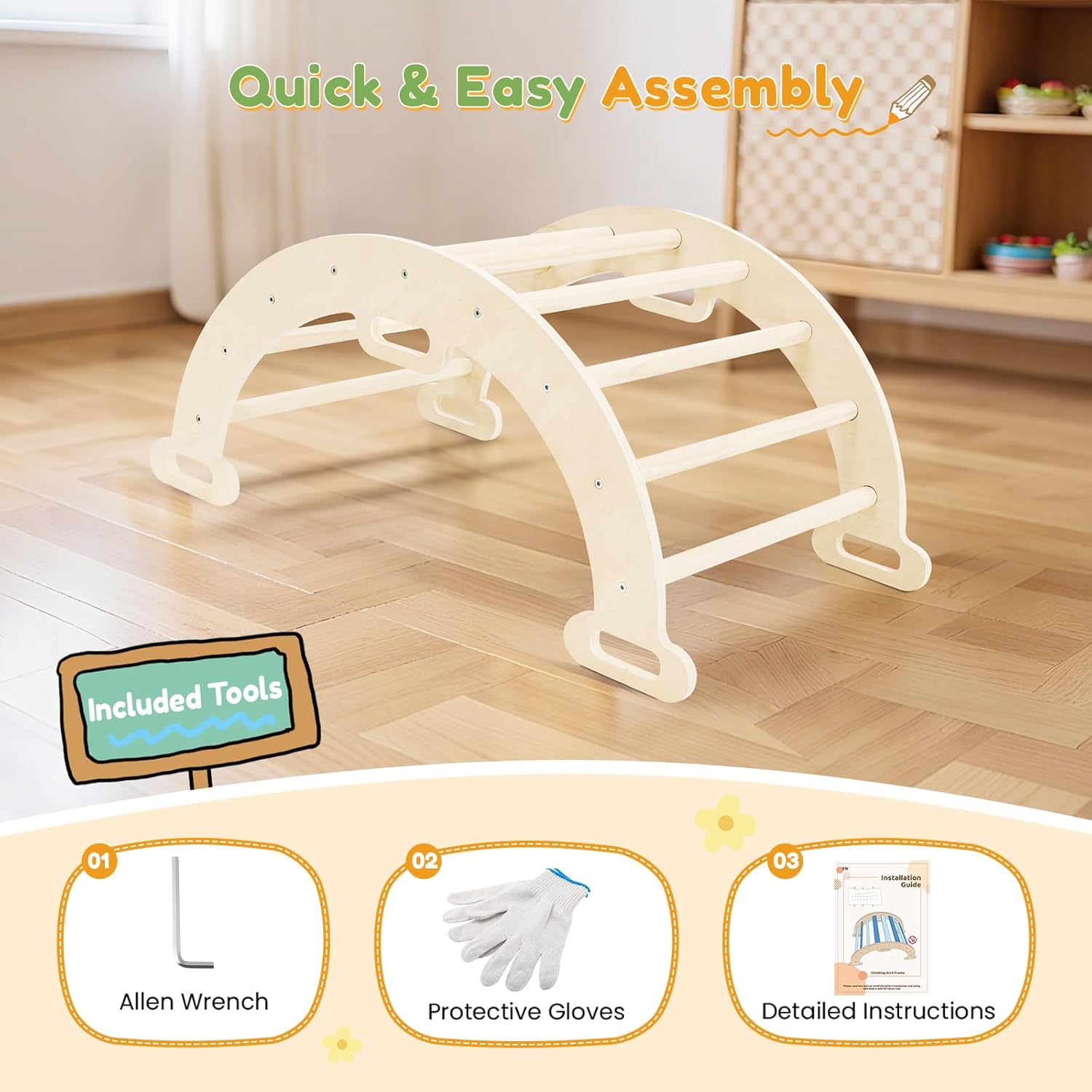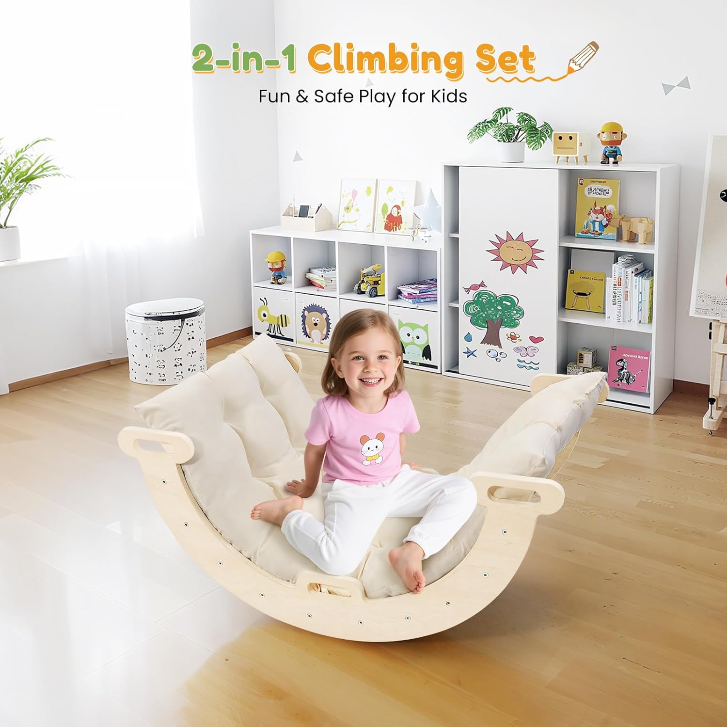 Arco da arrampicata versatile per piccoli avventurieri: questo versatile arco da arrampicata è perfetto per i giovani esploratori – funge da scala, sedia a dondolo e canale di scorrimento in uno! Stimola l'arrampicata e l'attività fisica, offre un'esperienza di oscillazione divertente e rilassante e addolcisce il gioco con un emozionante canale di creep. Che si tratti di correre, bilanciare o giocare, questo garantisce ore di divertimento e allo stesso tempo promuove lo sviluppo fisico. Arco da arrampicata con cuscino - Massimo comfort: questo arco da arrampicata in legno (legno ladder arch for climbing) viene fornito con un morbido cuscino in 100% cotone naturale - delicato sulla pelle, traspirante e incredibilmente confortevole. Il cuscino si adatta perfettamente alla parte a dondolo dell'arco da arrampicata, in modo che i bambini non si sentano mai a disagio anche in caso di altalene prolungate o persistono sull'arco da arrampicata. Nessun punto di pressione, nessun tocco sgradevole – solo puro piacere di giocare con un comfort ottimale Forte arco da arrampicata per bambini, portata fino a 110 libbre: realizzato in legno massiccio ed ecologico, questo arco da arrampicata per bambini si distingue per la sua stabilità e durata superiori, può trasportare in modo sicuro fino a 110 libbre (circa 50 kg)! La superficie liscia e arrotondata elimina spigoli vivi o sbavature e le articolazioni saldamente avvitate impediscono qualsiasi movimento traballante. Questi dettagli di sicurezza ben studiati lo rendono un compagno di gioco affidabile su cui i genitori possono contare. Arco da arrampicata Montessori, divertente da giocare: il nostro arco da arrampicata Montessori per bambini (Montessori Climbing Arch for toddlers) combina tempo di gioco con uno sviluppo sostenibile: riduce il tempo sullo schermo, promuove la creatività, migliora le capacità motorie e la coordinazione occhio-mano e le abilità sociali giocando insieme. Essendo un tipico giocattolo Montessori, guida i bambini verso scoperte indipendenti: ogni arrampicata, bilanciamento o altalena diventa un'esperienza di apprendimento. Struttura da arrampicata per interni ed esterni, utilizzabile in modo flessibile: i nostri giocattoli Montessori sono ideali per bambini a partire dai 3 anni e sono adatti anche come arco da arrampicata a partire da 1 anno (sotto la supervisione dei genitori). Questa struttura da arrampicata per interni può essere facilmente installata in salotti, camere da letto, stanze dei giochi o in giardino; non sono necessari strumenti complicati, il montaggio è rapido a mano. Sia al chiuso in caso di maltempo o all'aperto al sole, l'arco da arrampicata si adatta a qualsiasi ambiente e garantisce sempre un divertimento variegato!