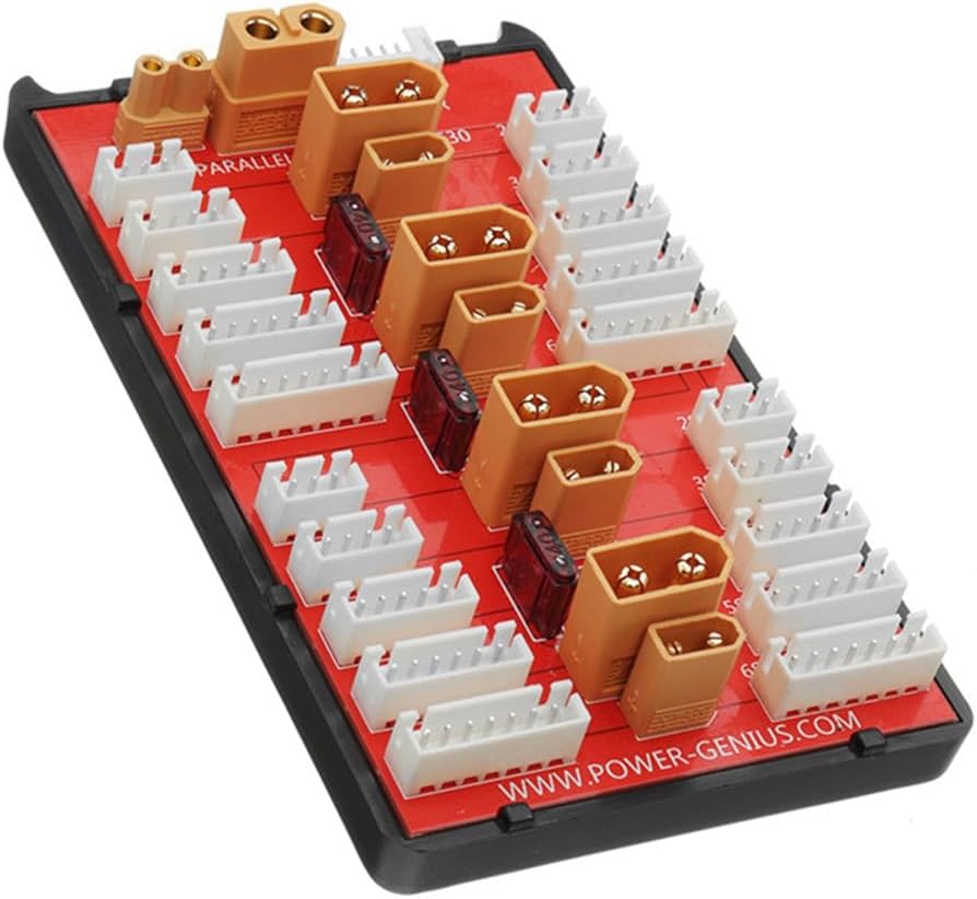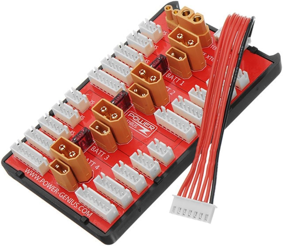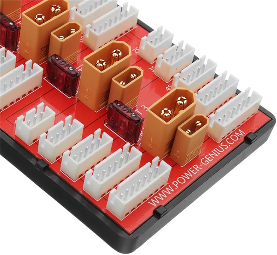 4. Foglio di rame PCB ispessito, consente una corrente di carica di 35 A 3. Connettori placcati in oro di alta qualità. 1. Supporta fino a quattro batterie dello stesso tipo e celle con batterie 2-6S. 2. Linea di uscita con connettore bilanciato e cavo in silicone multipolare 18AWG. 5. Dotato di un fusibile da 40 A tra tutti i gruppi di batterie per evitare che la linea si bruci a causa dell'elevata pressione della batteria.