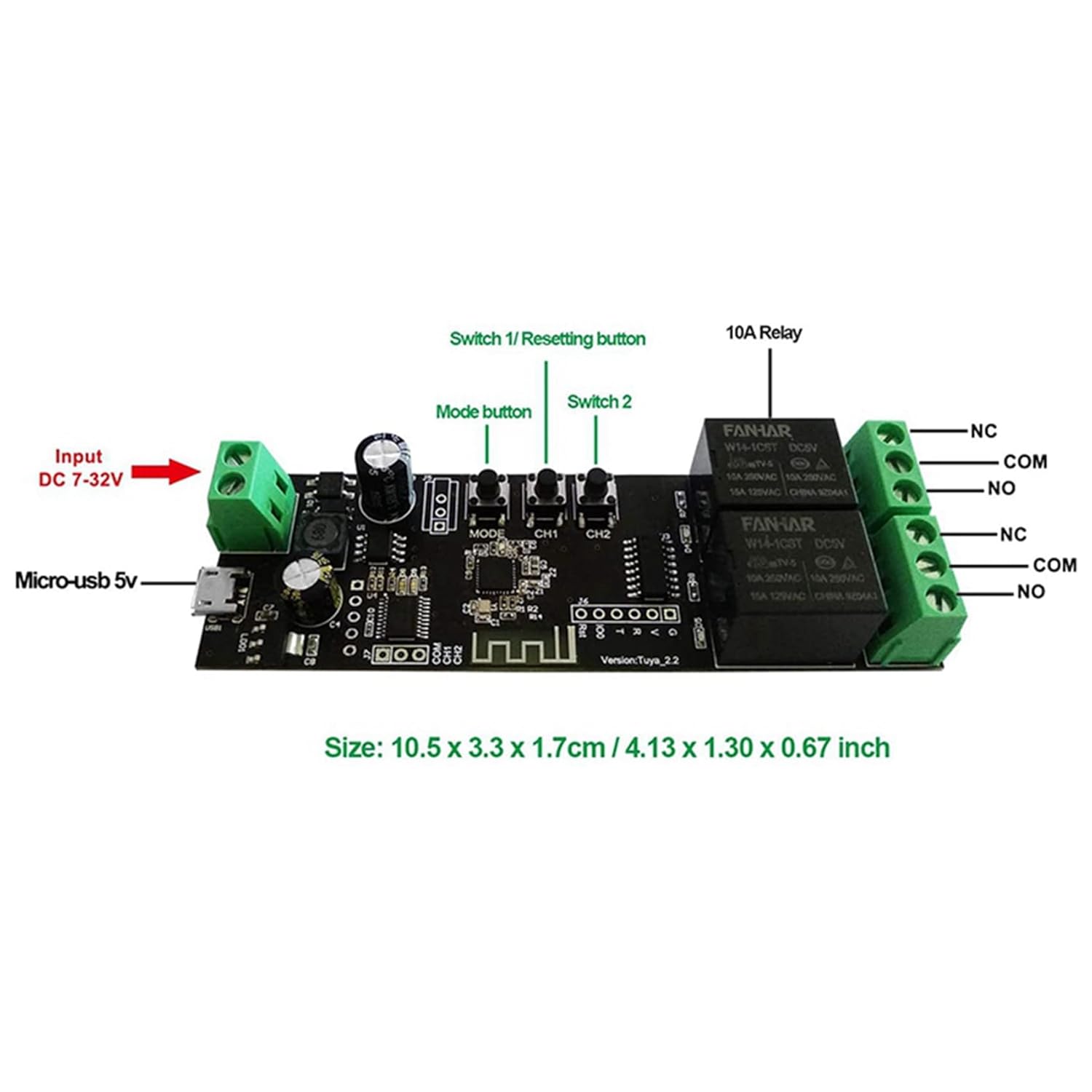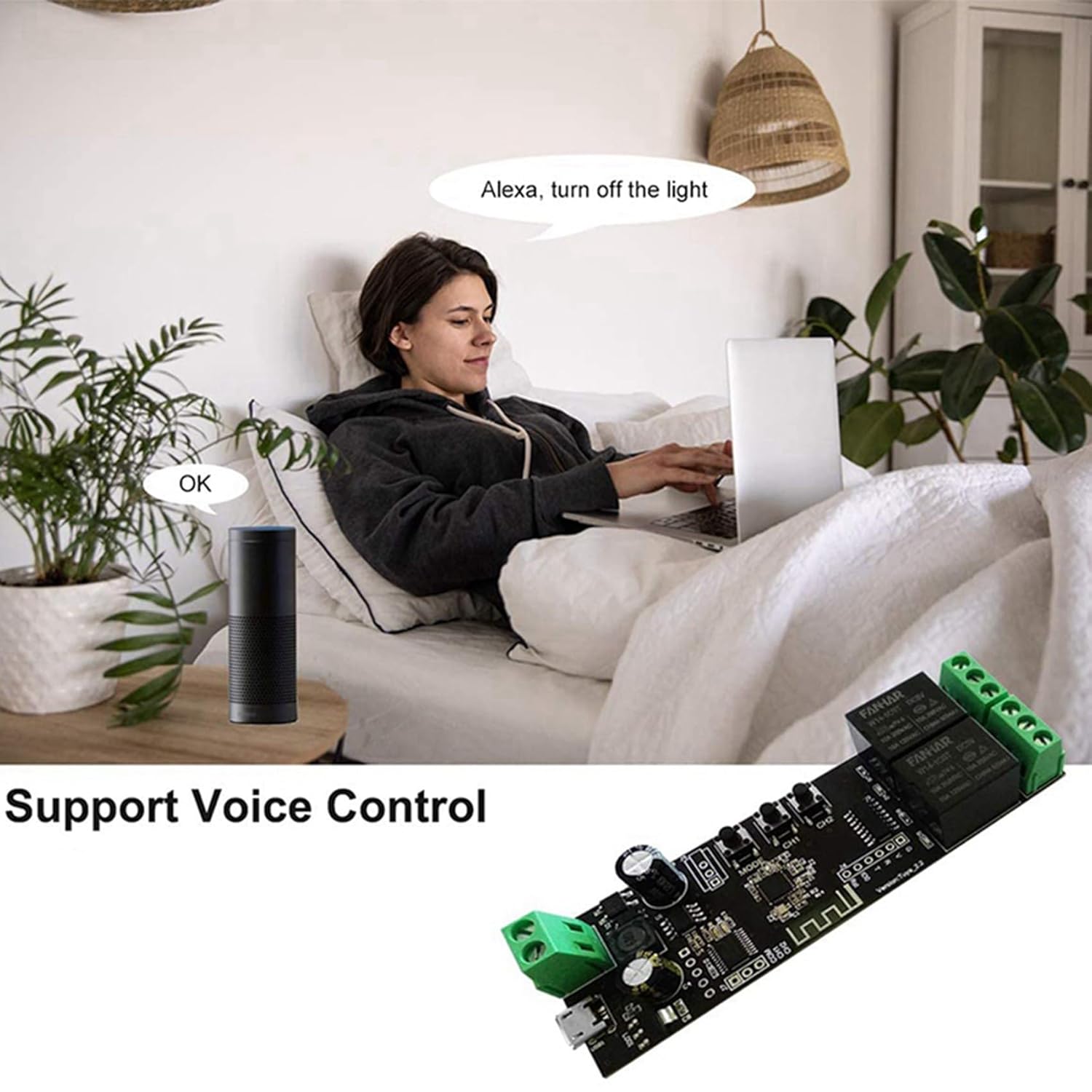 Suddivisione dei dispositivi: fai da te la tua Smart Home, supporta l'accensione e lo spegnimento del , orari, condivisione del dispositivo, facile condivisione, tutte le famiglie possono controllare gli elettrodomestici tramite l'app Smart Life / Tuya. Funziona da qualsiasi luogo in cui si dispone di una connessione Internet. SELEZIONE DELLA MODALITÀ DISPOSITIVO - Questo interruttore wireless supporta la modalità di blocco / autobloccante. In modalità autobloccante, si preme il pulsante sull'APP (o il pulsante manuale scheda) una volta, il relè è acceso. Il relè si spegne solo si preme nuovamente il pulsante. Controllo remoto e controllo vocale: lo Smart Switch WiFi funziona perfettamente con dispositivi abilitati come / Tap / Dot e per la casa. Lavorare con un semplice vocale o per assistente per voi e accendere / spegnere i dispositivi collegati. Configurazione semplice: basta collegare il USB, scaricare l'app Smart Life / Tuya in o nel Play Store, registrare un account e seguire le istruzioni per completare la configurazione WiFi. Modulo interruttore fai da te: qui puoi creare molti progetti intelligenti da solo: luci intelligenti, ventole, porte da garage, umidificatori, termostato, ecc.