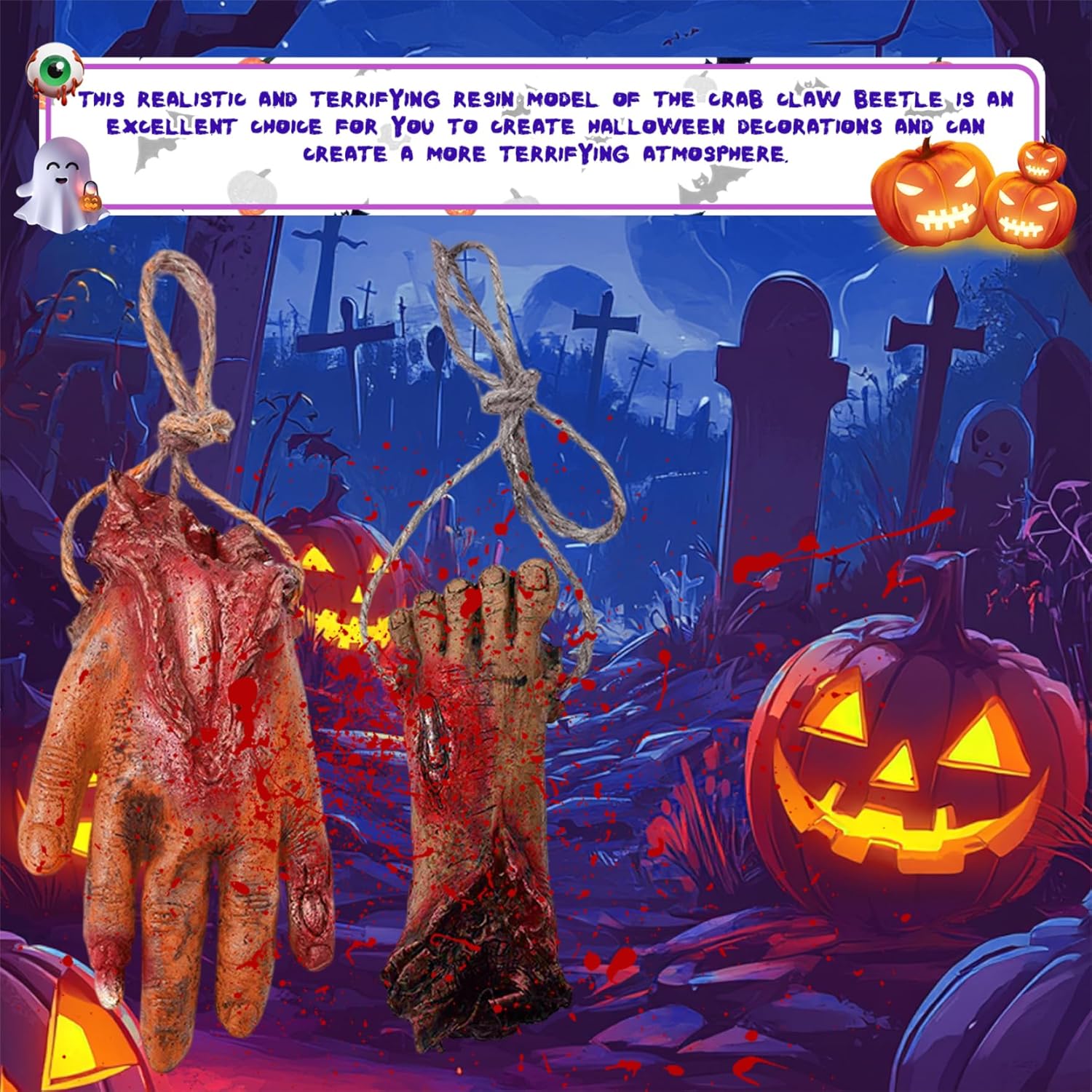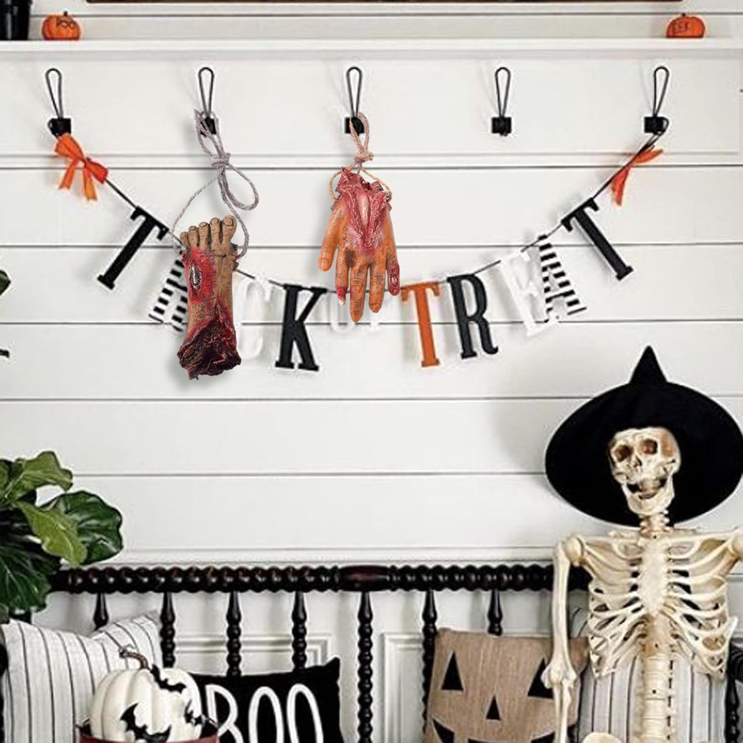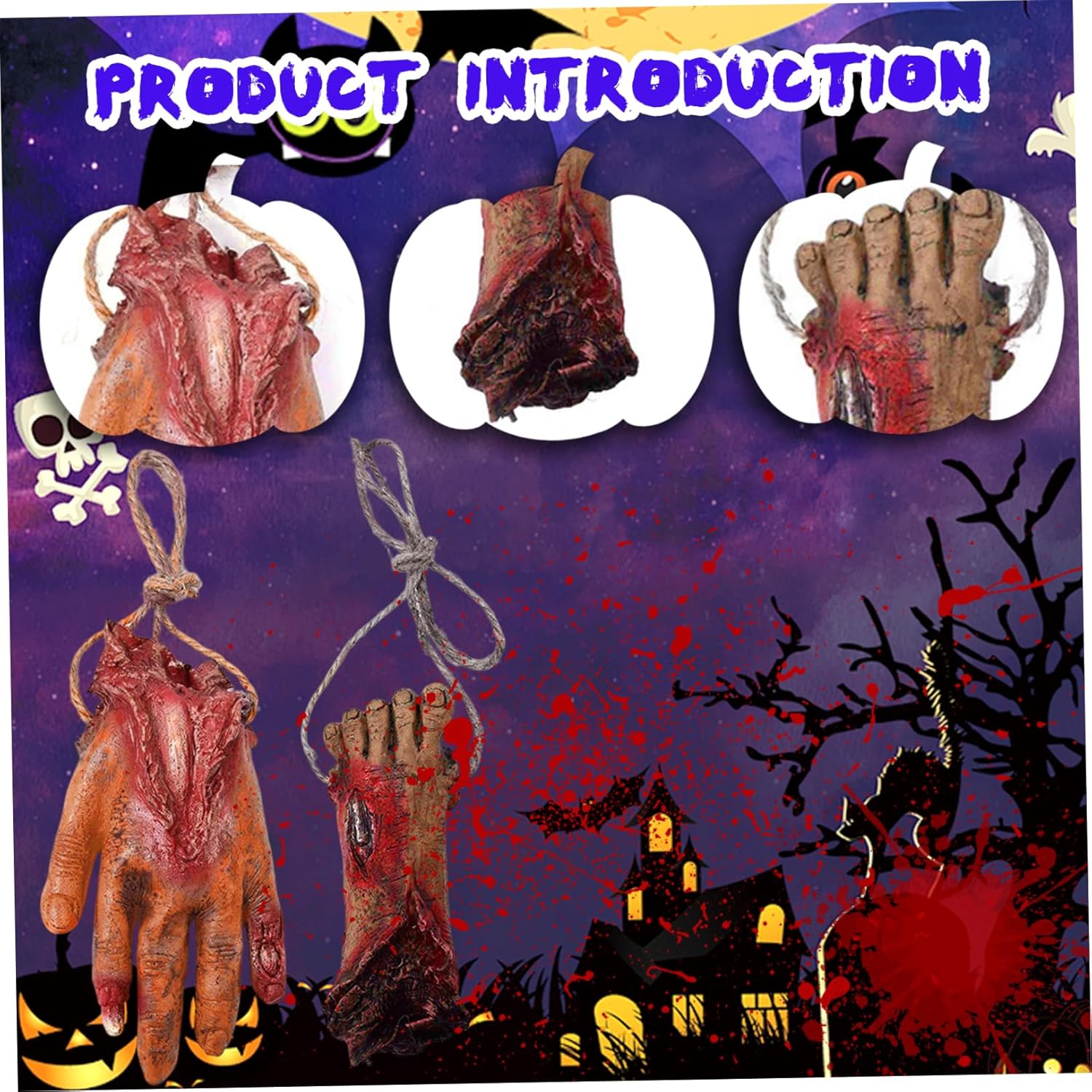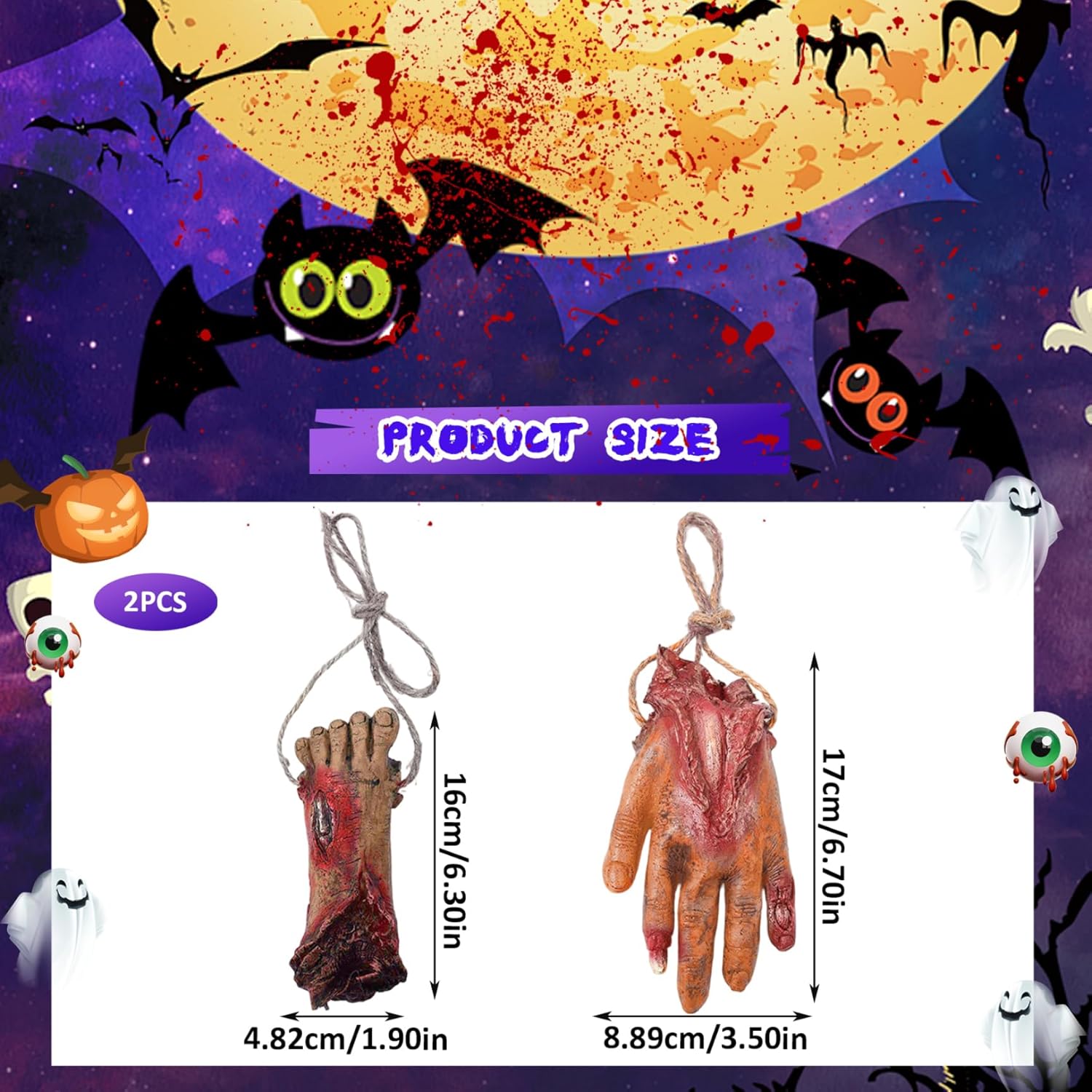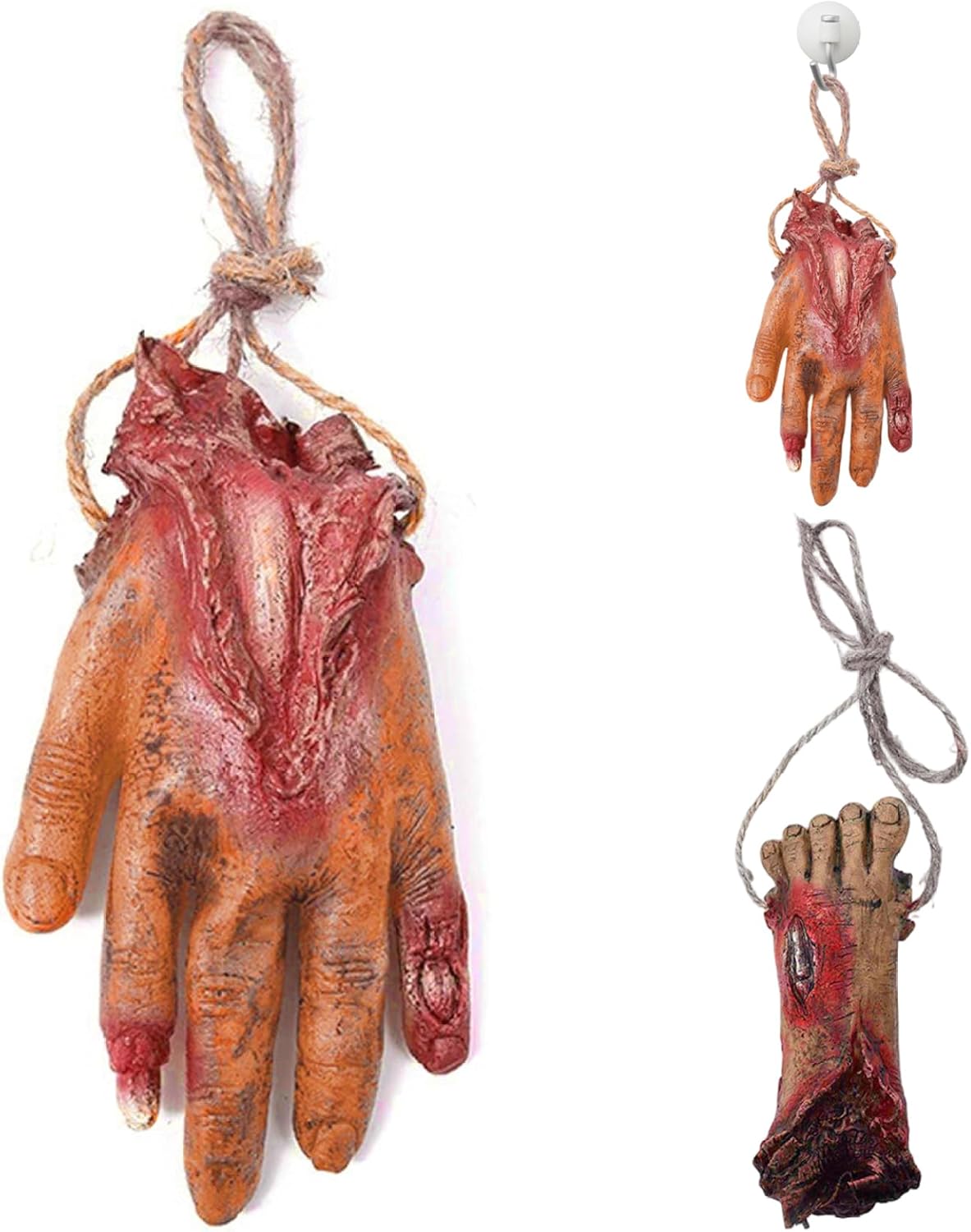 Facile da appendere e accessoriato: con robuste corde di iuta, sia la mano che il piede finti possono essere comodamente appesi ovunque e migliorano le decorazioni spettrali su porte, finestre o angoli infestati con il minimo sforzo. Effetto horror realistico: realizzati in vinile di alta qualità con intricati dettagli sanguinanti, questi oggetti di scena per mani e piedi mozzati forniscono un aspetto fresco e realistico. Decorazioni versatili di Halloween: ideali per vari ambienti spettrali, queste parti del corpo mozzate possono essere combinate con altre mani di Halloween, piedi finti o arti mozzati per creare scene spaventose per case infestate, temi horror o produzioni teatrali. DESIGN COMPATTO E LEGGERO: leggere e facili da maneggiare, queste parti del corpo in vinile non appesantiranno le tue decorazioni facilitando l'installazione e il trasporto pur mantenendo un aspetto inquietante e cruento che impressionerà gli ospiti e i dolcetti o scherzetti. Materiale robusto e riutilizzabile: queste finte parti del corpo sono realizzate in vinile resistente e possono resistere all'usura, permettendoti di usarle come straordinari oggetti di scena di Halloween anno dopo anno senza sbiadire o danneggiarsi.