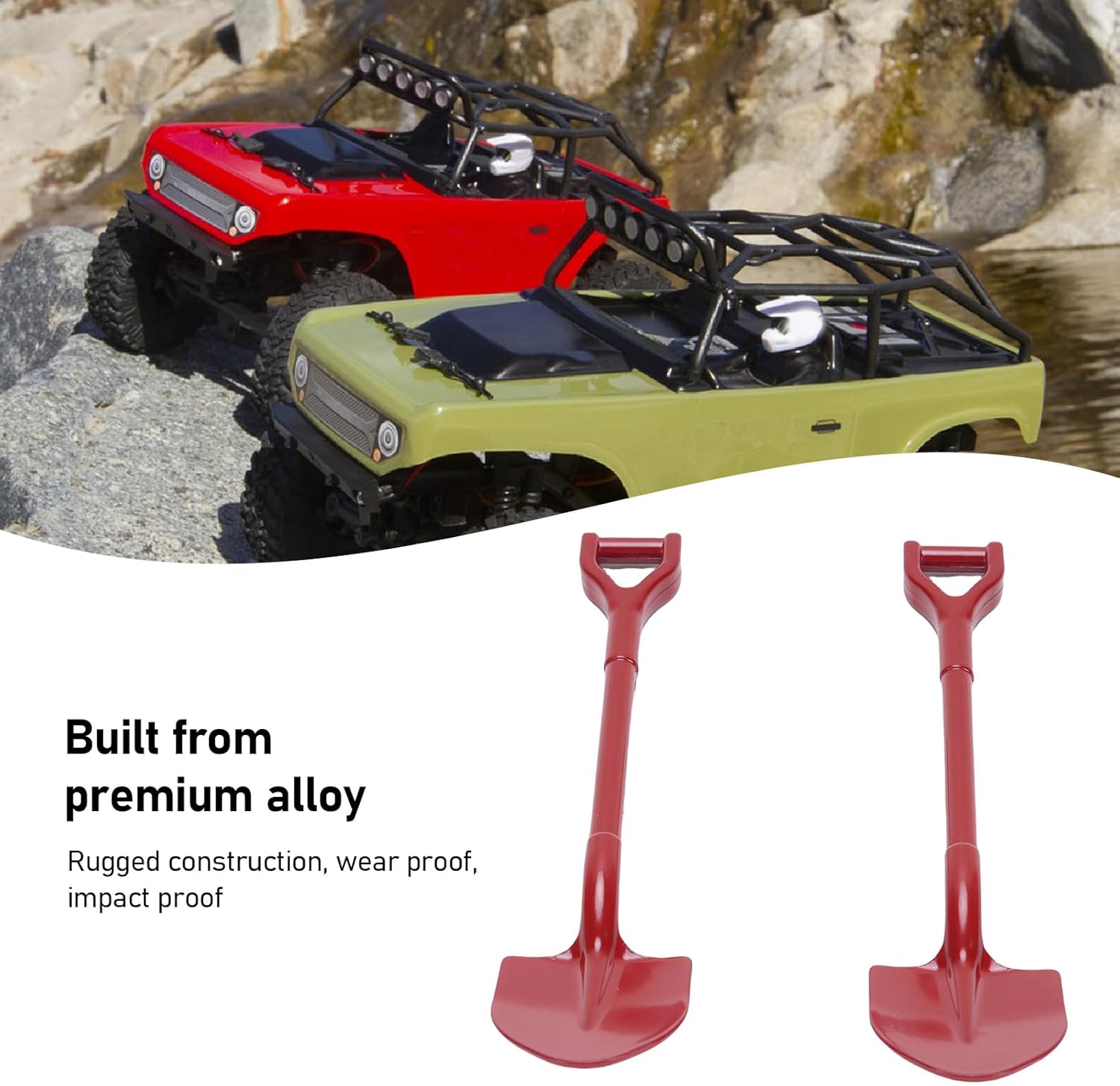 Dettagli di progettazione realistici: gli accessori pala di camion controllati a distanza presentano trame e proporzioni realistiche, replicando accuratamente strumenti esterni di dimensioni standard per migliorare l'aspetto robusto dei veicoli fuoristrada. Costruzione in lega durevole: questi camion di pala fuoristrada controllati a distanza sono realizzati in leghe di metallo premium, garantendo una durata e una prova eccezionali indossare, impatto e ambienti fuoristrada aspiranti. Miglioramento della visualizzazione del tema: questi strumenti per veicoli a telecomando in metallo servono come elementi chiave di scena, adatti alla creazione di scene di fotografia dinamica e display realistici fuoristrada. Facile installazione: queste pale in metallo sono progettate specificamente per veicoli a telecomando 1/10 e possono essere installati in modo sicuro sulla maggior parte del modello di veicoli fuoristrada usando strumenti di base, consentendo modifiche rapide. Contenuto di set multifunzionale: il set di accessori per veicoli a telecomando comprende due pale in lega abbinata, consentendo opzioni di installazione simmetrica o backup, compatibili con la maggior parte dei veicoli fuoristrada controllati remoto.