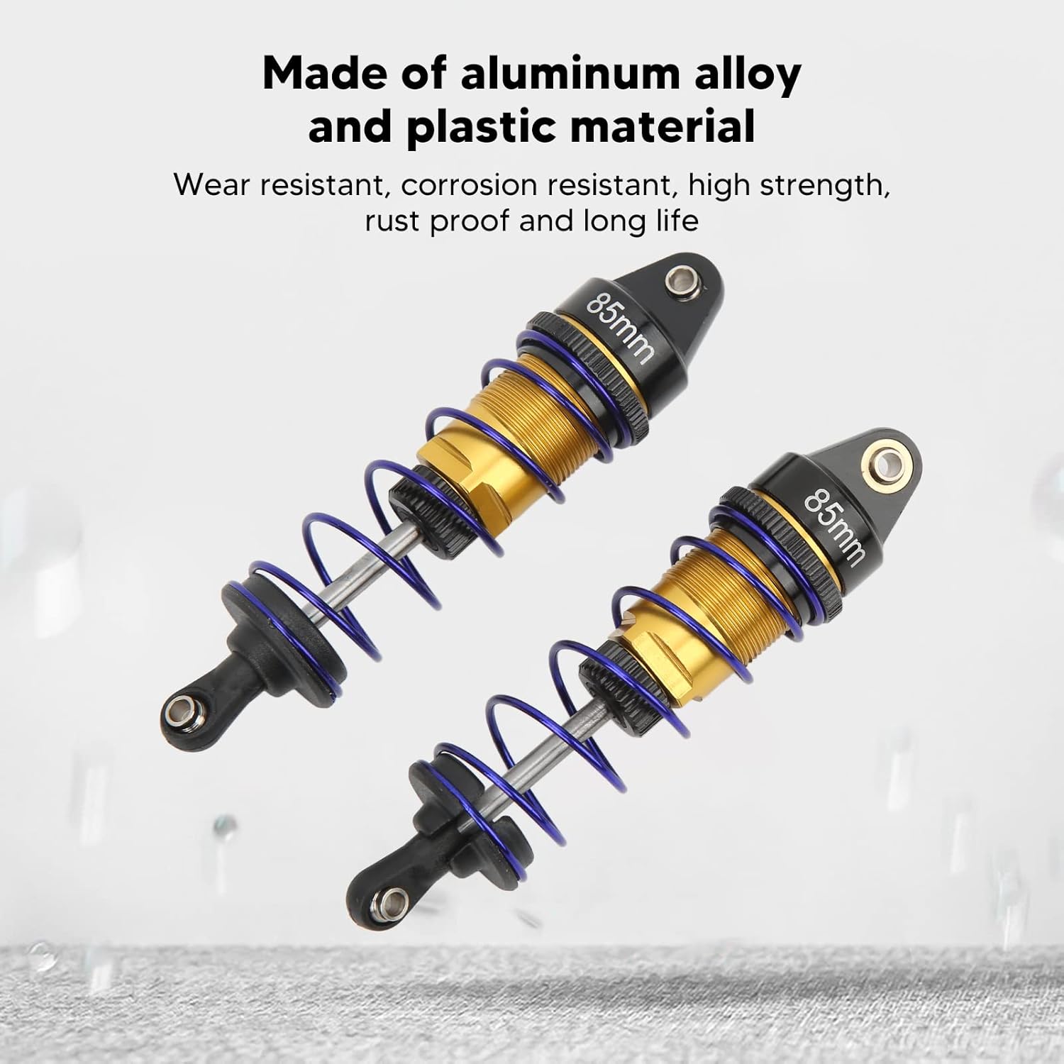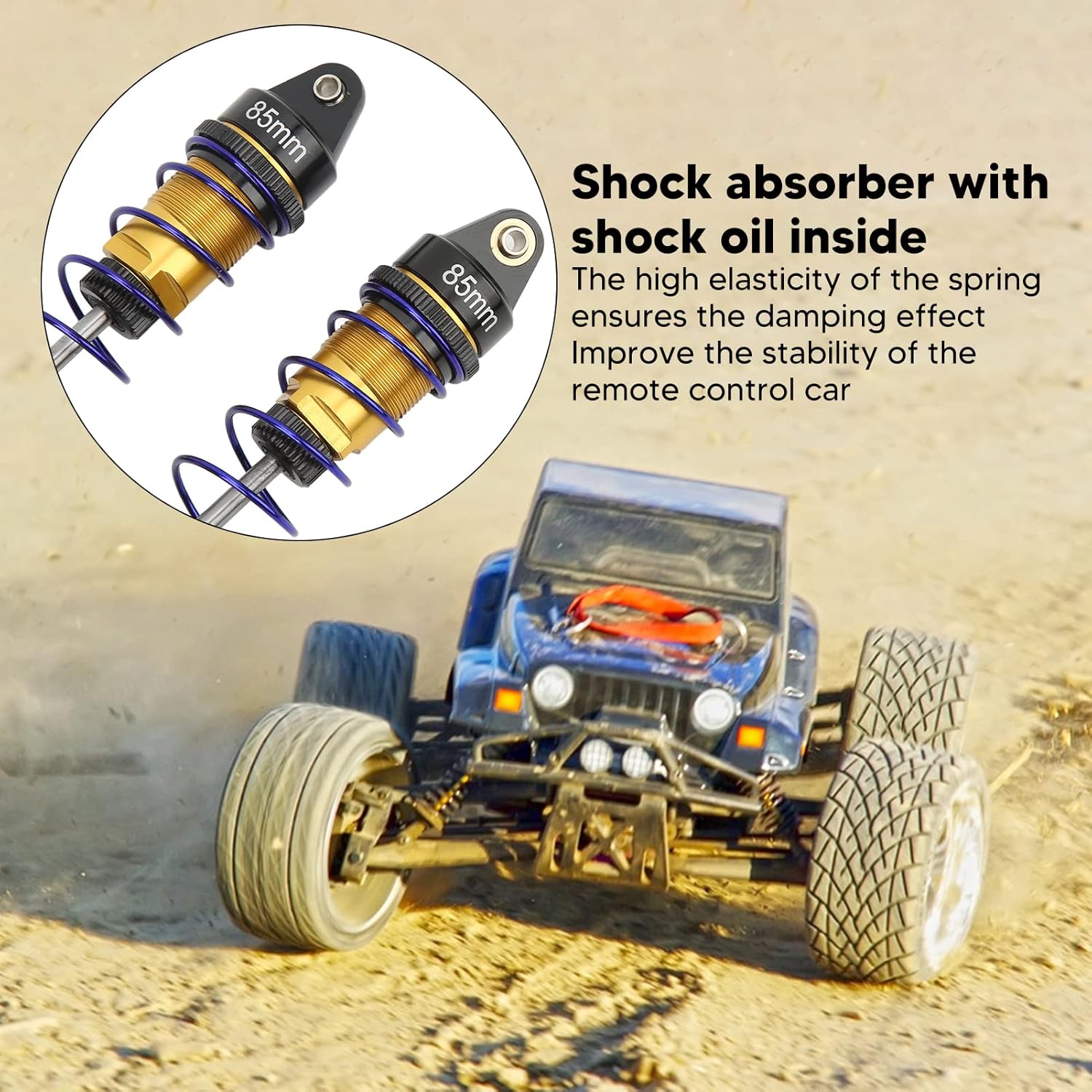Costruzione robusta: realizzati in lega di alluminio di alta qualità e rinforzati con componenti in plastica, i nostri ammortizzatori RC offrono una resistenza all'usura superiore. I materiali antiruggine garantiscono prestazioni di lunga durata, rendendoli una scelta affidabile per gli aggiornamenti delle tue auto RC. Stabilità migliorata: progettati per fornire un'esperienza di guida stabile, i nostri ammortizzatori regolabili per auto RC riducono efficacemente le vibrazioni e gli urti causati da terreni irregolari. Ciò si traduce in un funzionamento più fluido e un migliore controllo durante le tue avventure di corse RC. Lavorazione CNC: i nostri ammortizzatori vantano corpi filettati lavorati a CNC, che consentono la regolazione fine della pressione dell'olio. La funzione di precarico regolabile garantisce un setup personalizzato per varie condizioni di guida, dandoti il vantaggio di cui hai bisogno in pista. Facile installazione e sostituzione: grazie all'eccellente fattura, i nostri ammortizzatori RC sono facili da installare e rimuovere. Sono progettati per sostituire direttamente le parti dell'ammortizzatore vecchie o danneggiate, rendendo la manutenzione e gli aggiornamenti un processo semplice. Smorzamento ad alte prestazioni: riempiti con olio ammortizzante specializzato e dotati di molle ad alta elasticità, i nostri ammortizzatori RC offrono effetti di smorzamento eccezionali. Ciò migliora la stabilità della tua auto RC, garantendo prestazioni costanti anche sui percorsi più impegnativi.