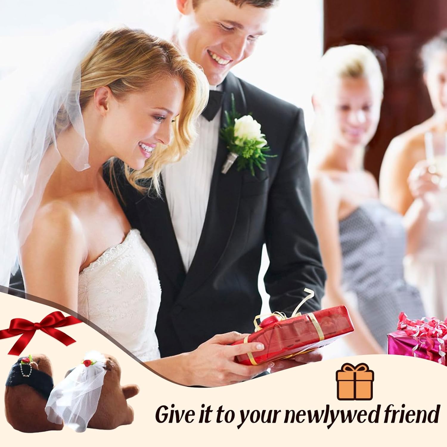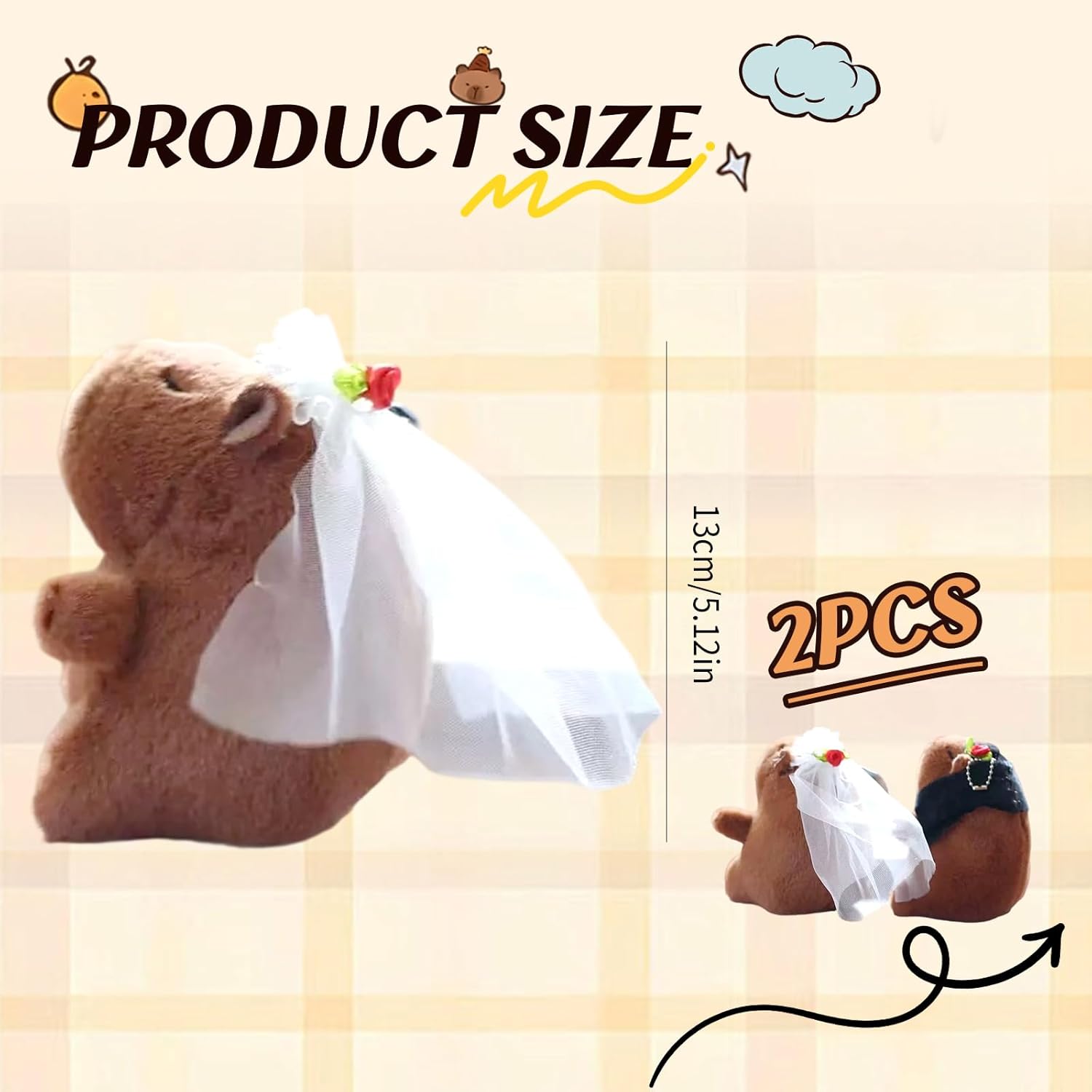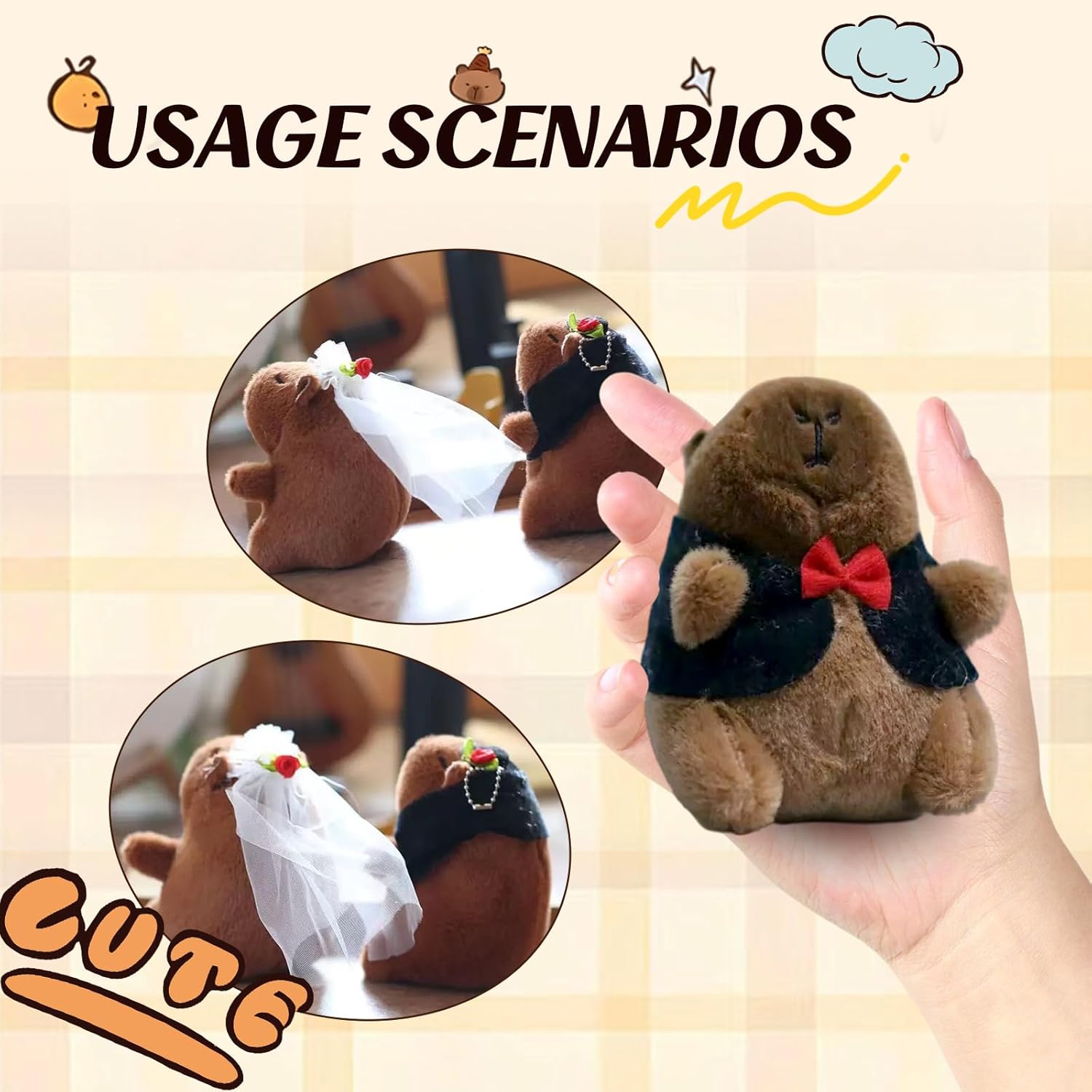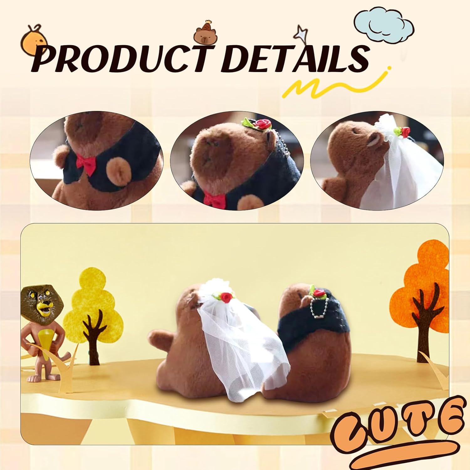 Matrimonio perfetto: una graziosa coppia di capibara in gomma, l'accessorio perfetto per le nozze, che crea un'atmosfera dolce e gioiosa. Squisita fattura: a differenza di altri design semplici, questa coppia di capibara può essere abbinata a un abito da sposa o a un tailleur, rendendola ancora più adorabile. Regalo perfetto: due coppie di capibara sono il regalo di nozze perfetto, che esprime i desideri più sinceri. Giocattolo decorativo: perfetto per balconi, armadi, camere da letto, bagni e altro ancora. Giocoso e innocente: l'adorabile design del capibara conferisce al giocattolo un fascino infantile, aggiungendo divertimento.